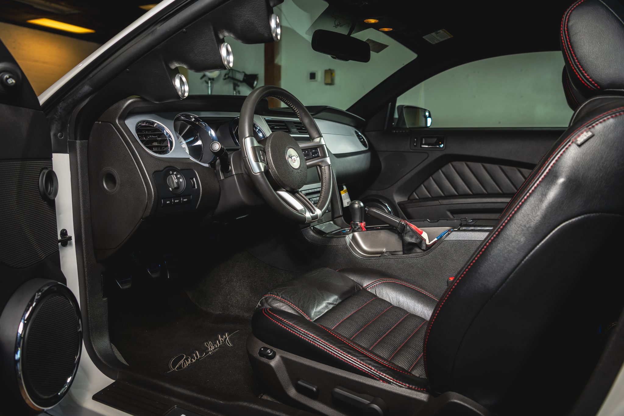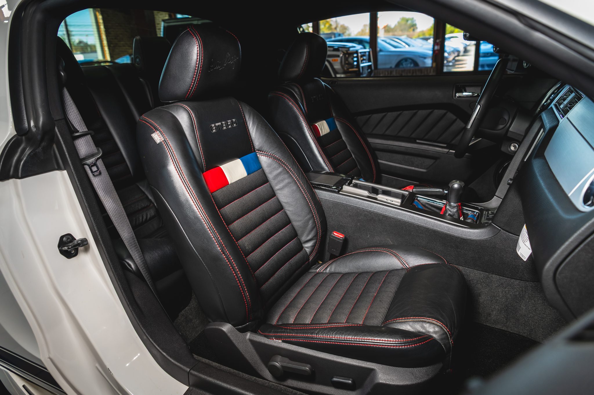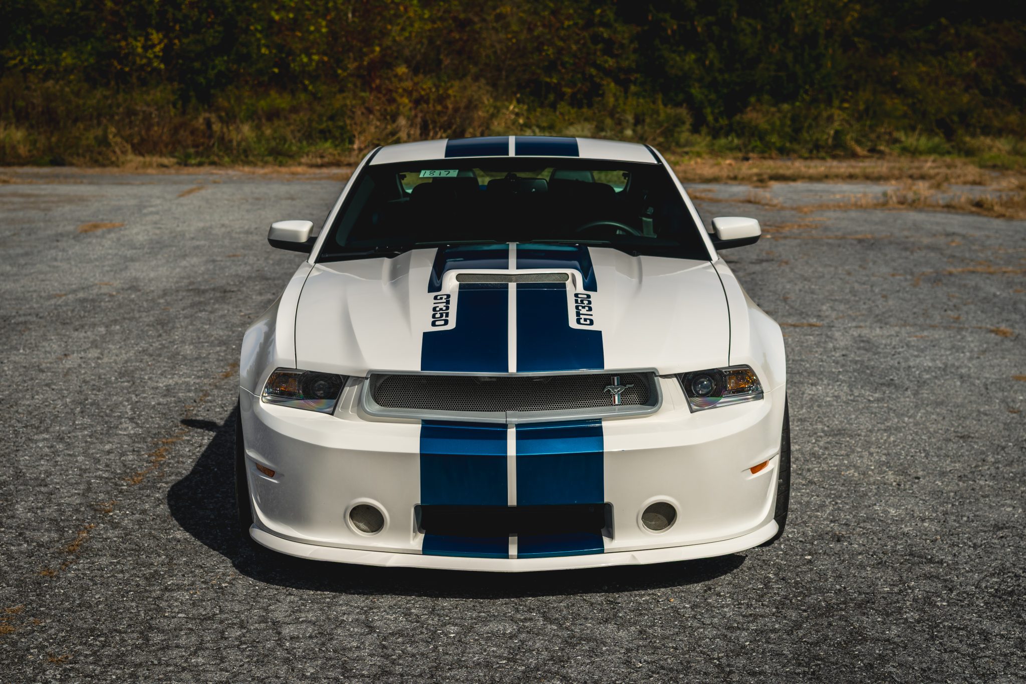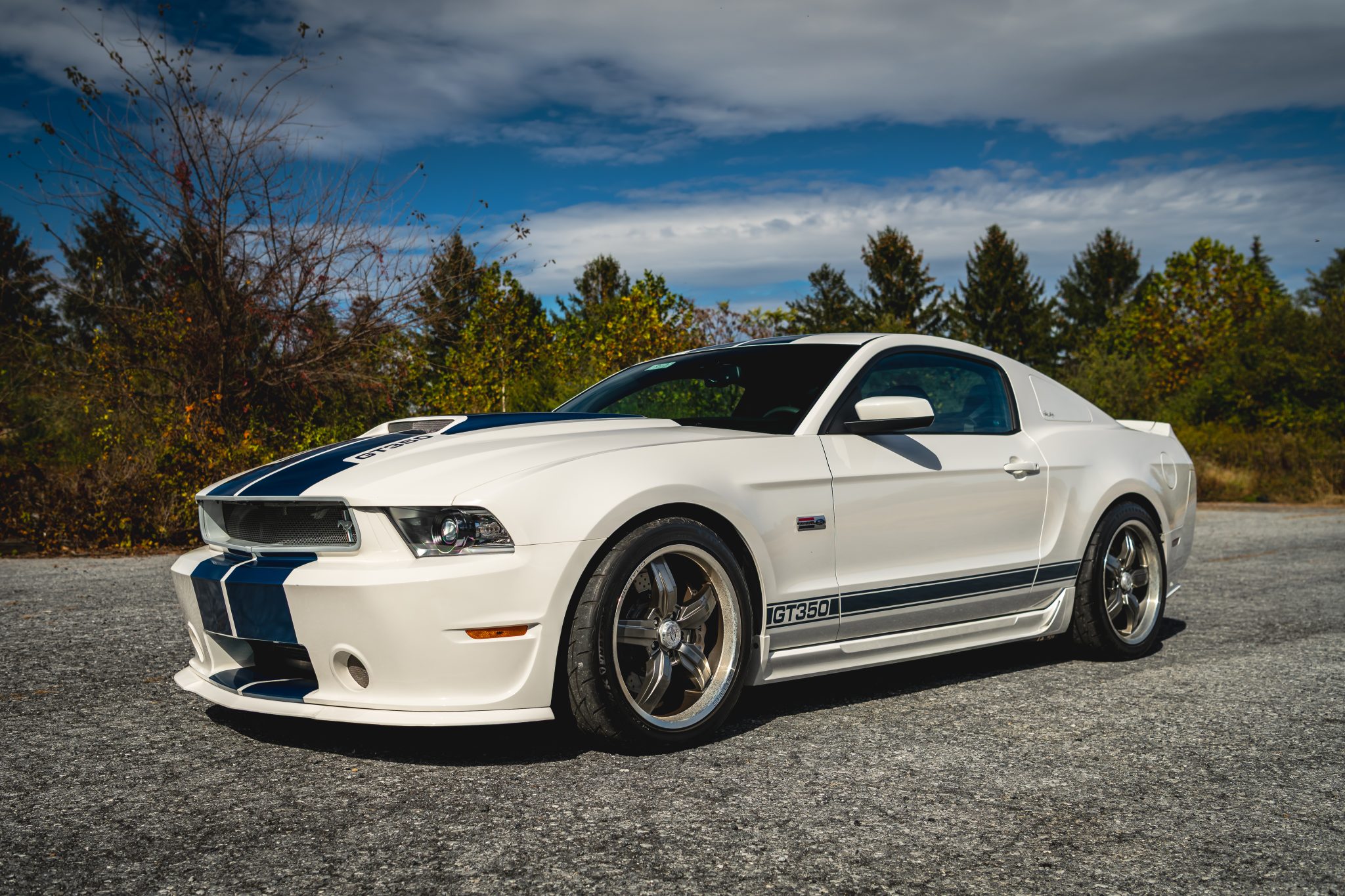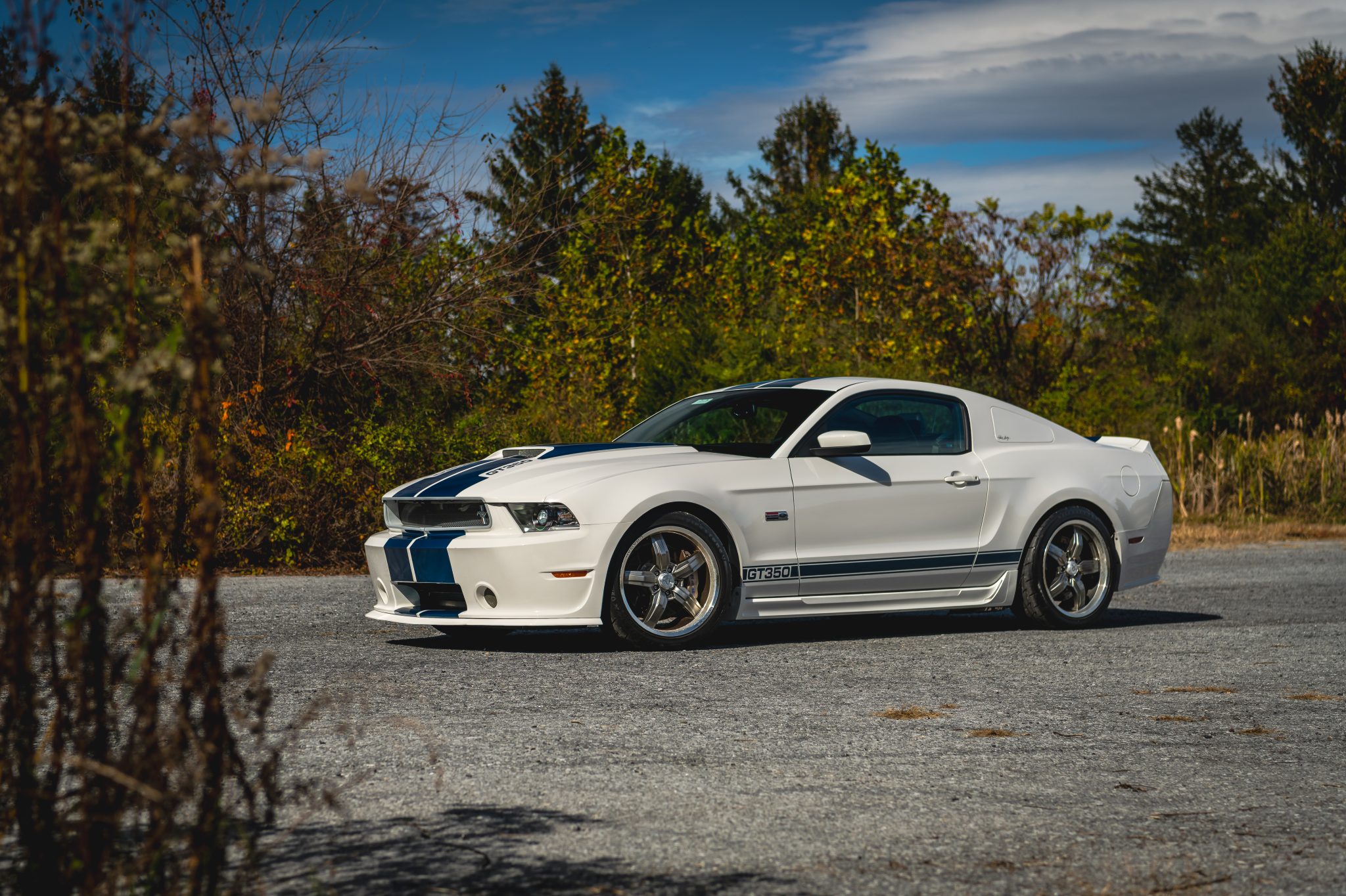This 2011 Ford Mustang GT Premium coupe was modified with Shelby GT350 package, which involved fitting the 5.0-liter V8 with a Whipple supercharger and a Borla exhaust system as well as installing a performance-tuned suspension, front caster-camber plates, six-piston front brake calipers, brake cooling ducts, revised bodywork, and more as described below. Now indicating 5k miles, the car is finished in Performance White with Guardsman Blue stripes. It also features a six-speed manual transmission, a limited-slip differential, HID headlights, sequential LED taillights, Cragar 19″ wheels, dual-zone automatic climate control, cruise control, a Shelby-Kicker premium sound system, a touchscreen infotainment system with navigation, and an optional Shelby custom interior upgrade package.