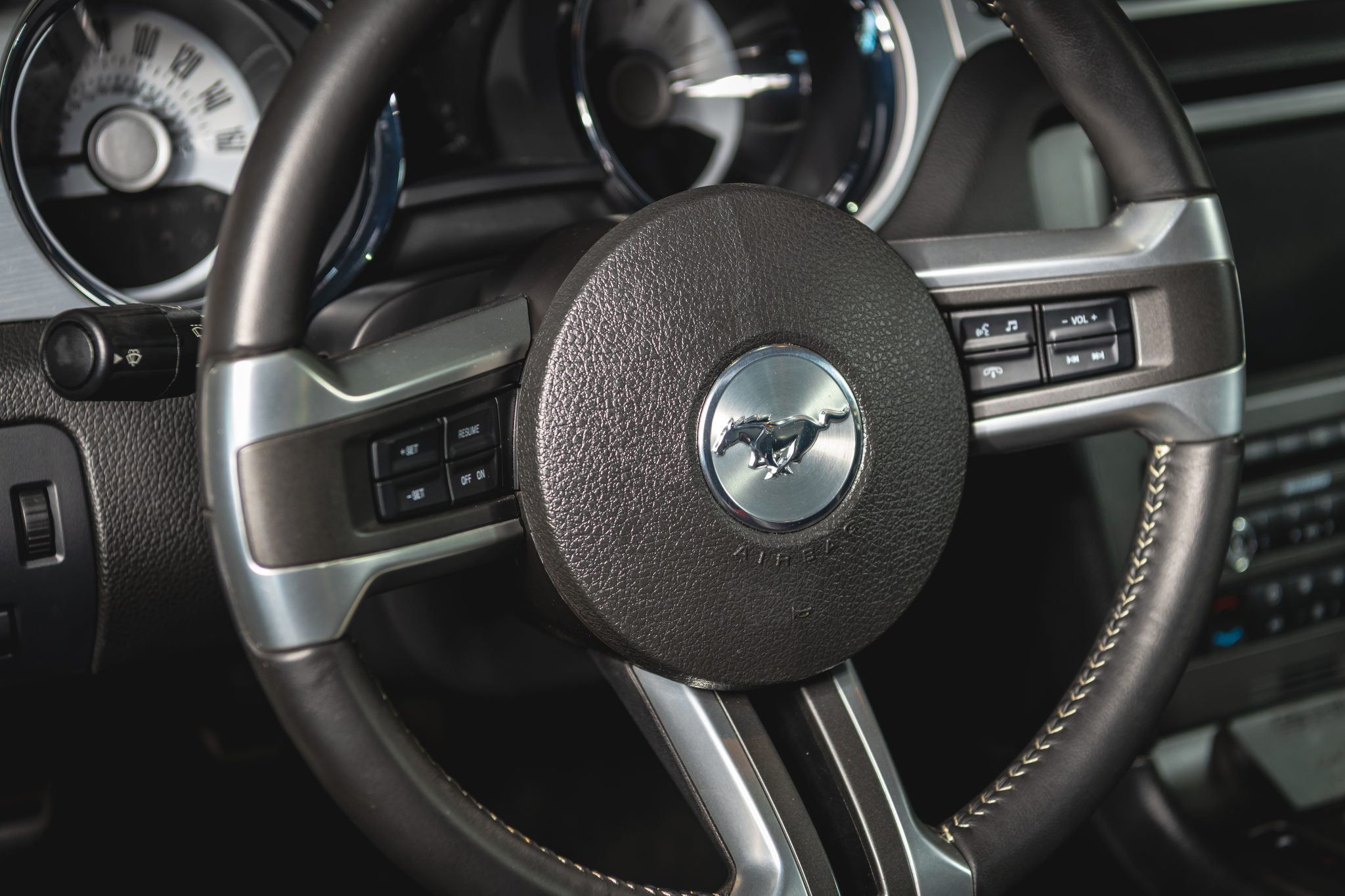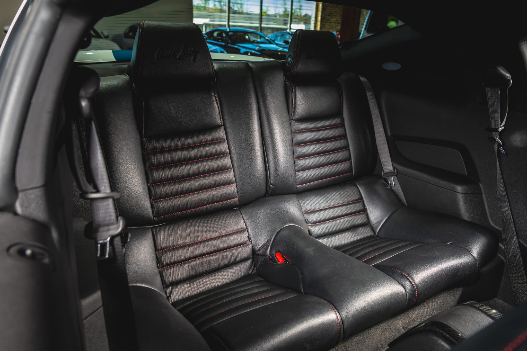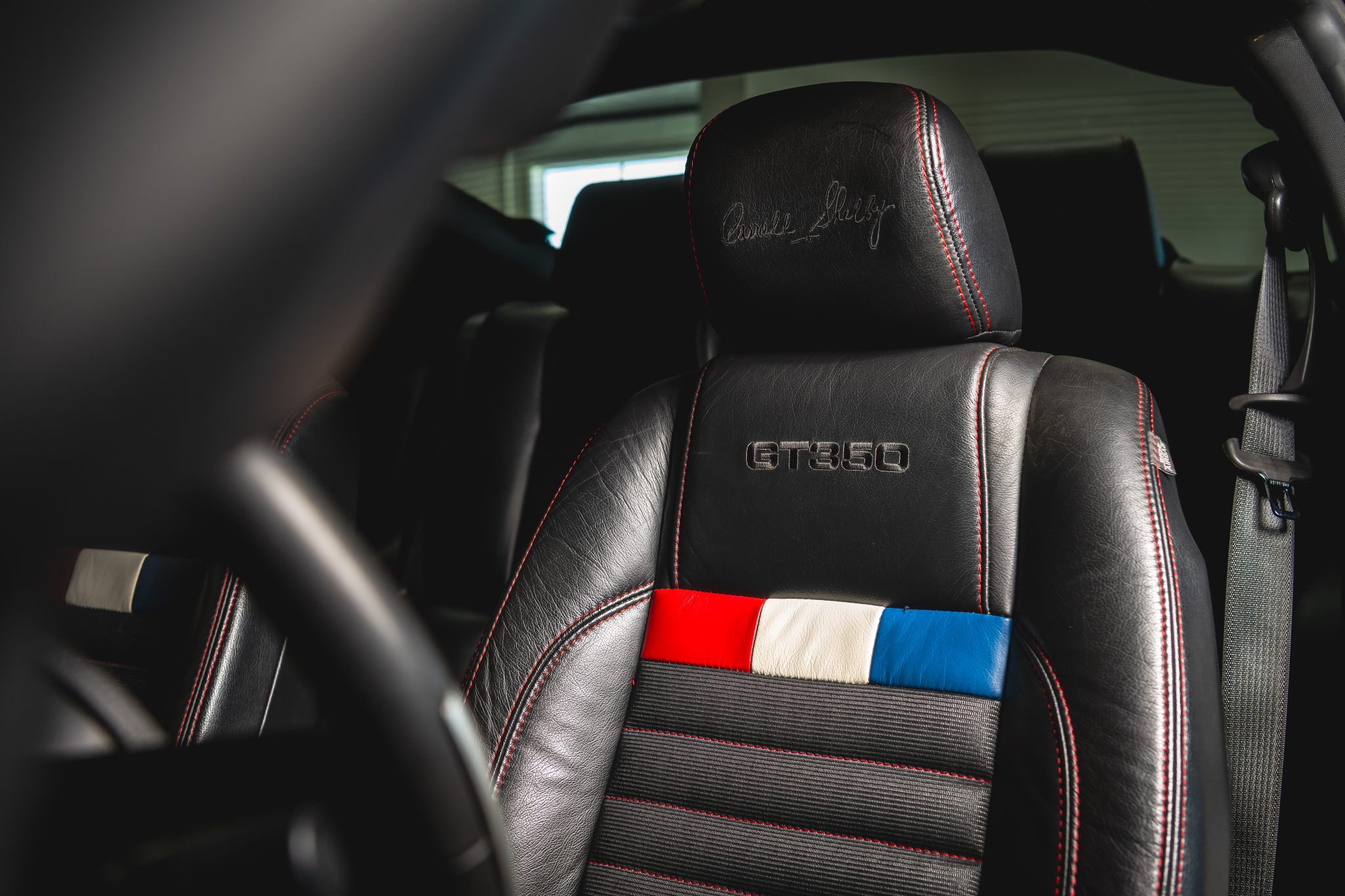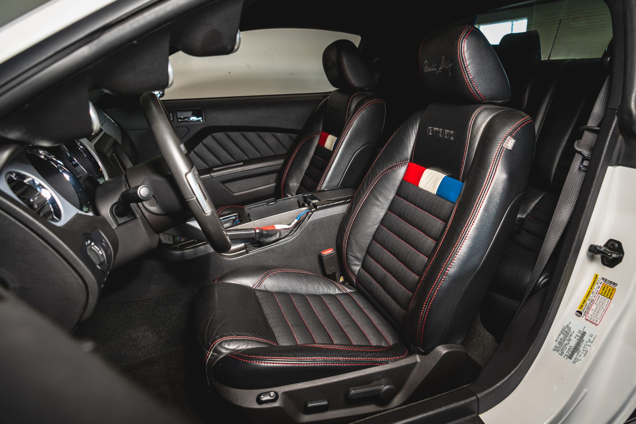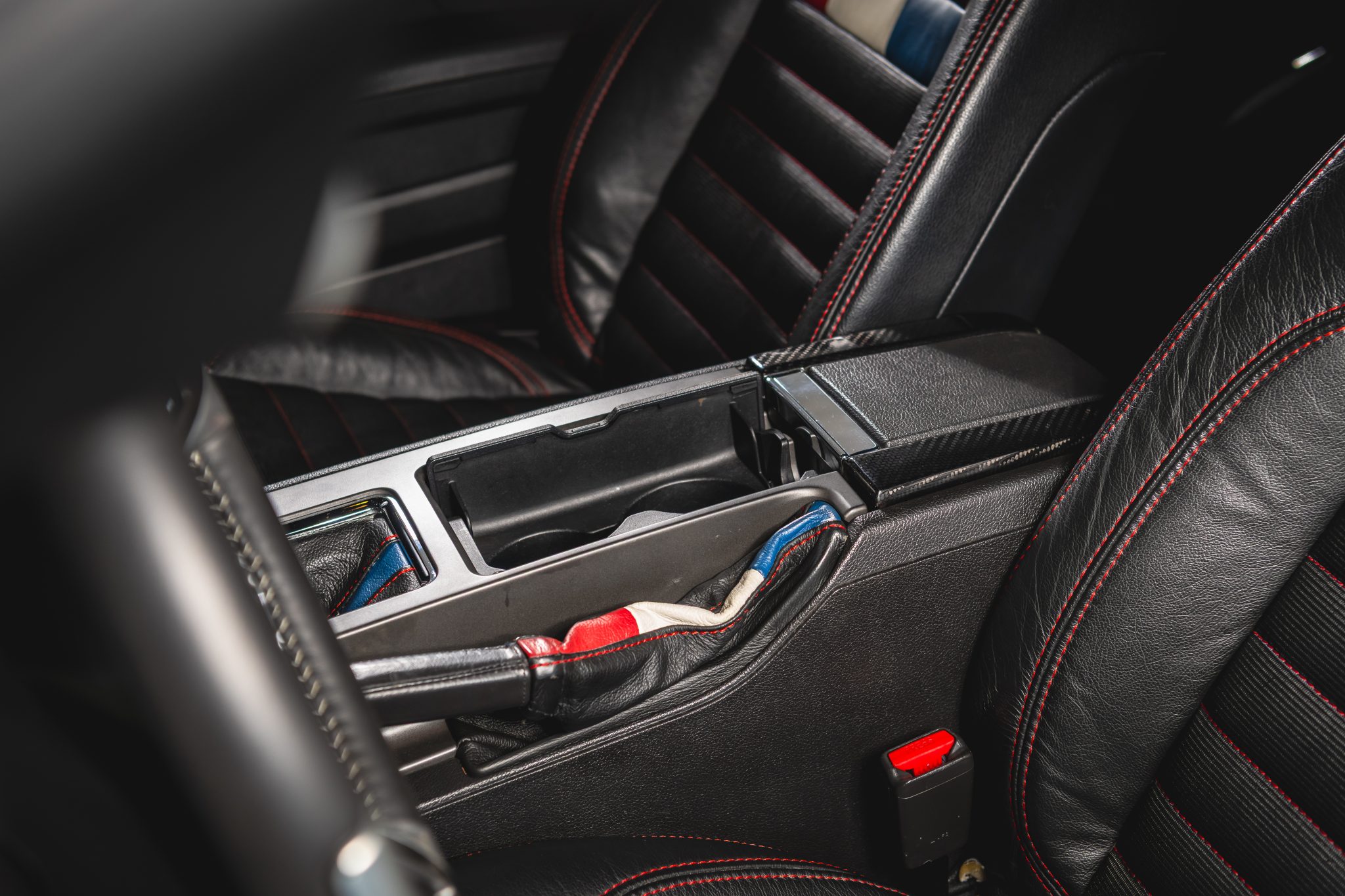 This 2011 Ford Mustang GT Premium coupe was modified with Shelby GT350 package, which involved fitting the 5.0-liter V8 with a Whipple supercharger and a Borla exhaust system as well as installing a performance-tuned suspension, front caster-camber plates, six-piston front brake calipers, brake cooling ducts, revised bodywork, and more as described below. Now indicating 5k miles, the car is finished in Performance White with Guardsman Blue stripes. It also features a six-speed manual transmission, a limited-slip differential, HID headlights, sequential LED taillights, Cragar 19″ wheels, dual-zone automatic climate control, cruise control, a Shelby-Kicker premium sound system, a touchscreen infotainment system with navigation, and an optional Shelby custom interior upgrade package.