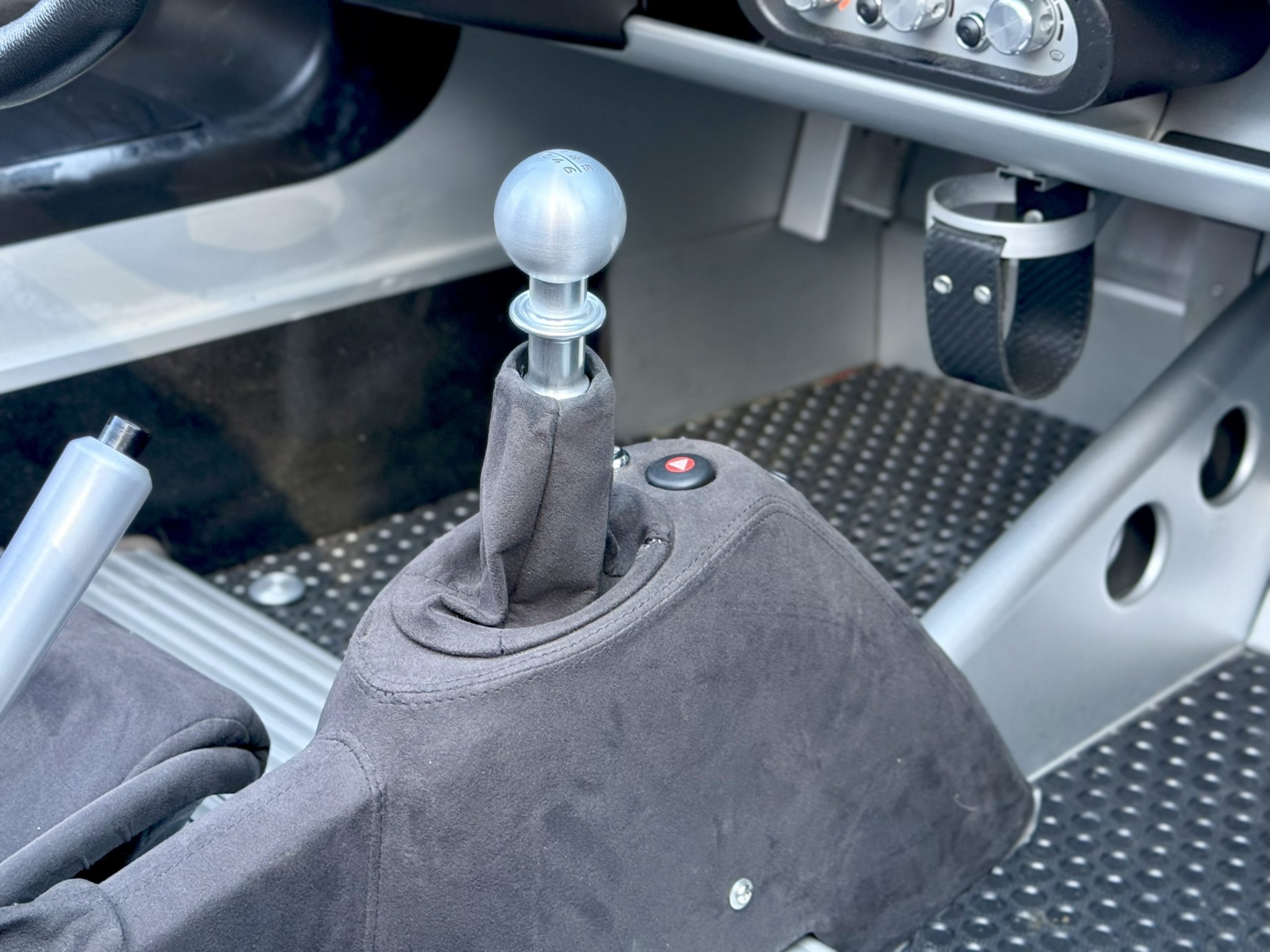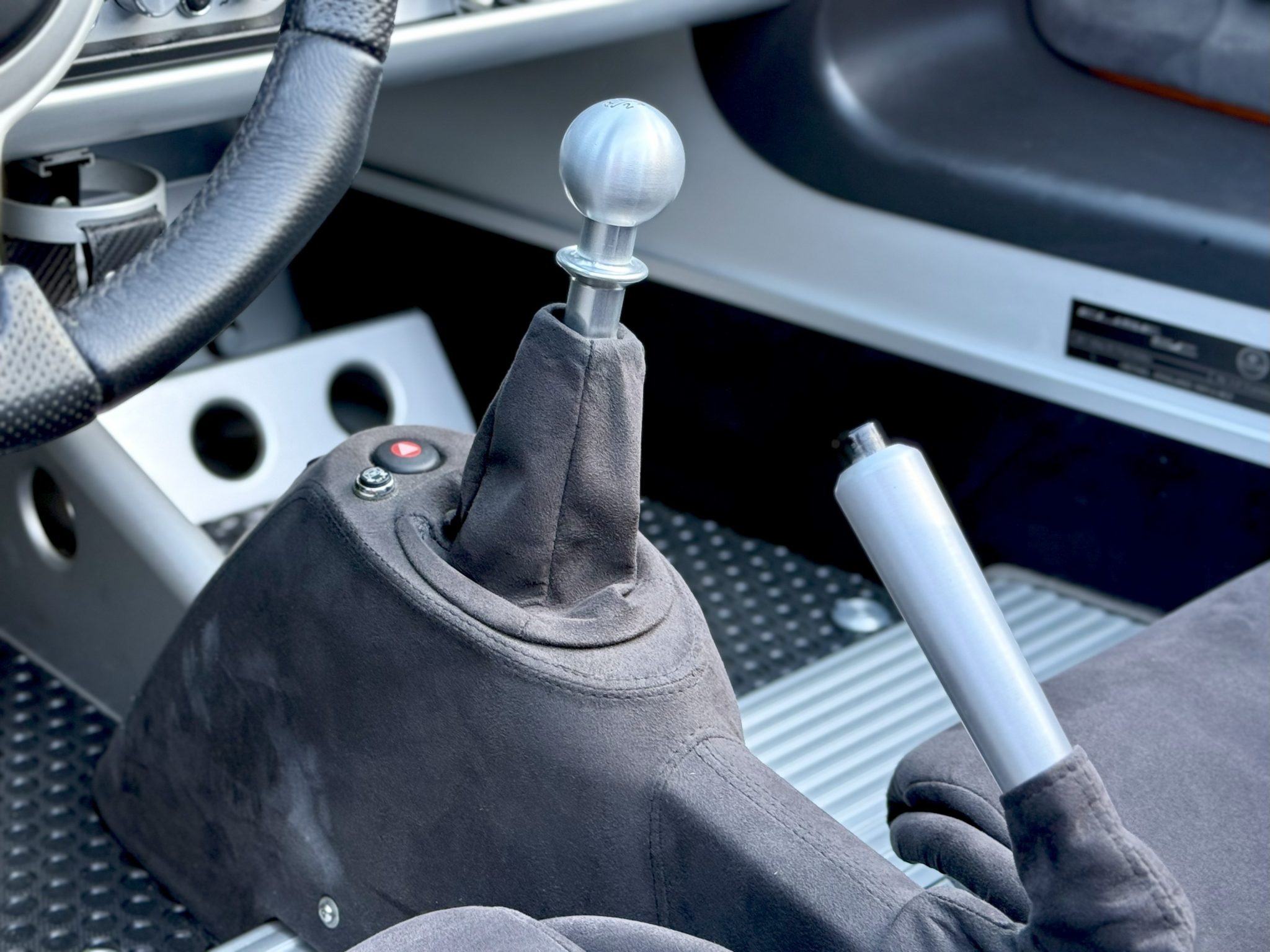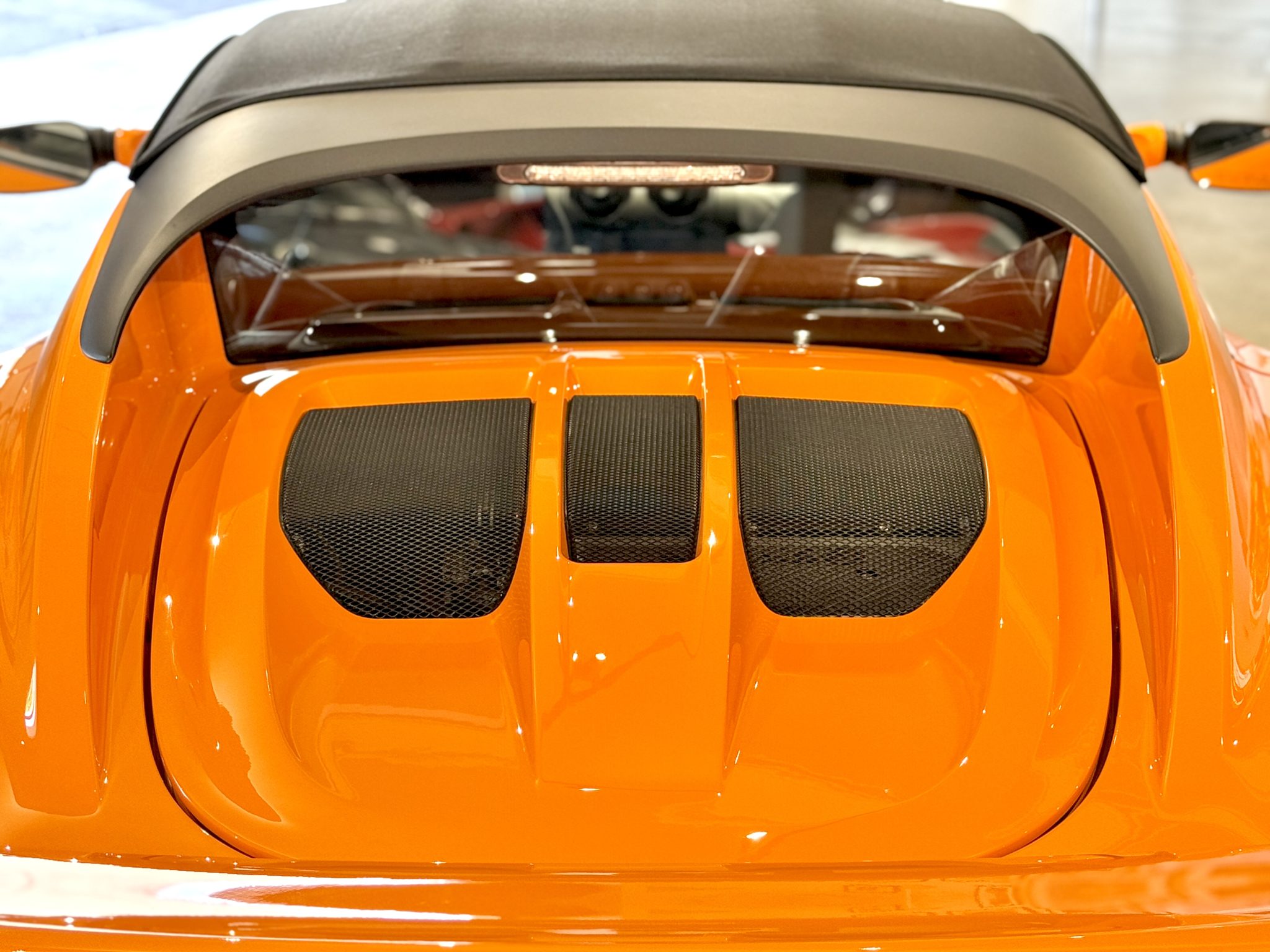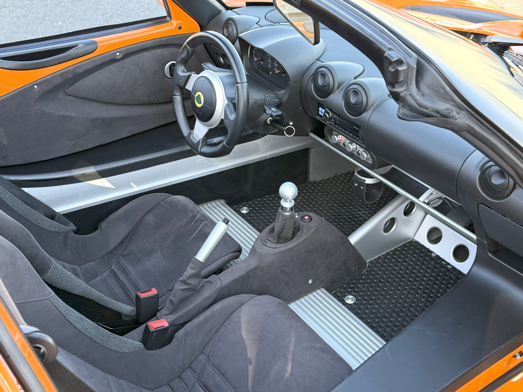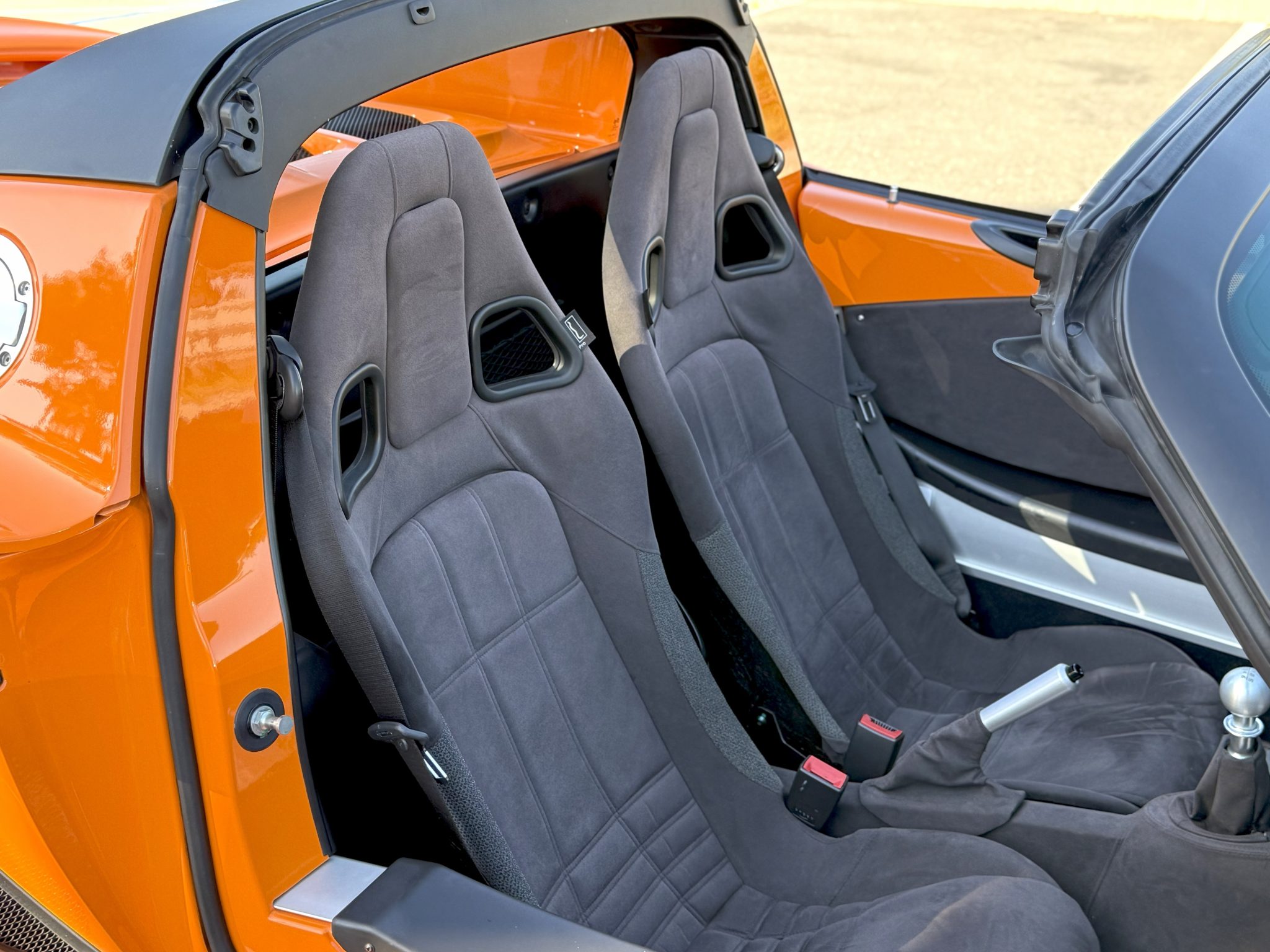 The car is finished in Chrome Orange over a Black interior and is powered by a supercharged 1.8-liter inline-four paired with a six-speed manual transaxle. Equipment includes a matte black roof panel and 16″ and 17″ five-spoke wheels as well as a black removable soft top, a limited-slip differential, and traction control.