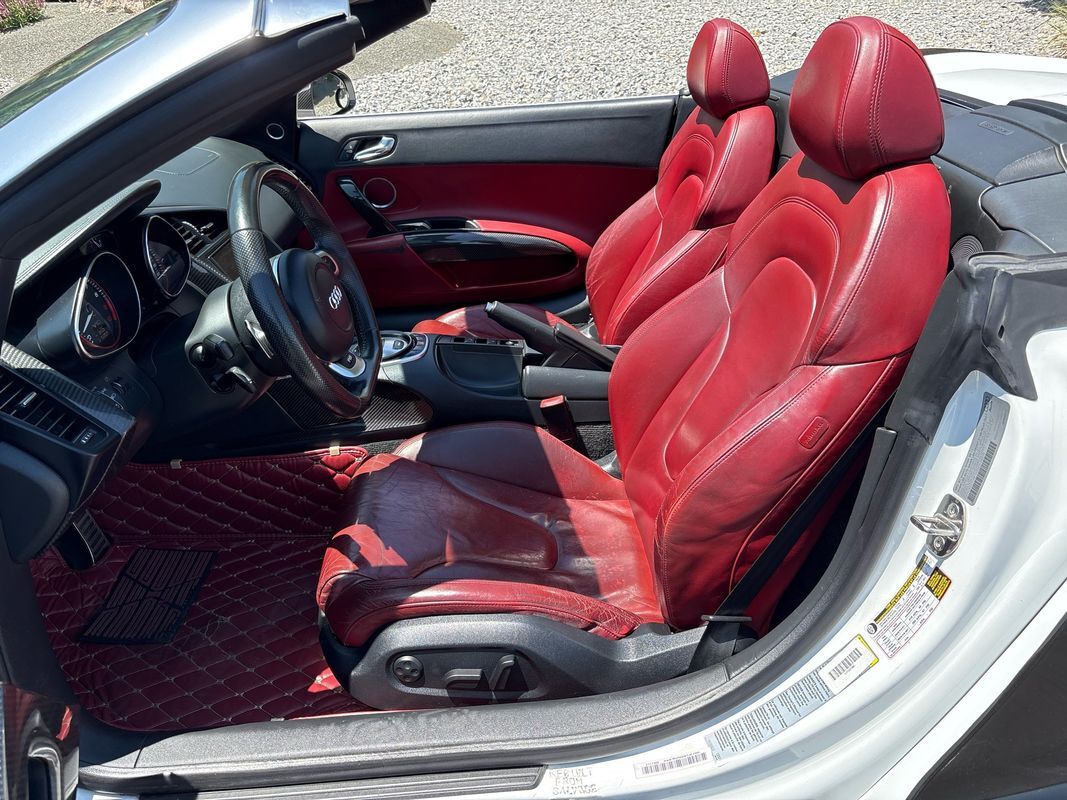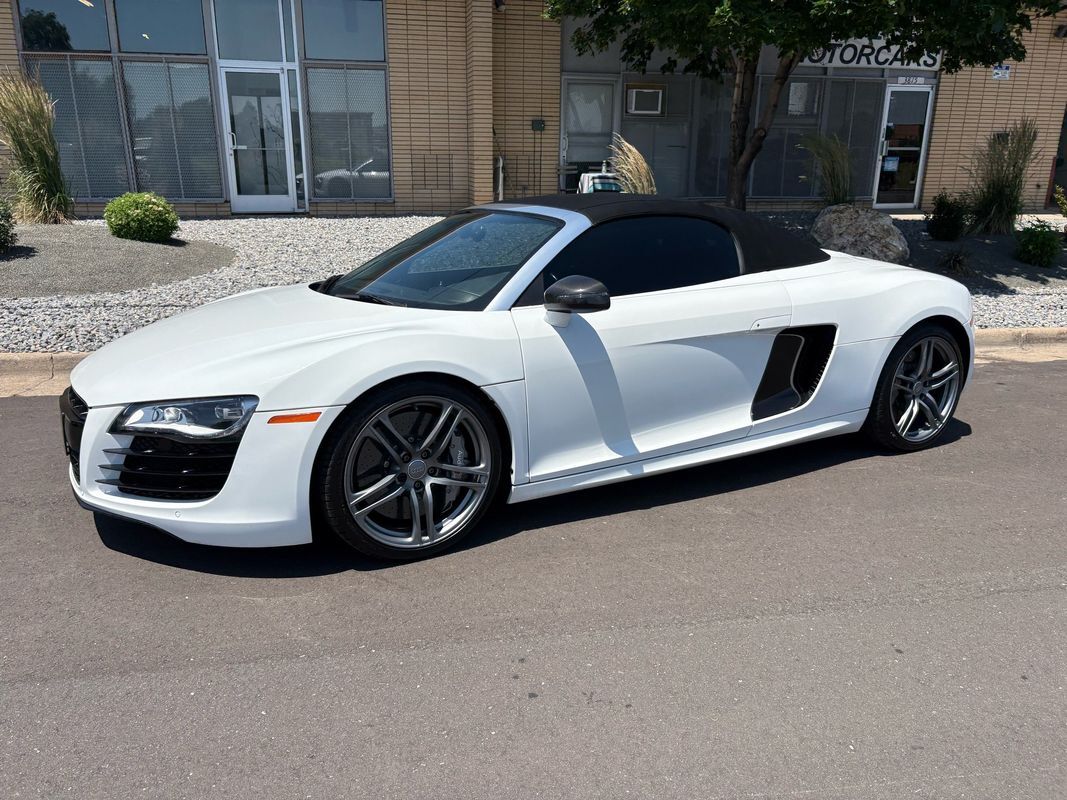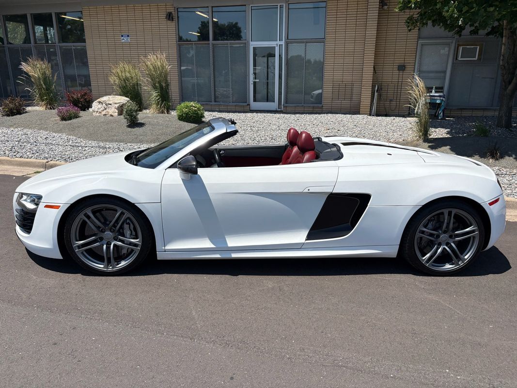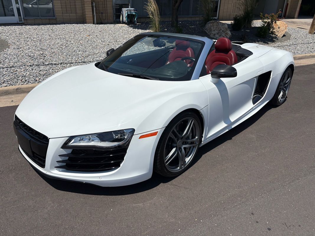 2012 Audi R8 spyder done in White over Red leather. Has the 5.2L V10 that put out 525HP with the R-tronic transmission and all wheel drive.