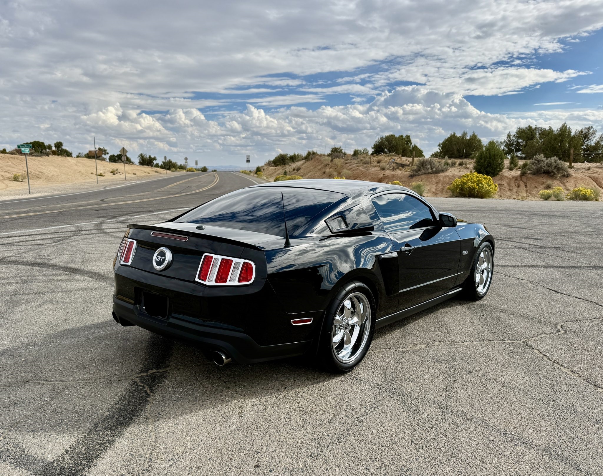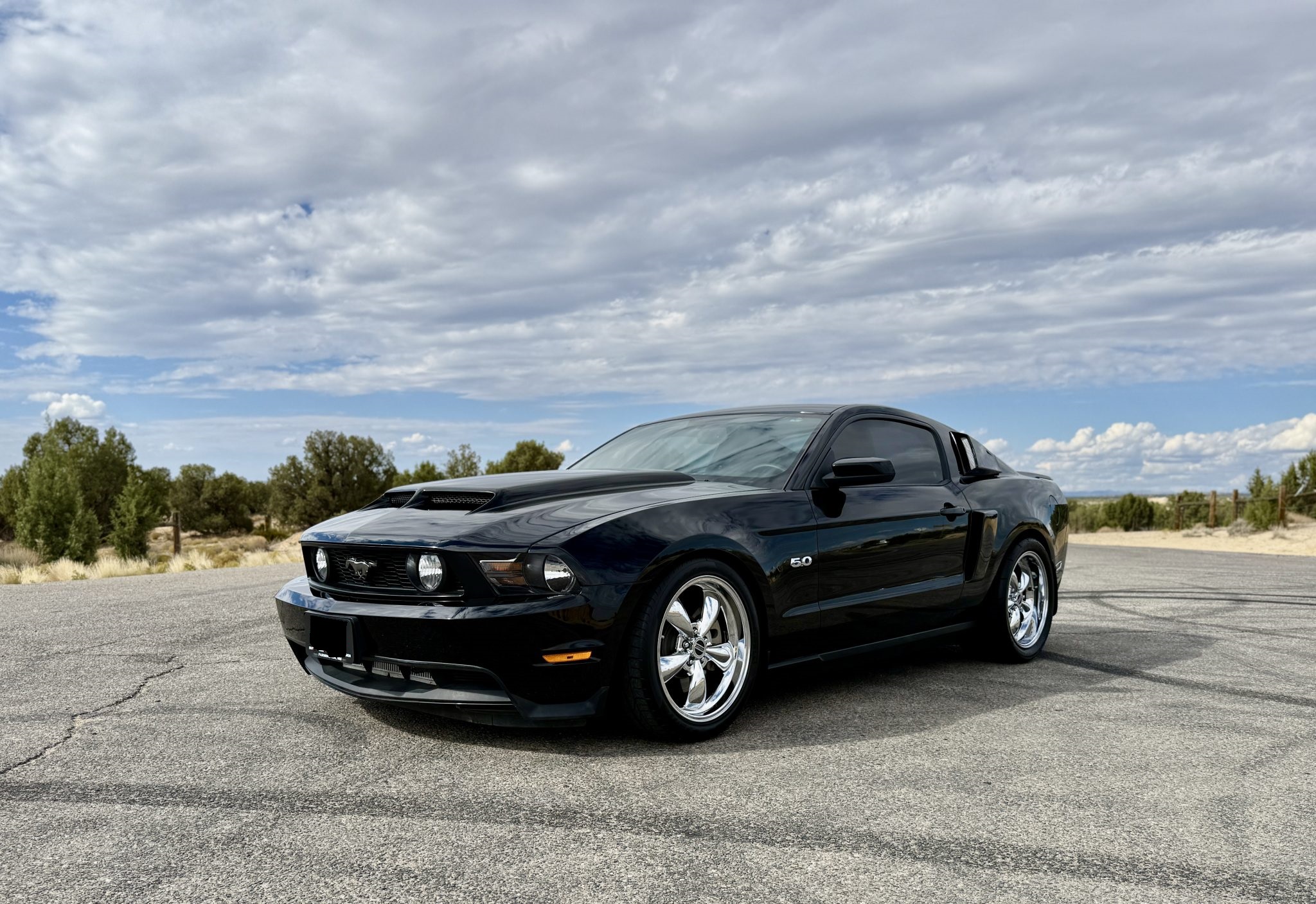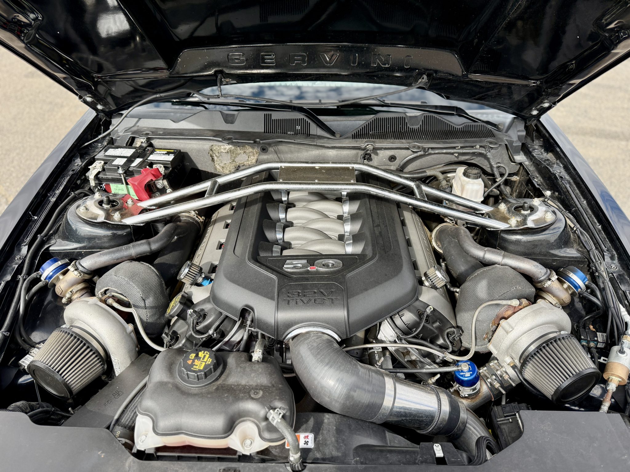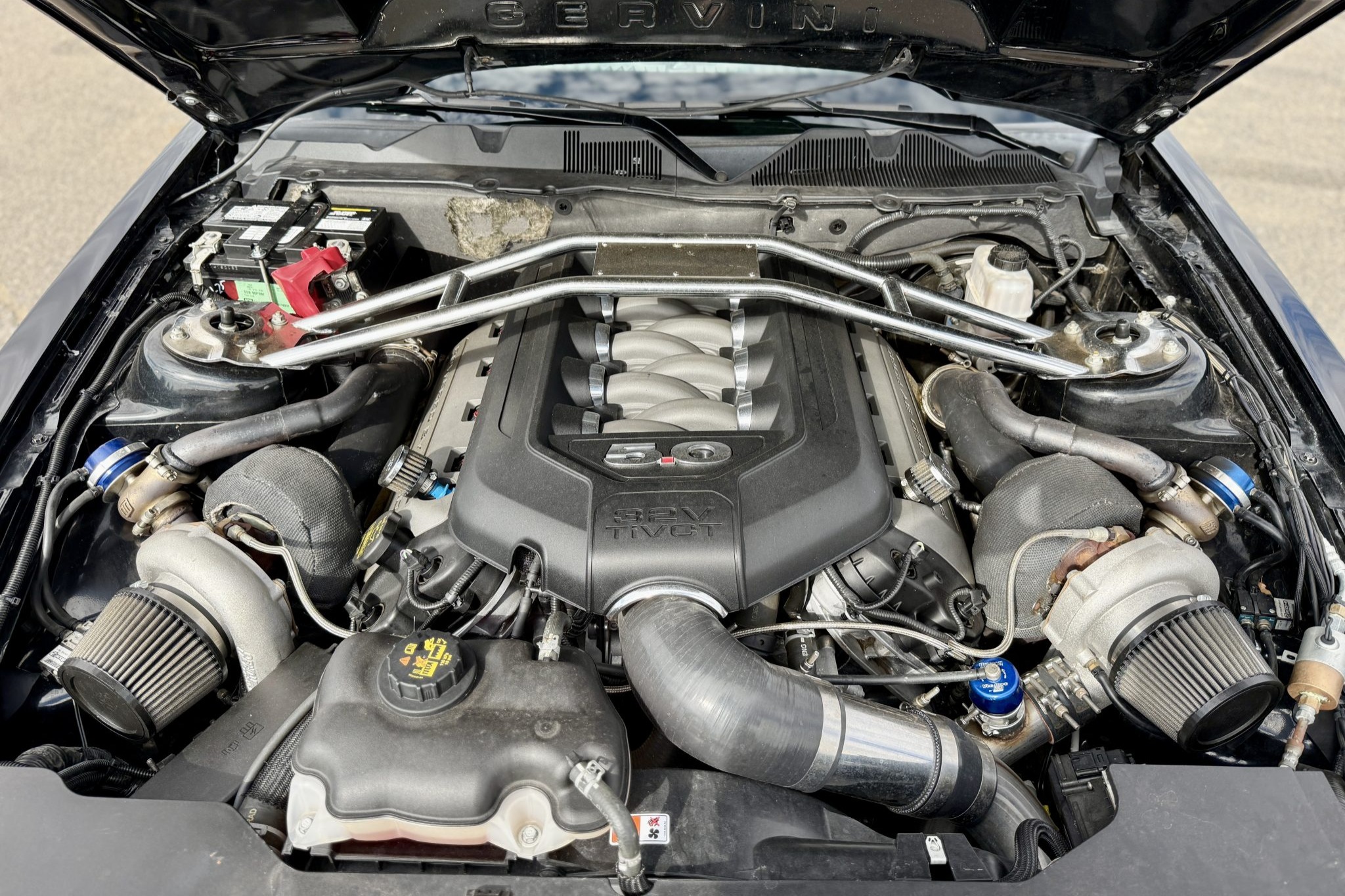 This 2012 Ford Mustang Premium GT coupe has 16k miles  and was modified with the installation of twin 62mm Hellion turbochargers, dual 44mm Turbosmart wastegates, Injector Dynamics 1,050cc fuel injectors, and a custom exhaust system. Power comes from a 5.0-liter Coyote V8 linked to a Tremec T56 Magnum XL six-speed manual transmission, a DynoTech driveshaft, and a limited-slip differential, and the car is finished in black over black upholstery. It rides on 19″ American Muscle wheels and is further equipped with Strange Engineering front struts, Viking rear shocks, a BMR Suspension K-member and control arms, a Cervini’s hood, air conditioning, heated front seats, and a Shaker 500 audio system.
