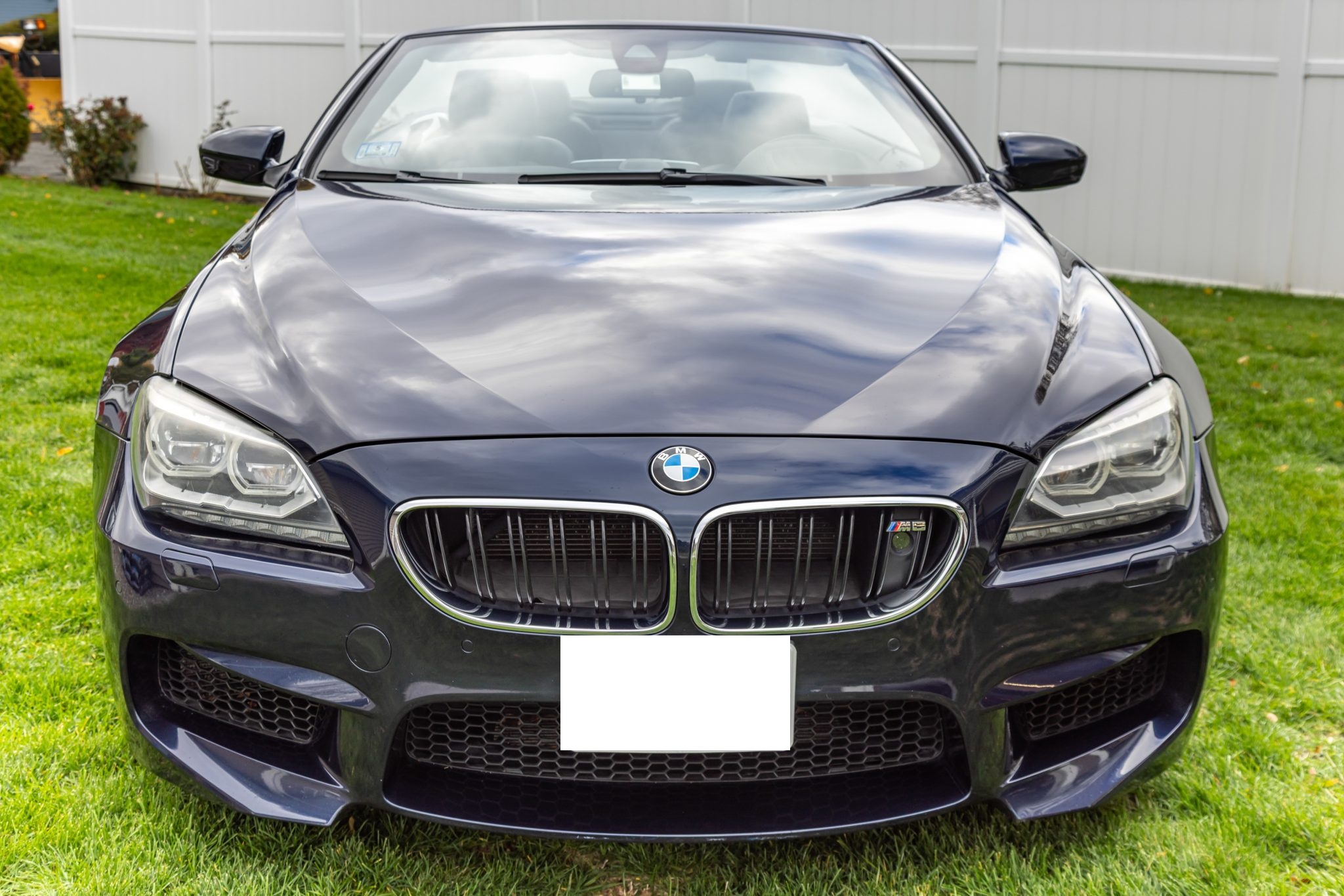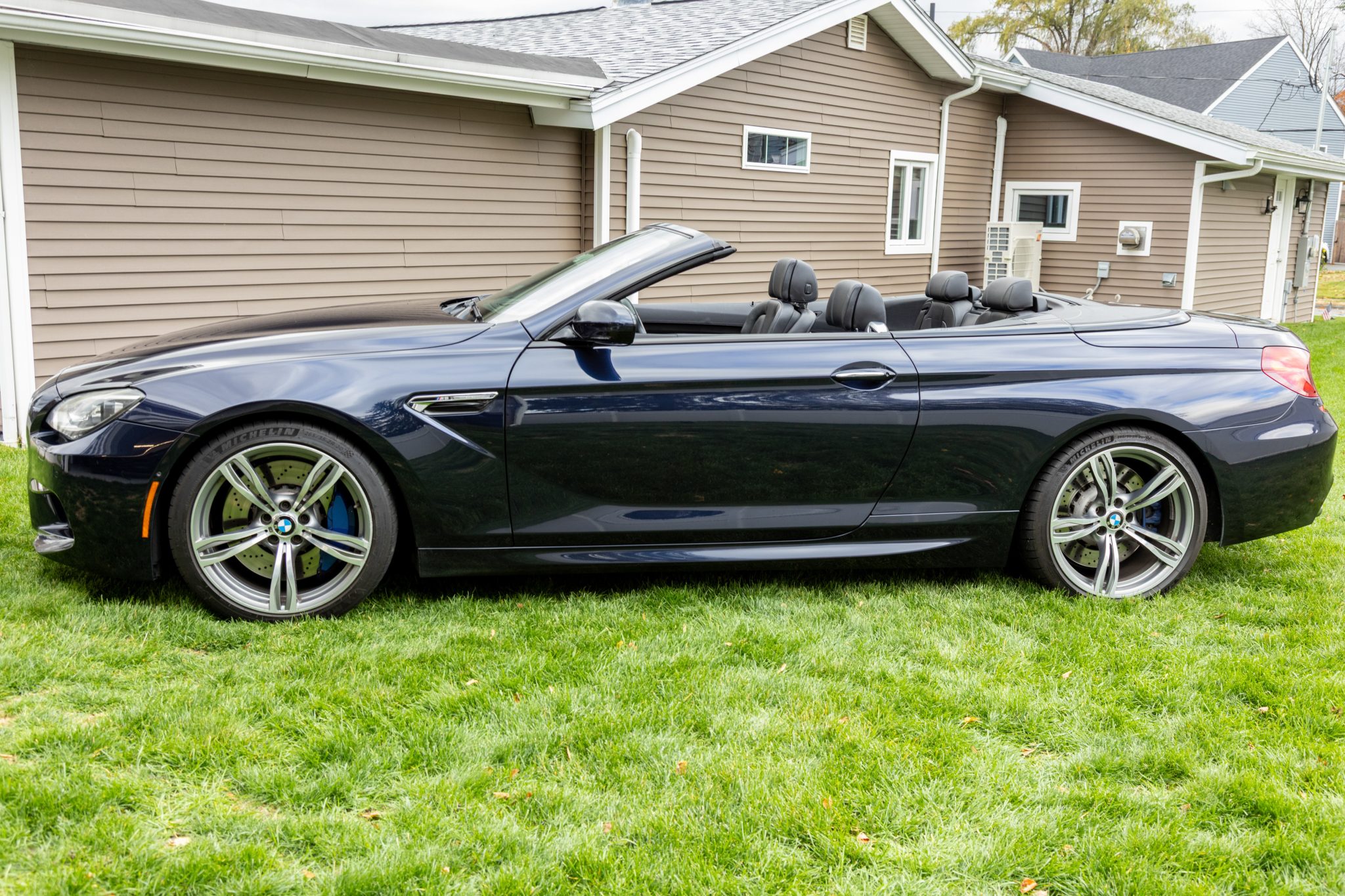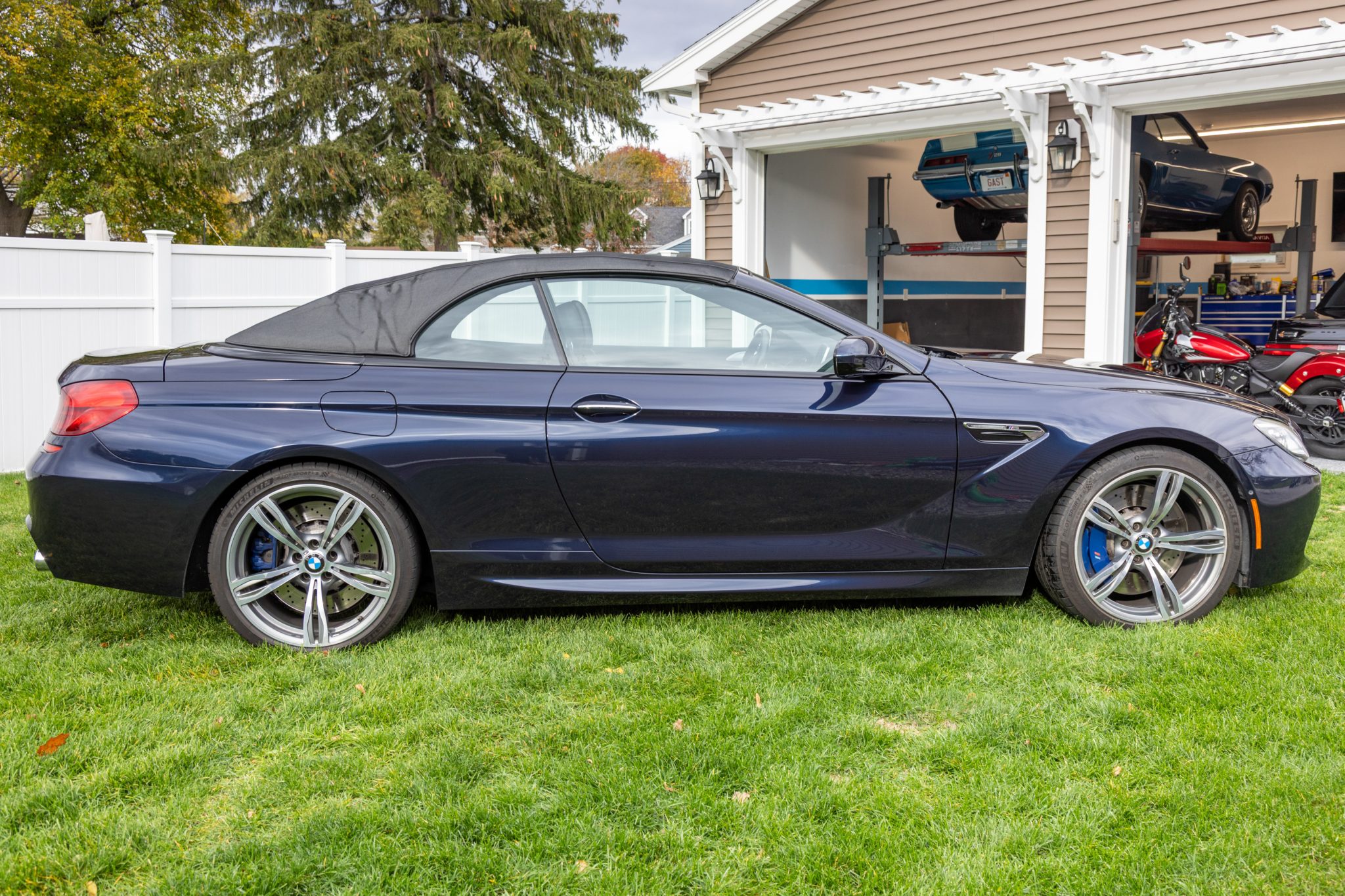 This 2013 BMW M6 is a blue-over-black convertible that has 66k miles and is powered by a twin-turbocharged 4.4-liter V8 paired with a seven-speed dual-clutch automatic transmission. The car is equipped with a black convertible top, 20″ Style 343M alloy wheels, parking sensors, heated and ventilated power-adjustable front seats, a Bang & Olufsen sound system, a surround-view camera system, Comfort Access, a heated steering wheel, soft-close doors, a head-up display, and iDrive infotainment with navigation. This F12 M6 convertible