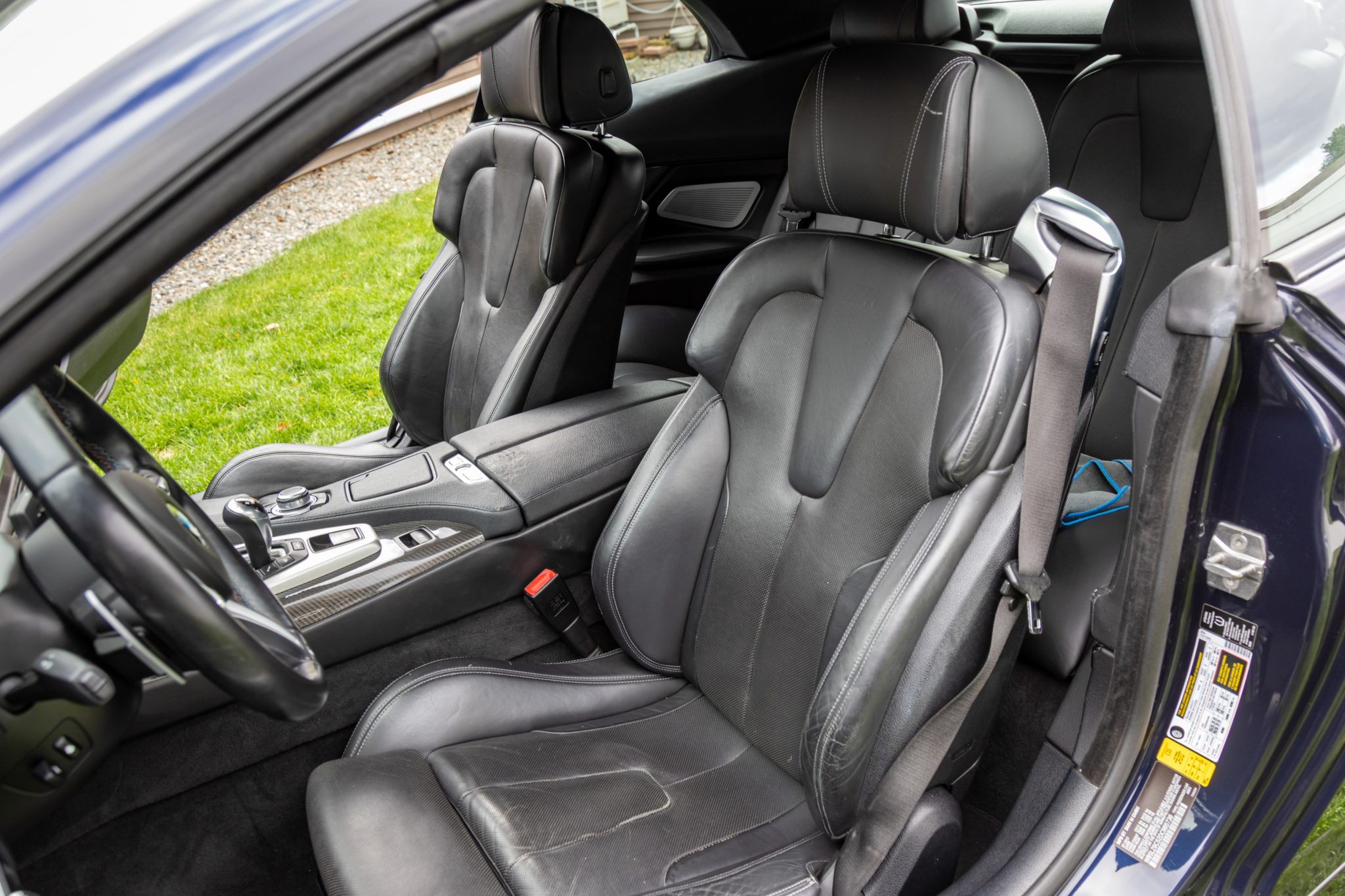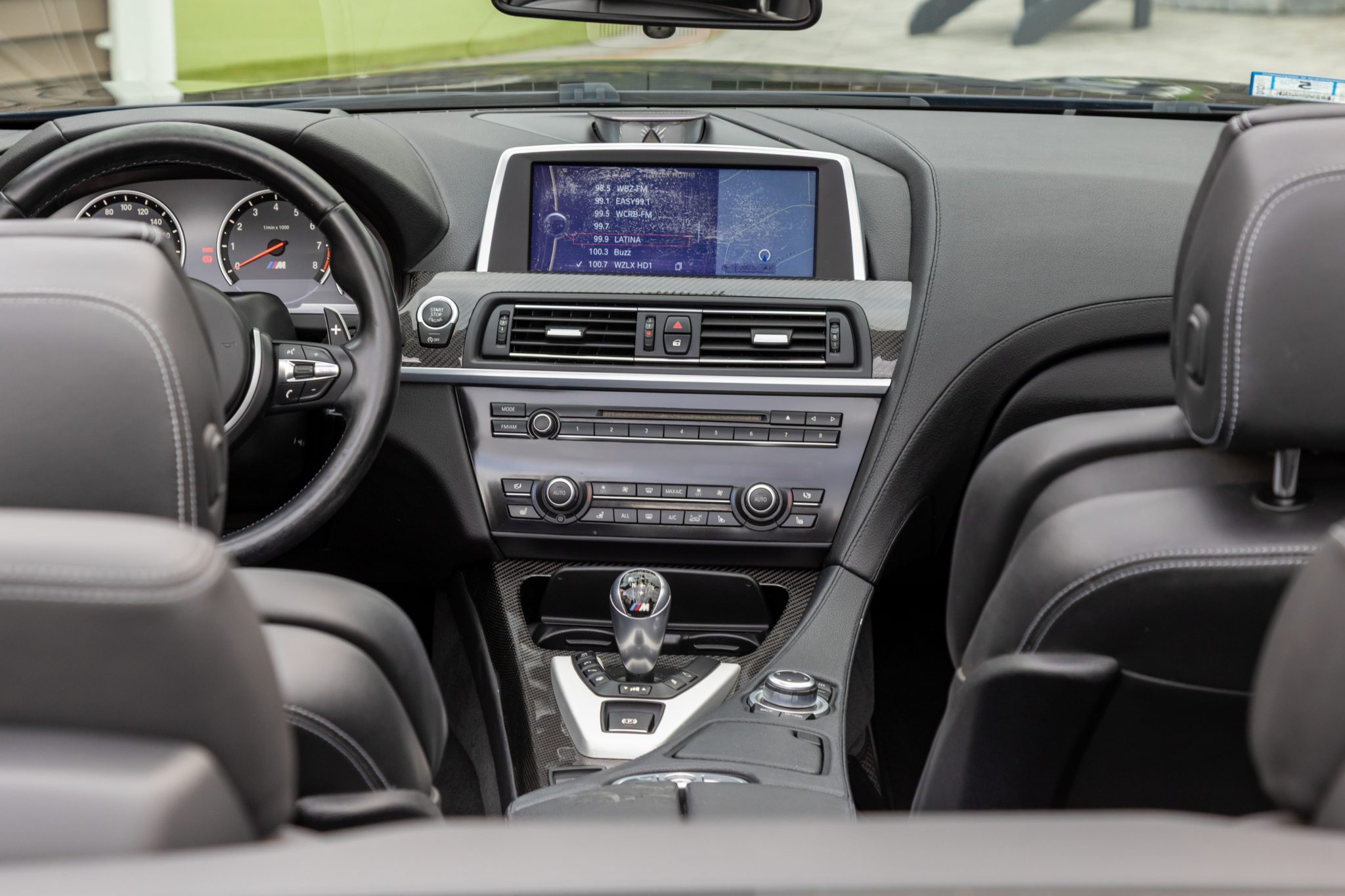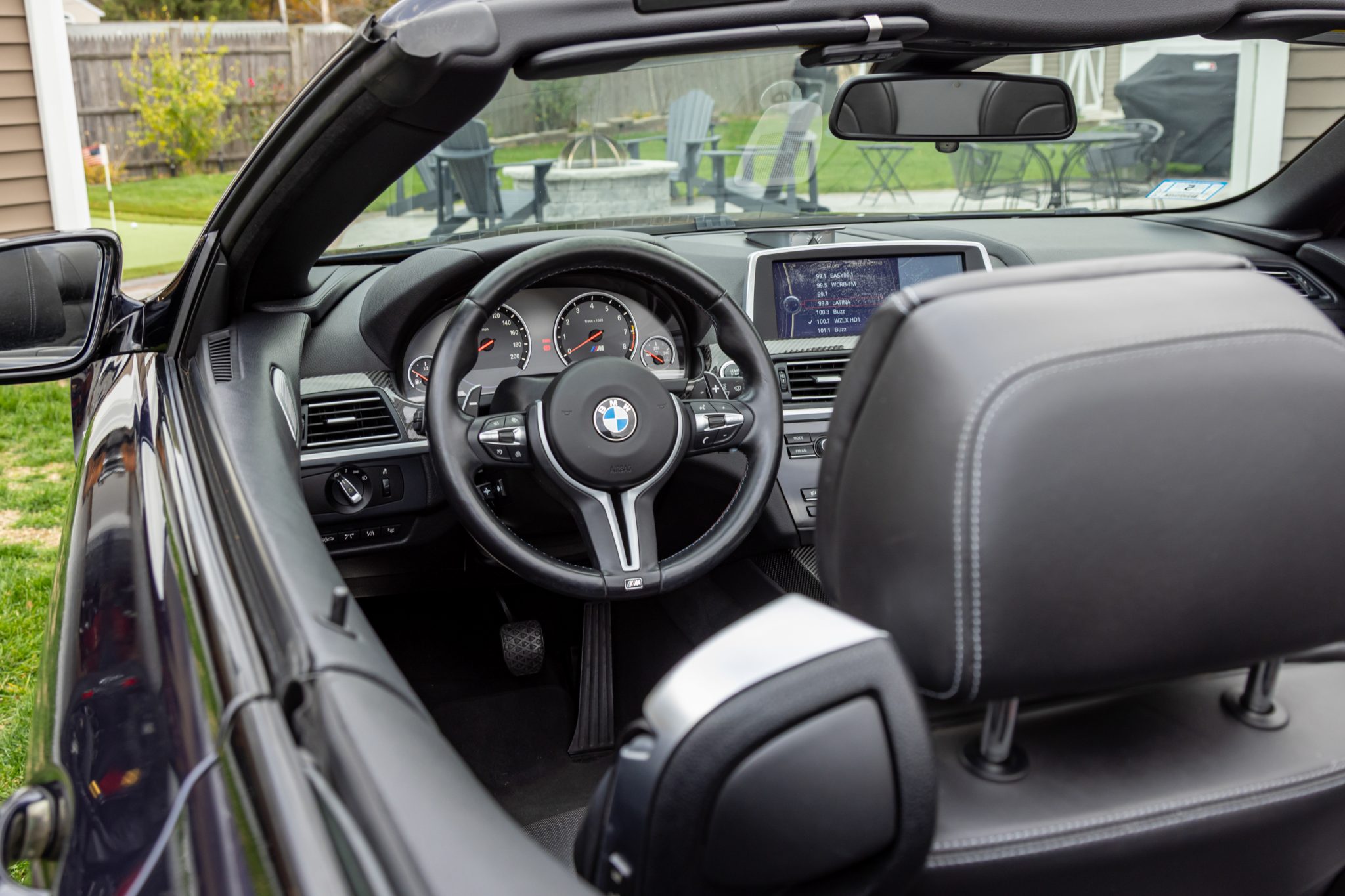 This 2013 BMW M6 is a blue-over-black convertible that has 66k miles and is powered by a twin-turbocharged 4.4-liter V8 paired with a seven-speed dual-clutch automatic transmission. The car is equipped with a black convertible top, 20″ Style 343M alloy wheels, parking sensors, heated and ventilated power-adjustable front seats, a Bang & Olufsen sound system, a surround-view camera system, Comfort Access, a heated steering wheel, soft-close doors, a head-up display, and iDrive infotainment with navigation. This F12 M6 convertible