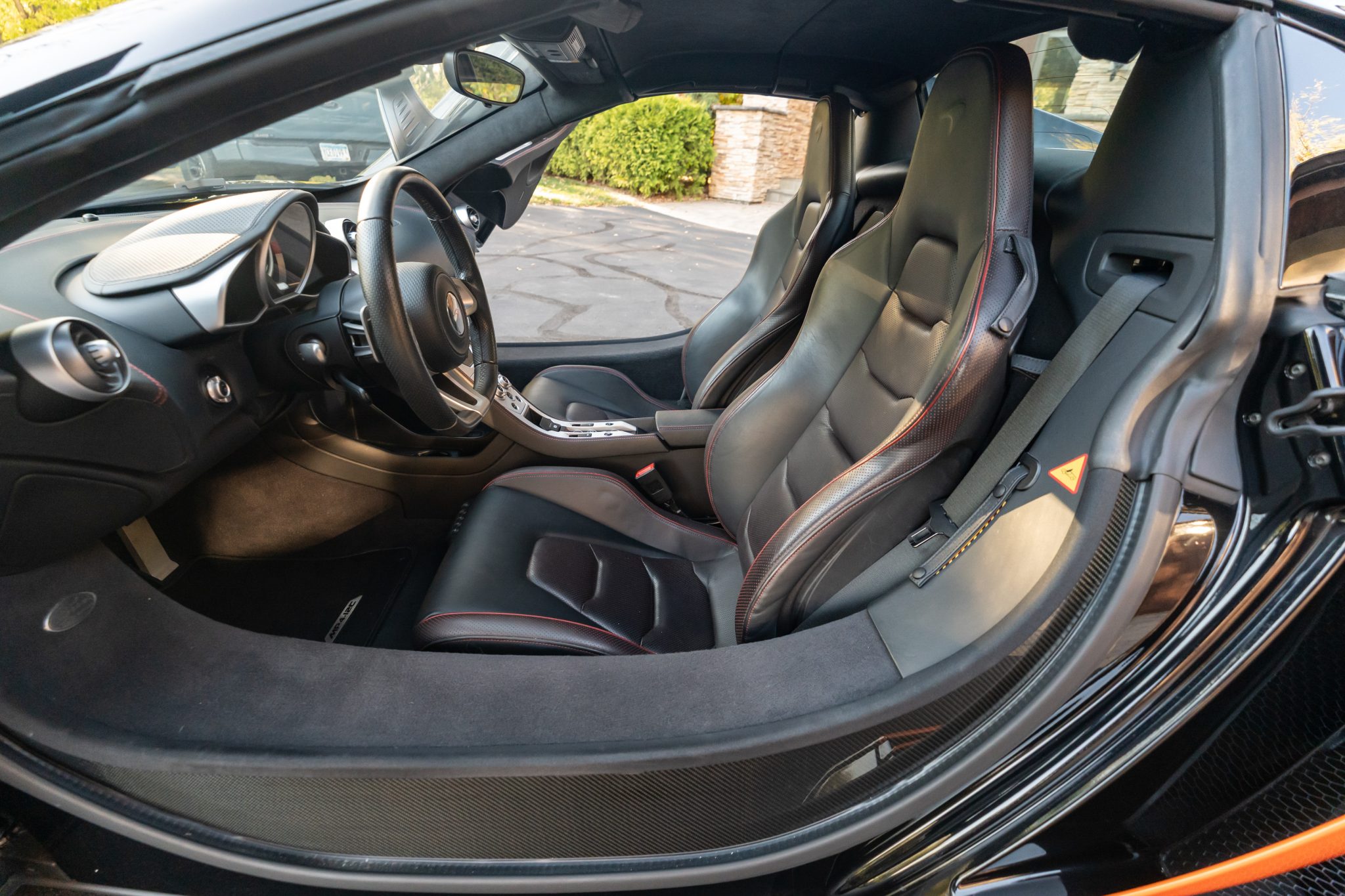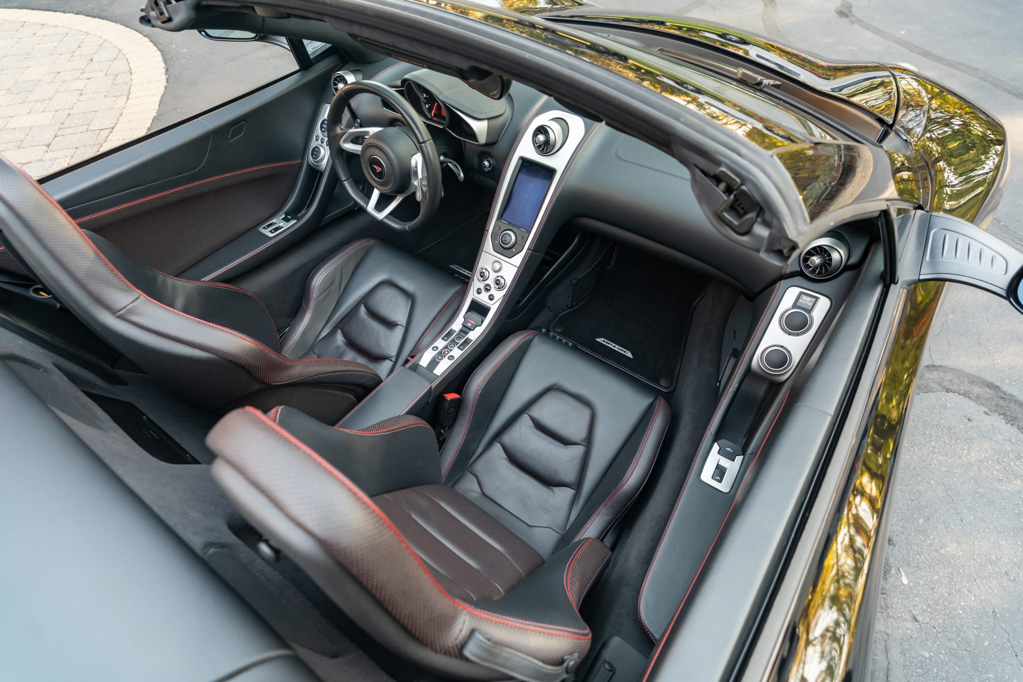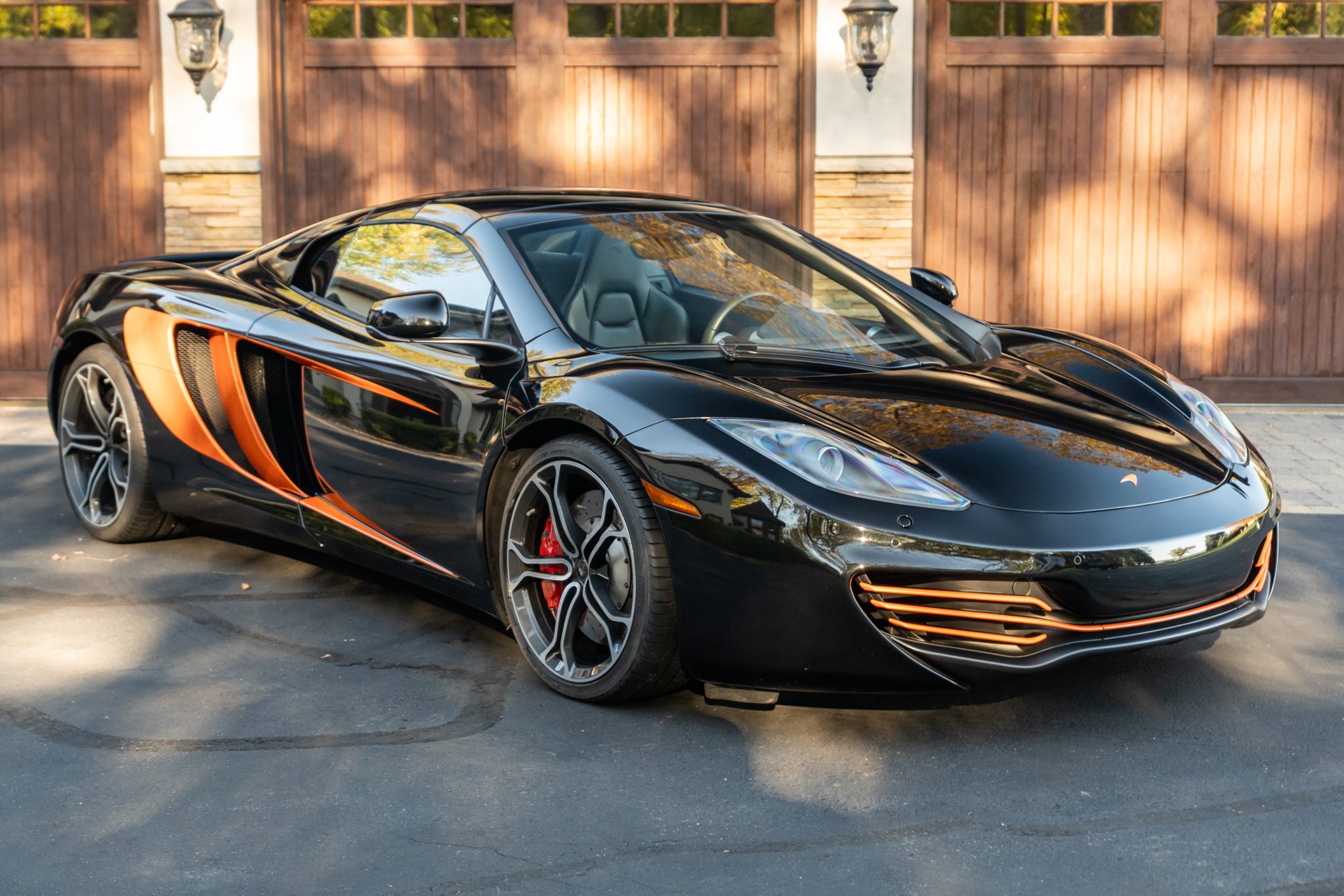 Finished in Carbon Black over matching Napa leather upholstery, the car is powered by a twin-turbocharged 3.8-liter V8 paired with a seven-speed dual-clutch automatic transaxle. Equipment includes orange vinyl accents, front and rear parking sensors, bi-xenon headlights, an active rear spoiler, dihedral doors, a folding hardtop, ProActive Chassis Control, Launch Control, dual-zone automatic climate control, a touchscreen infotainment system, and a Meridian sound system