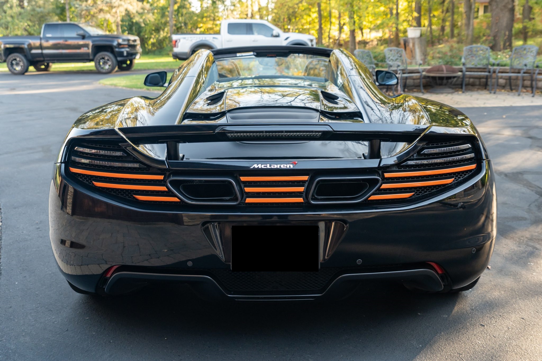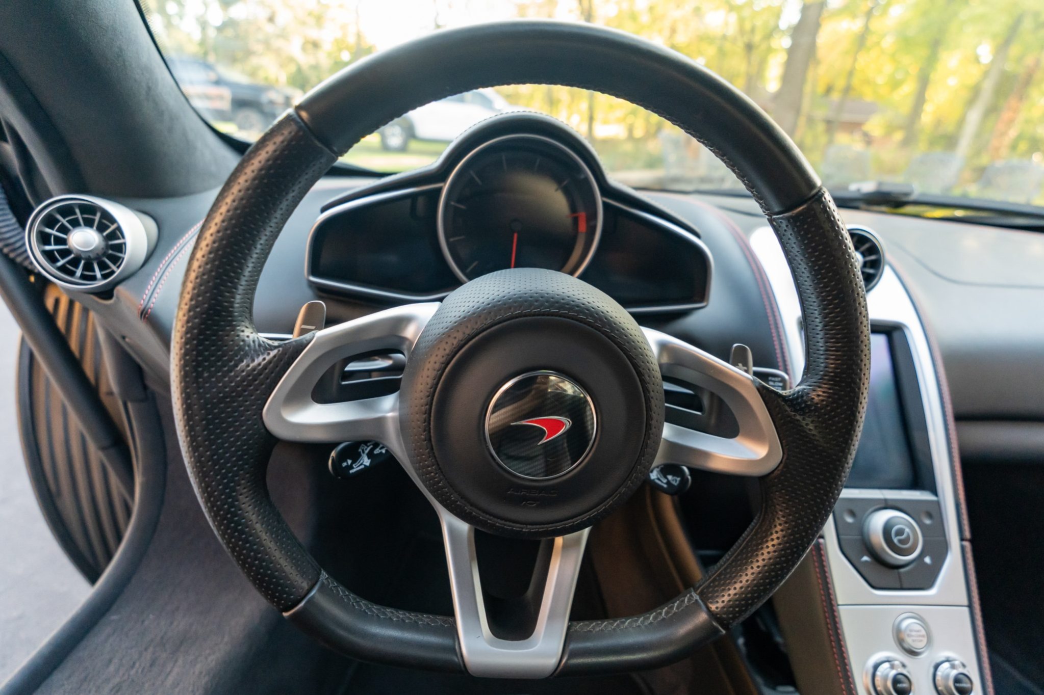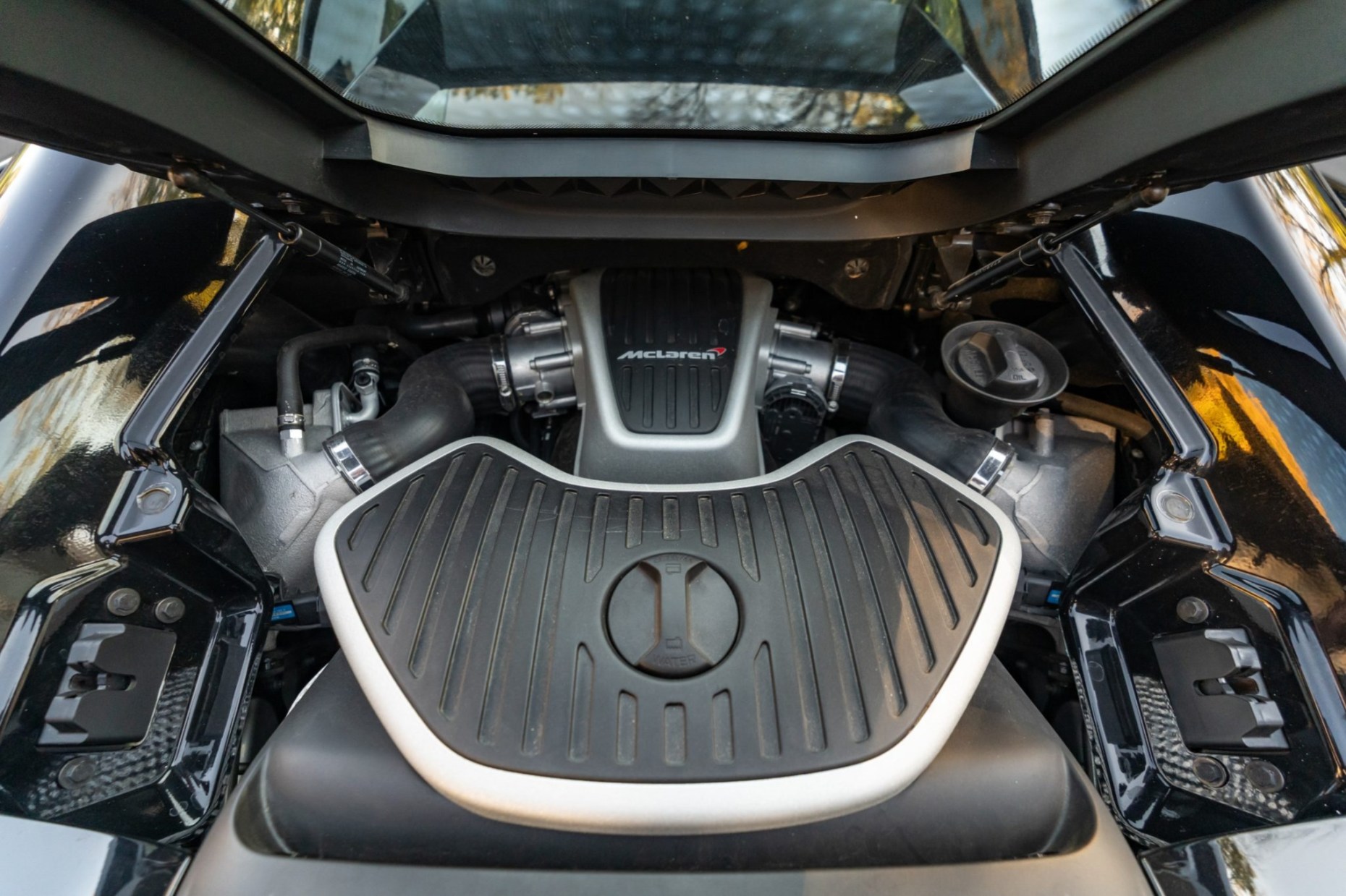 Finished in Carbon Black over matching Napa leather upholstery, the car is powered by a twin-turbocharged 3.8-liter V8 paired with a seven-speed dual-clutch automatic transaxle. Equipment includes orange vinyl accents, front and rear parking sensors, bi-xenon headlights, an active rear spoiler, dihedral doors, a folding hardtop, ProActive Chassis Control, Launch Control, dual-zone automatic climate control, a touchscreen infotainment system, and a Meridian sound system