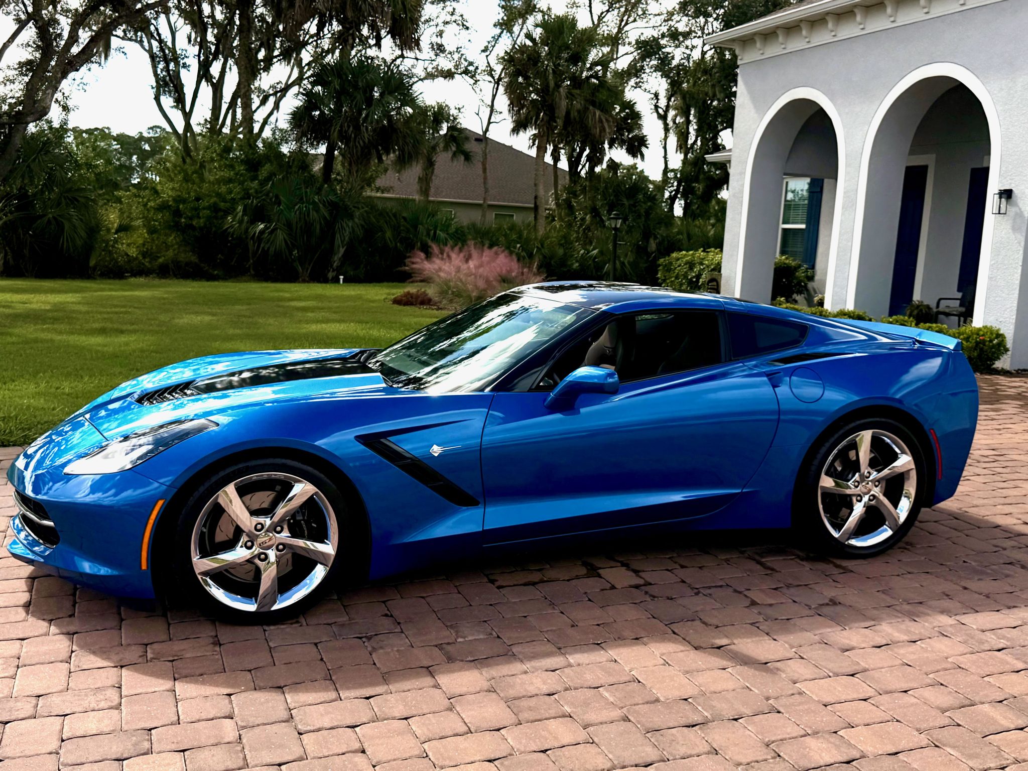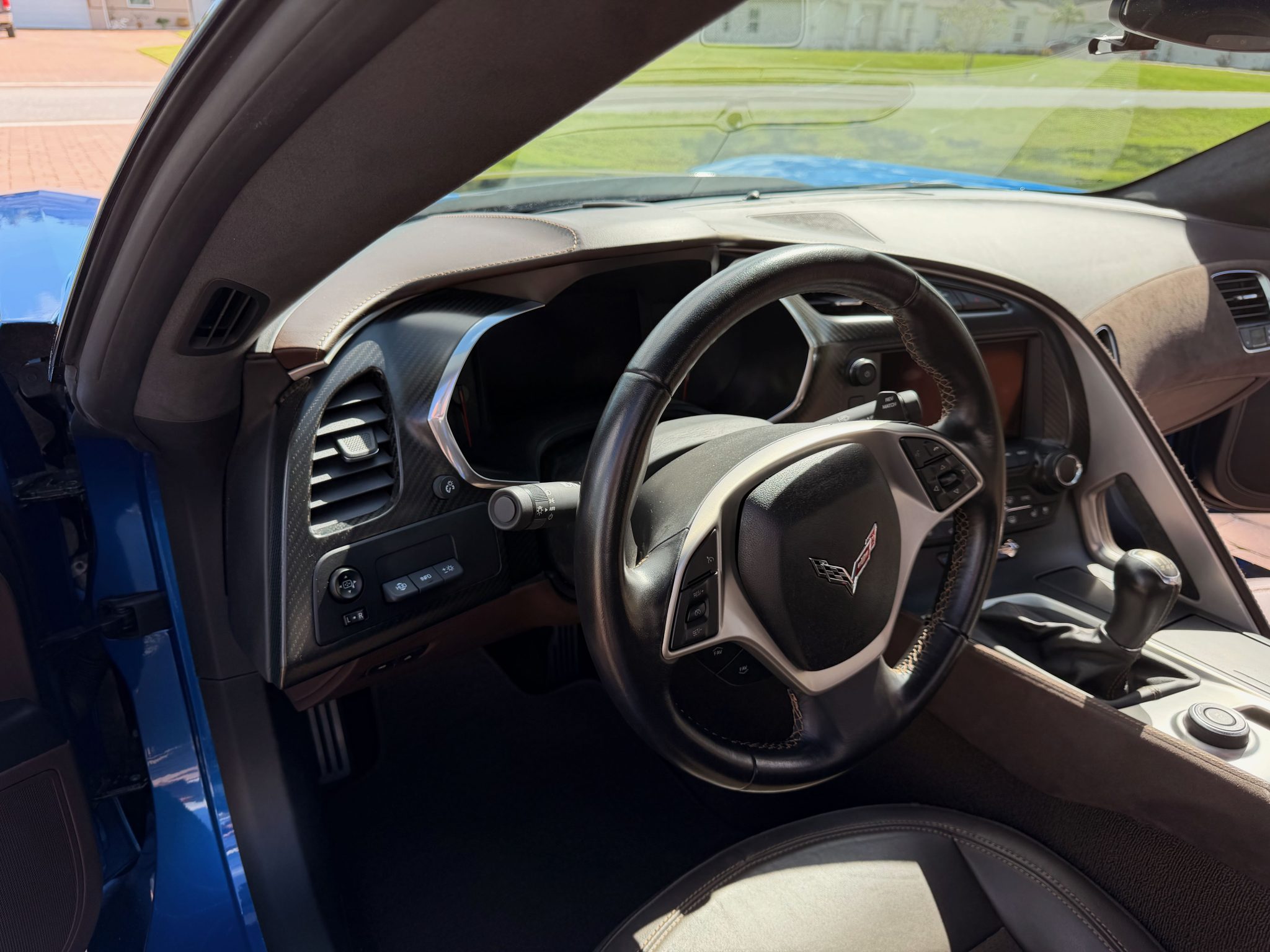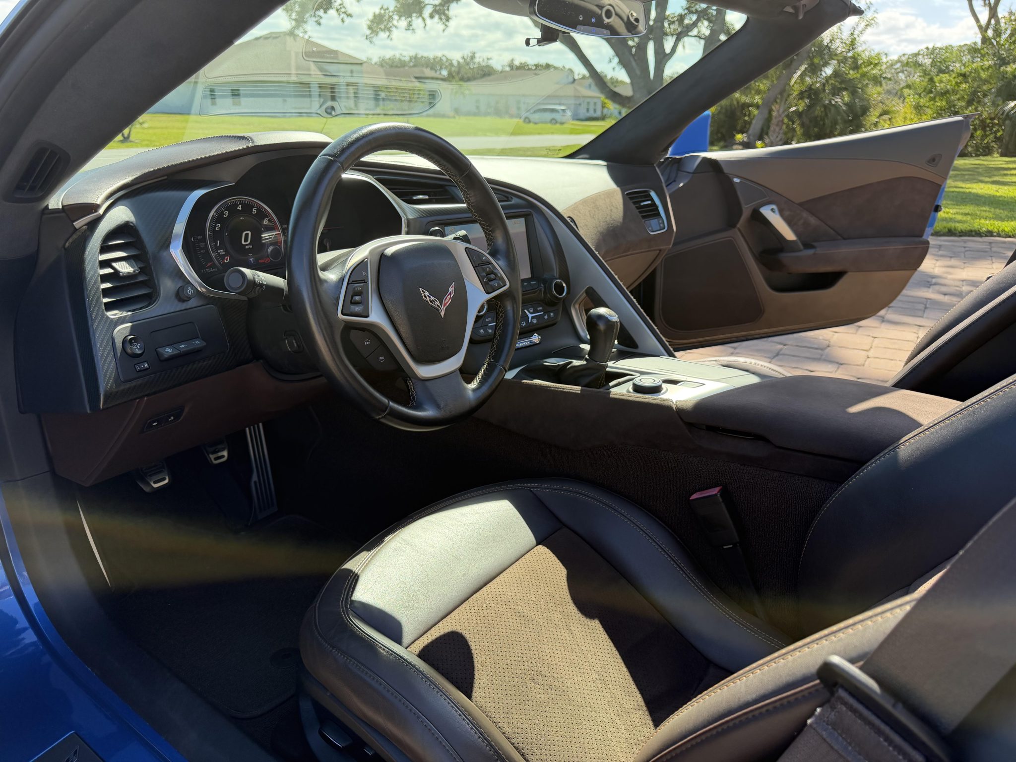 The car has 12k miles Power is provided by a 6.2-liter LT1 V8 linked with a seven-speed manual gearbox and a limited-slip differential. Finished in Laguna Blue Tintcoat over Brownstone leather, the car is equipped with the Z51 Performance Package, the 3LT Preferred Equipment Group, chrome 19″ and 20″ multi-spoke alloy wheels, Magnetic Ride Control, a Corsa Performance exhaust system, xenon headlights, a carbon-fiber roof panel, a rear spoiler, heated and ventilated bucket seats, a head-up display, a Bose sound system, and MyLink infotainment with navigation.