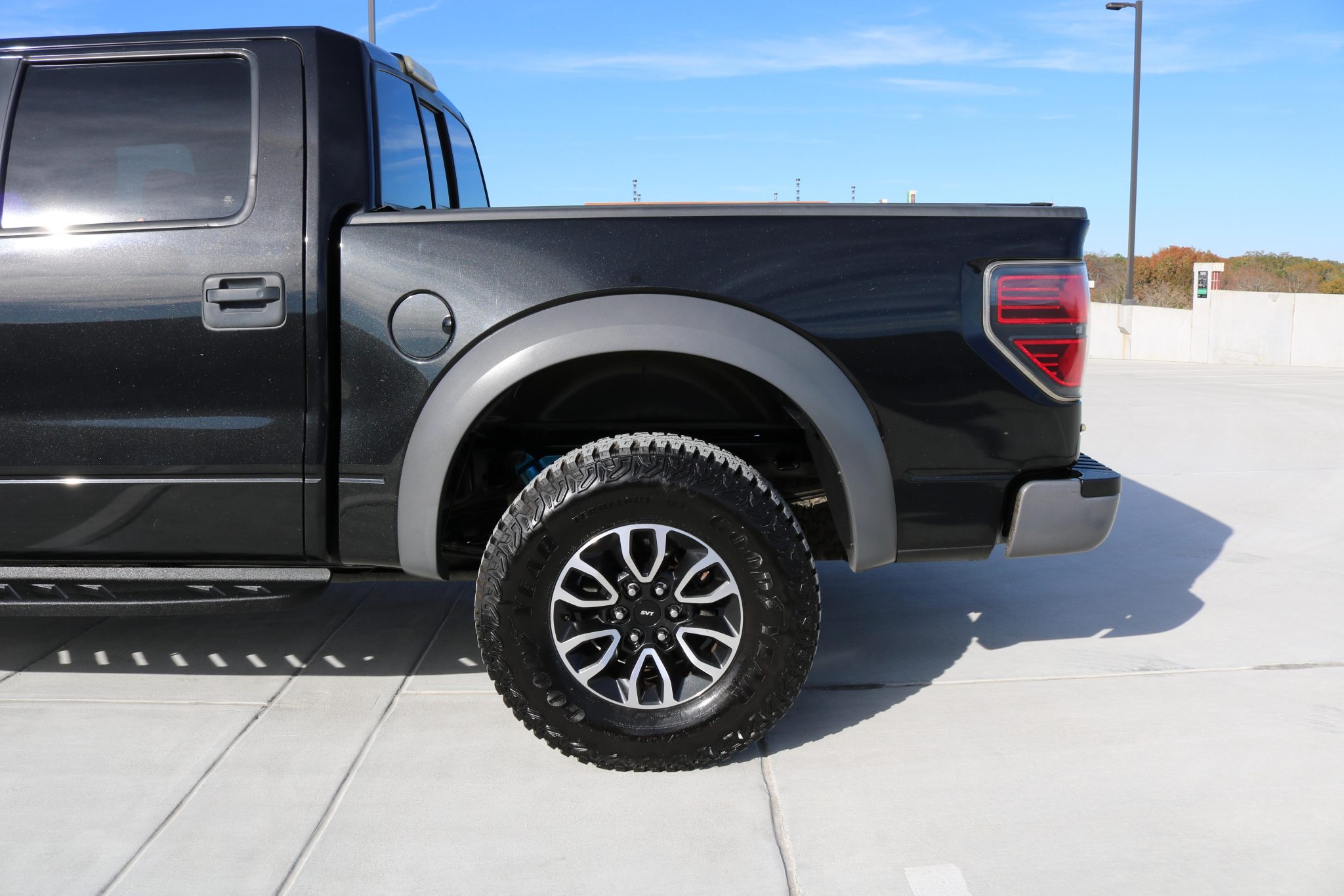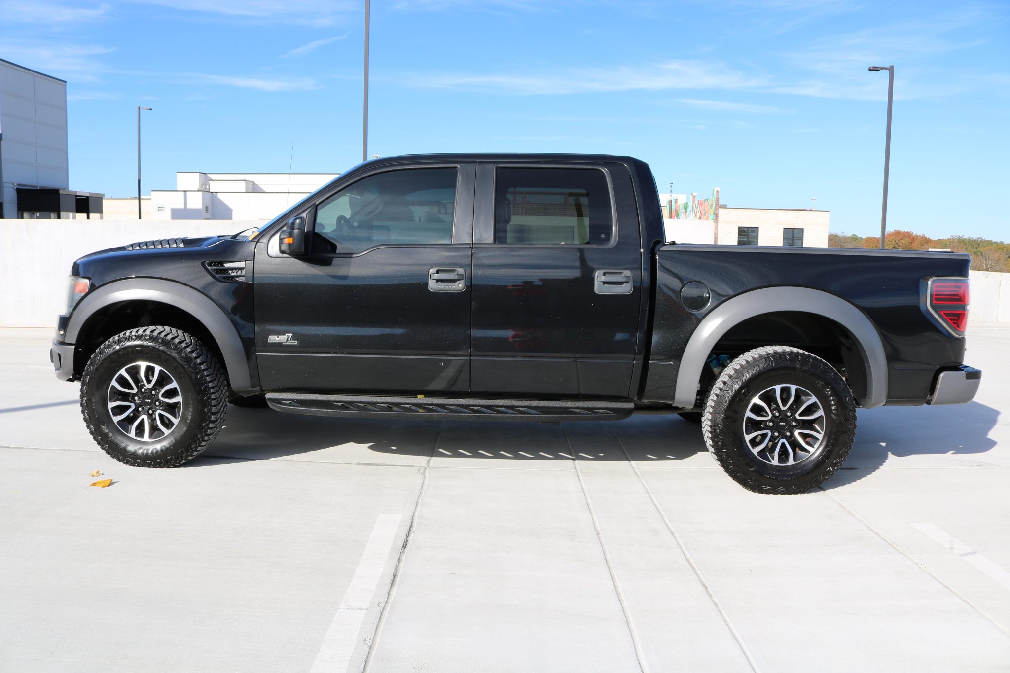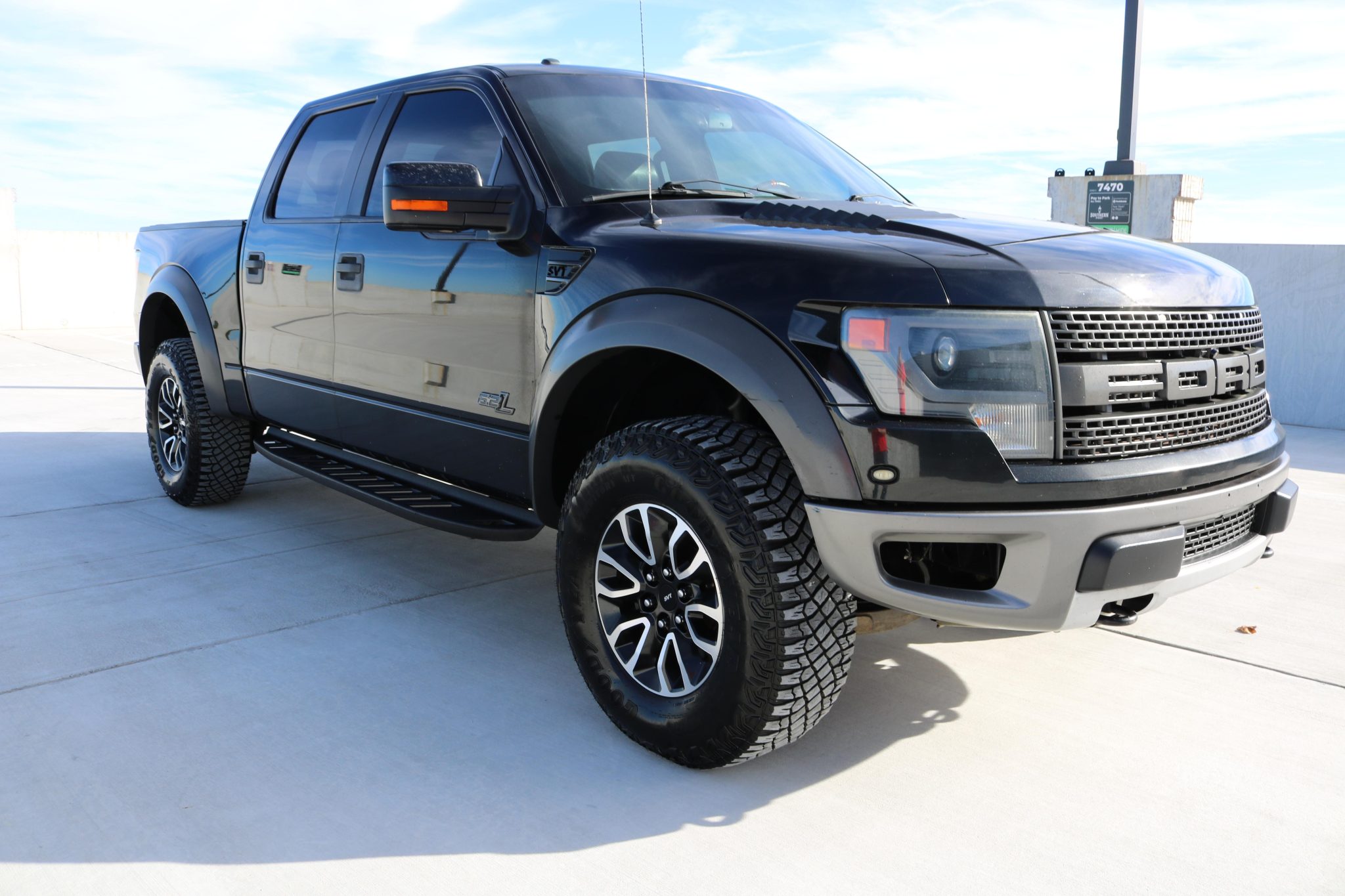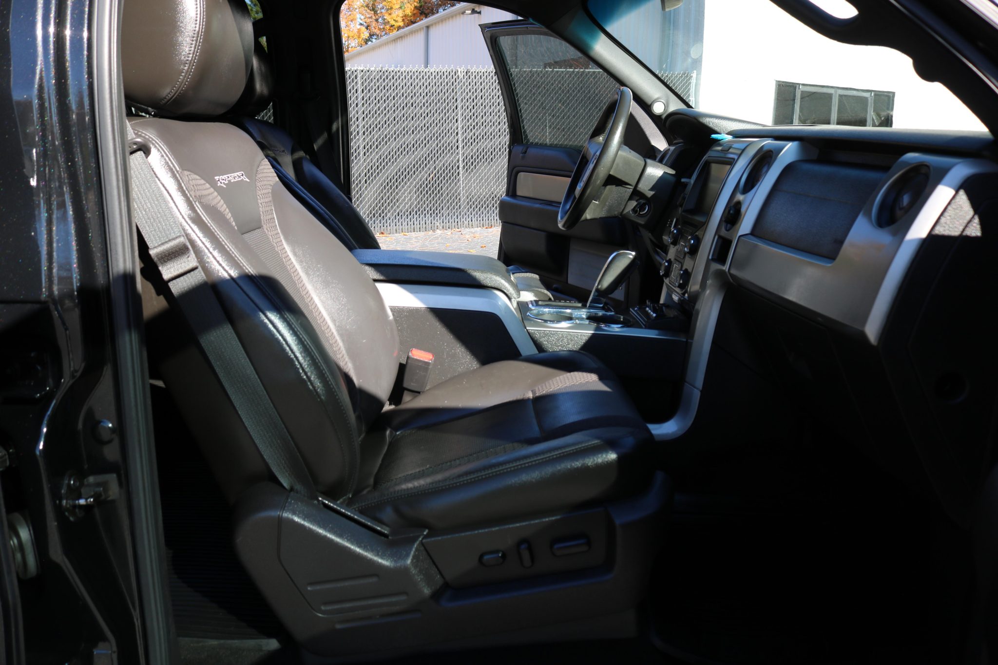 This 2014 Ford F-150 SVT Raptor SuperCrew is finished in Tuxedo Black Metallic over black leather and cloth and is powered by a 6.2-liter Boss V8 linked with a six-speed automatic transmission, a dual-range transfer case, and an electronically locking rear differential. Equipment includes a power sunroof, a hard-folding tonneau cover, a tailgate step, Fox Racing internal-bypass shocks, 17″ machined aluminum wheels, heated and ventilated front seats, automatic climate control, cruise control, front- and rear-facing cameras, and a Sony sound system with a CD stereo.