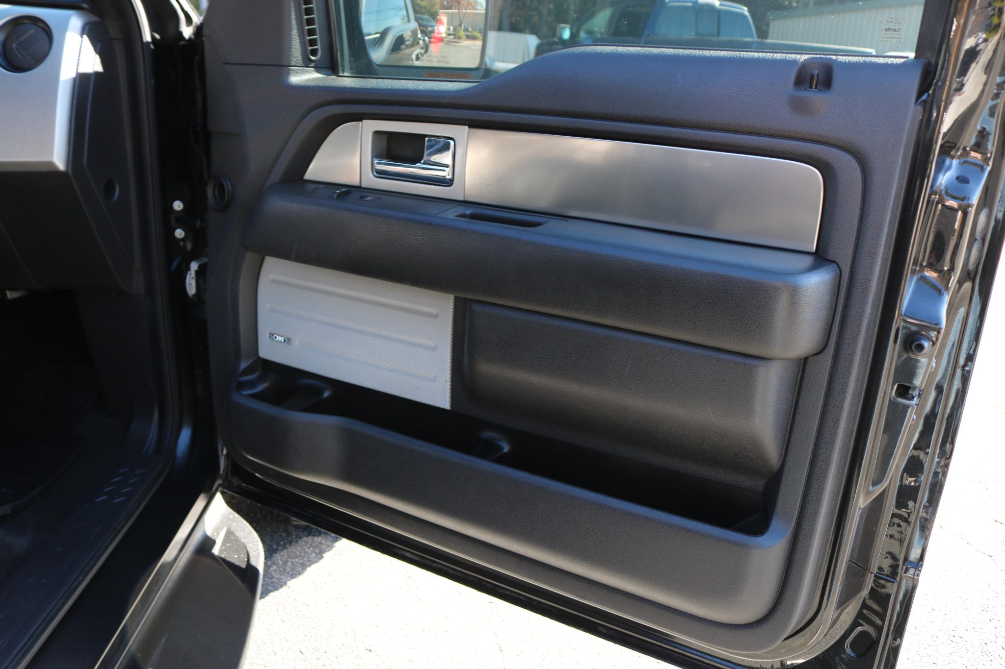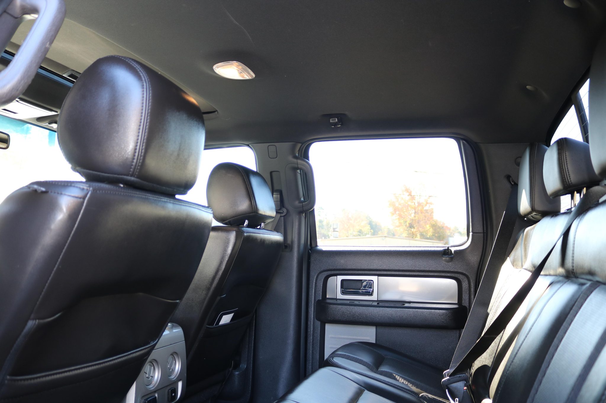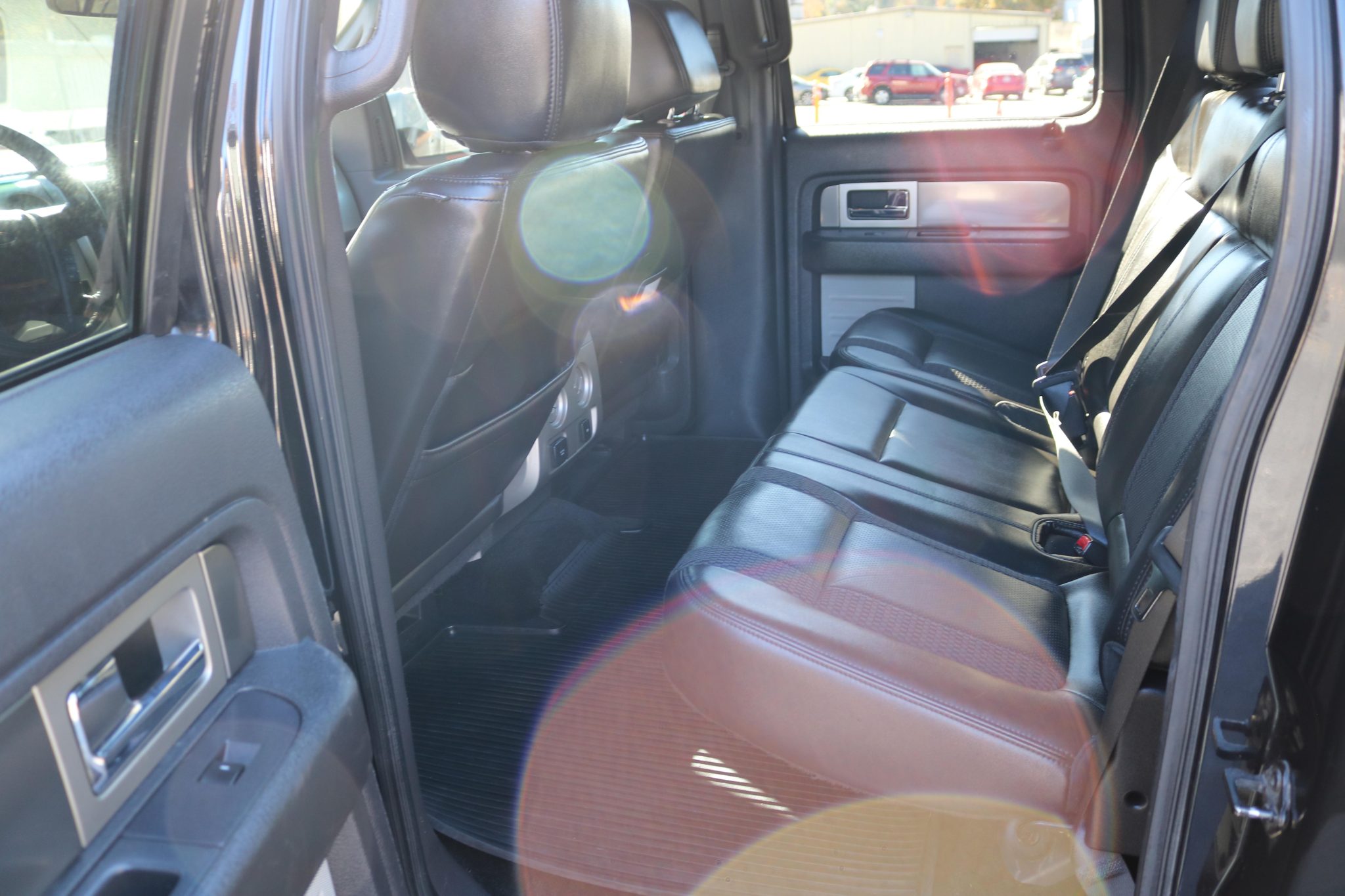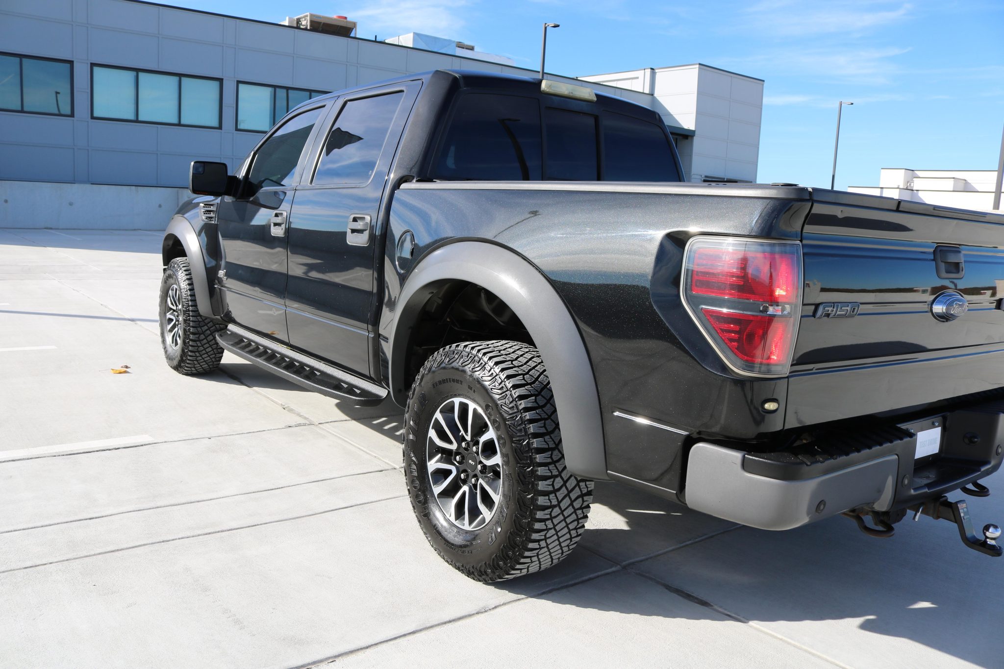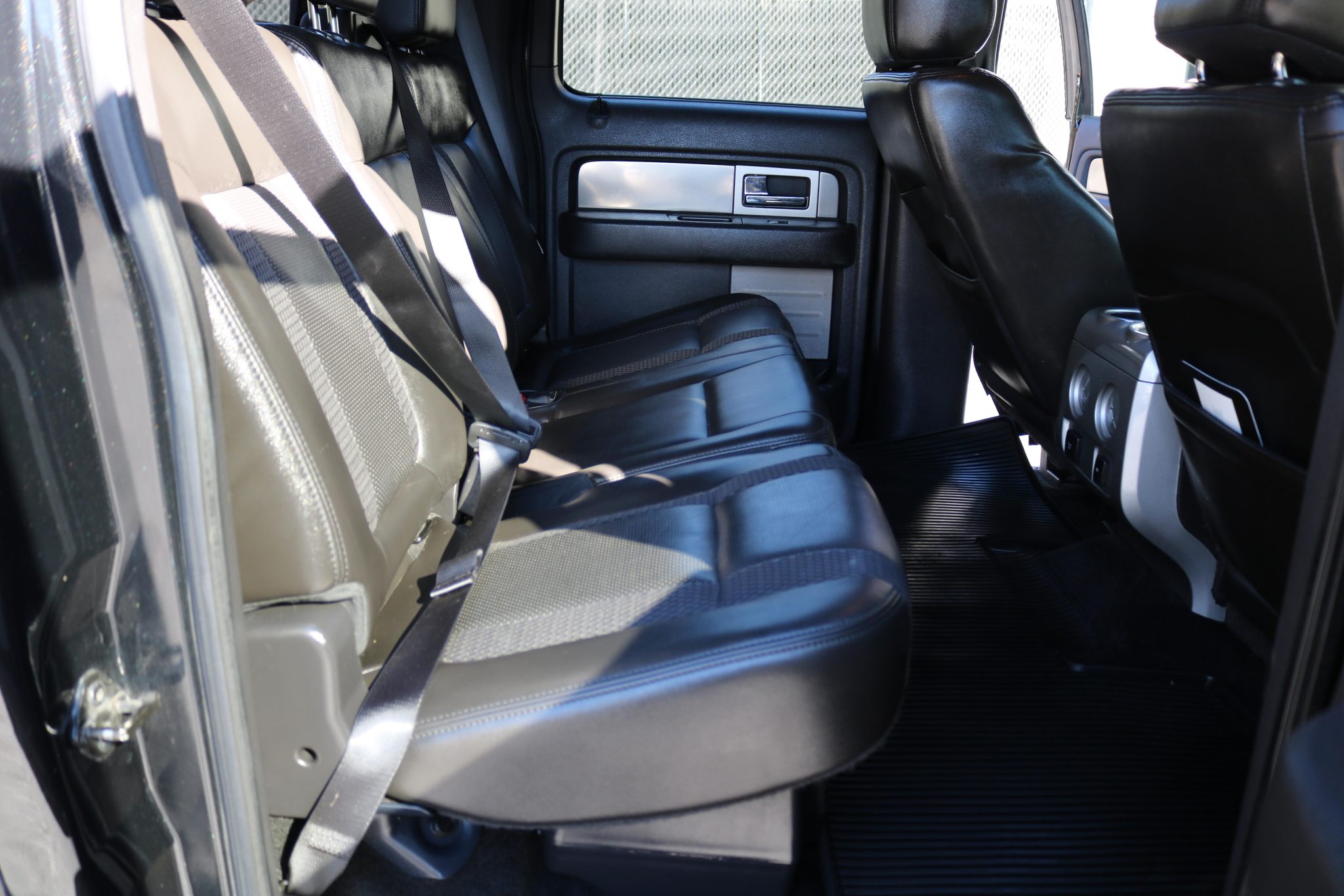 This 2014 Ford F-150 SVT Raptor SuperCrew is finished in Tuxedo Black Metallic over black leather and cloth and is powered by a 6.2-liter Boss V8 linked with a six-speed automatic transmission, a dual-range transfer case, and an electronically locking rear differential. Equipment includes a power sunroof, a hard-folding tonneau cover, a tailgate step, Fox Racing internal-bypass shocks, 17″ machined aluminum wheels, heated and ventilated front seats, automatic climate control, cruise control, front- and rear-facing cameras, and a Sony sound system with a CD stereo.
