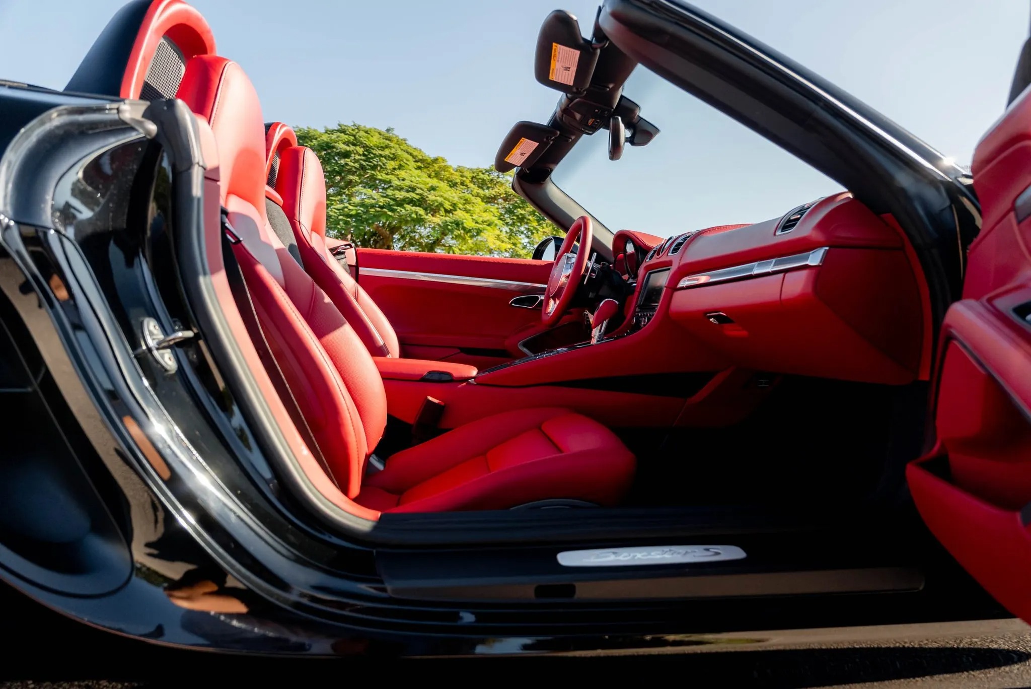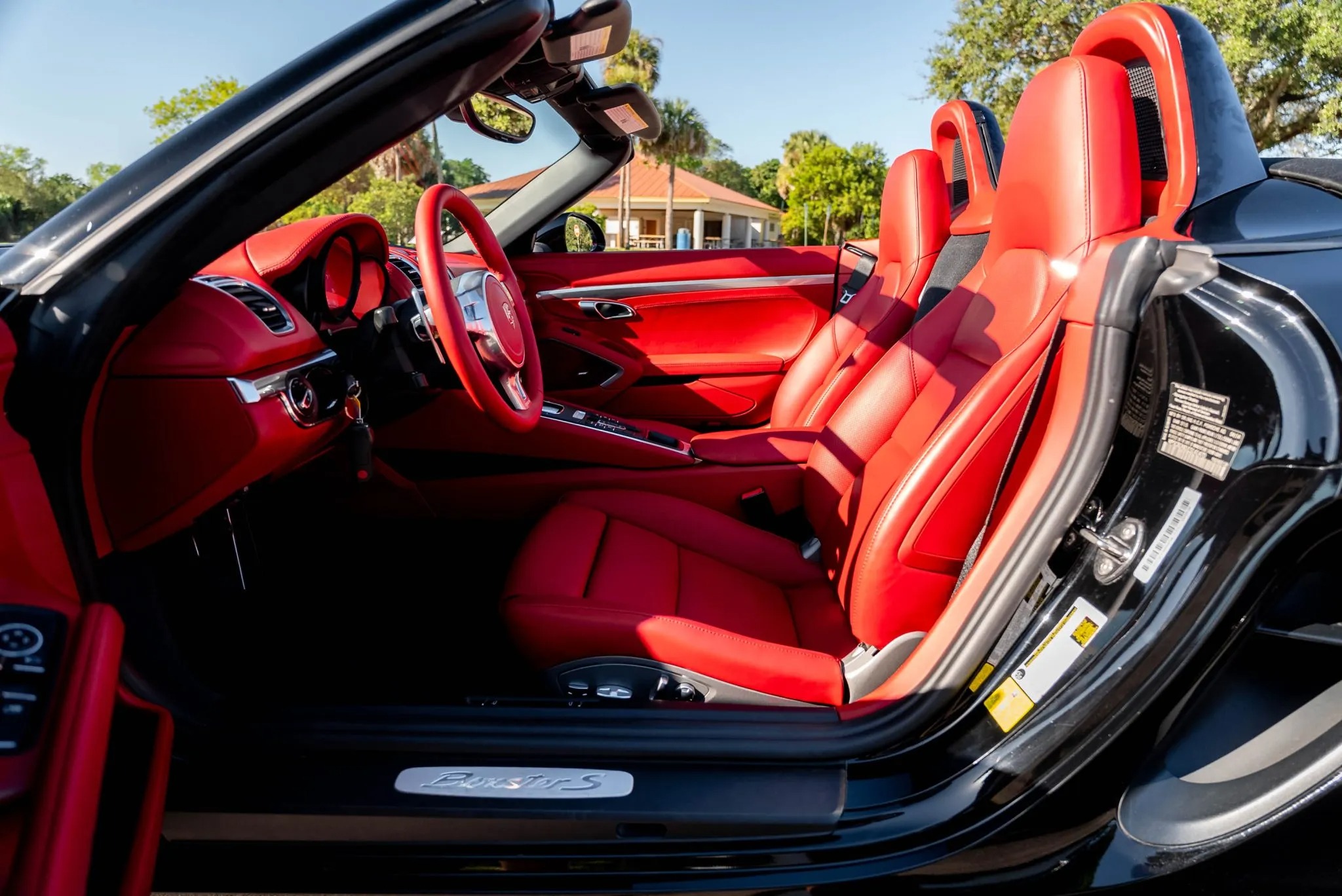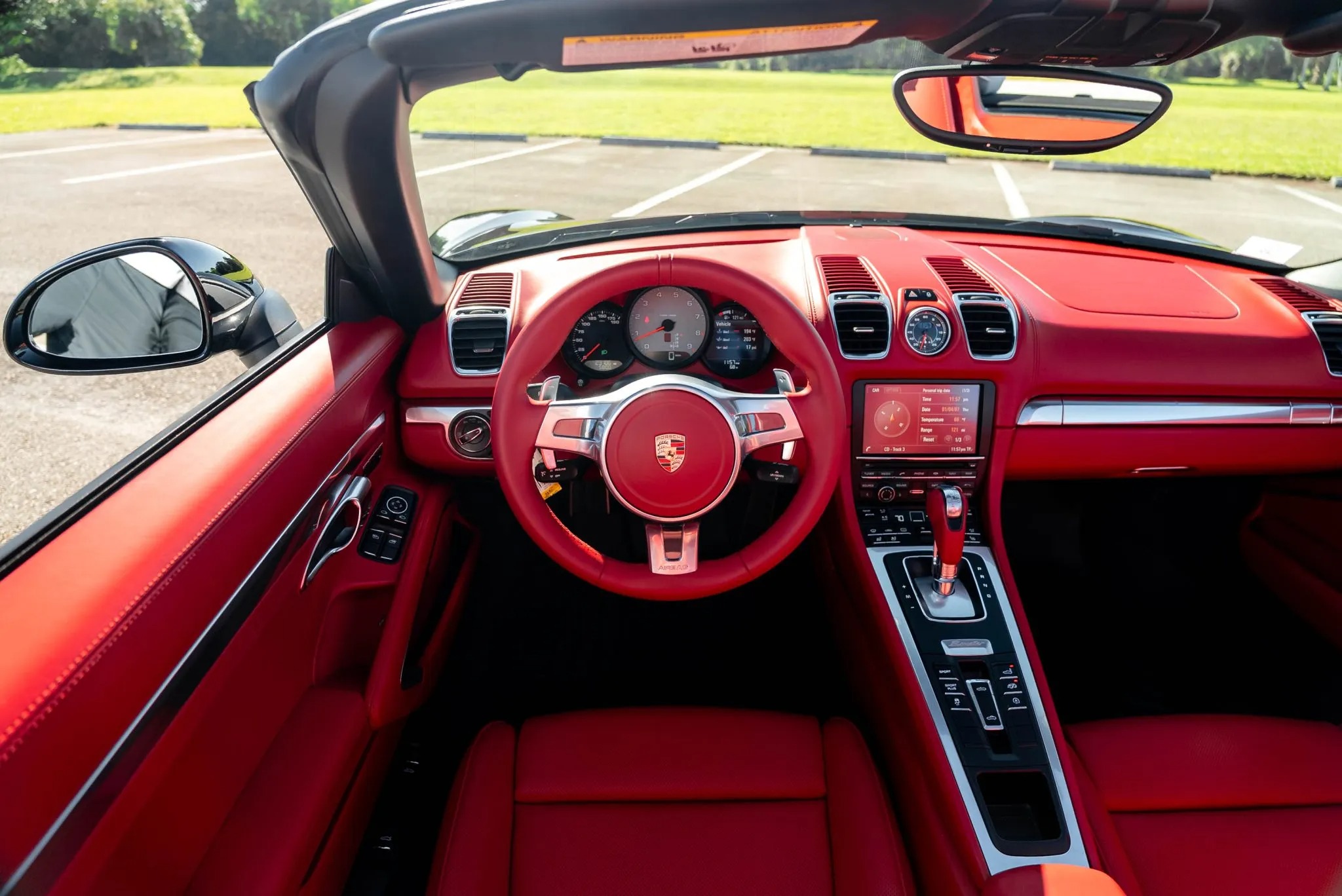It is finished in black over Carrera Red Natural leather and is powered by a 3.4-liter flat-six paired with a seven-speed PDK dual-clutch automatic transaxle. Equipment includes a black soft top, a sport exhaust system, 20″ Carrera S alloy wheels, bi-xenon headlights with PDLS, a speed-activated rear spoiler, the Sport Chrono Package, heated and ventilated power-adjustable seats, a SportDesign steering wheel, a Bose Surround Sound system, navigation, dual-zone automatic climate control, and cruise control.
