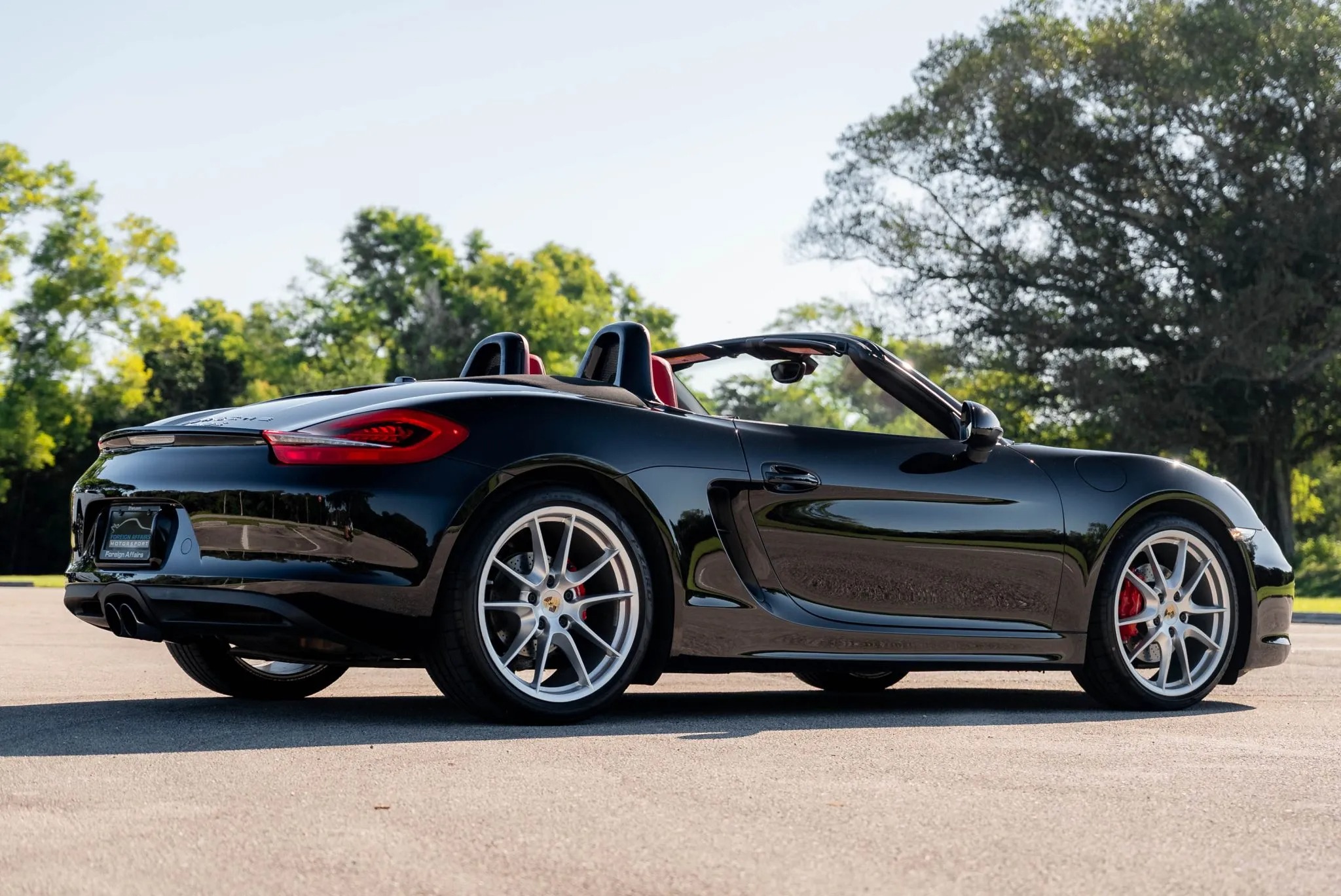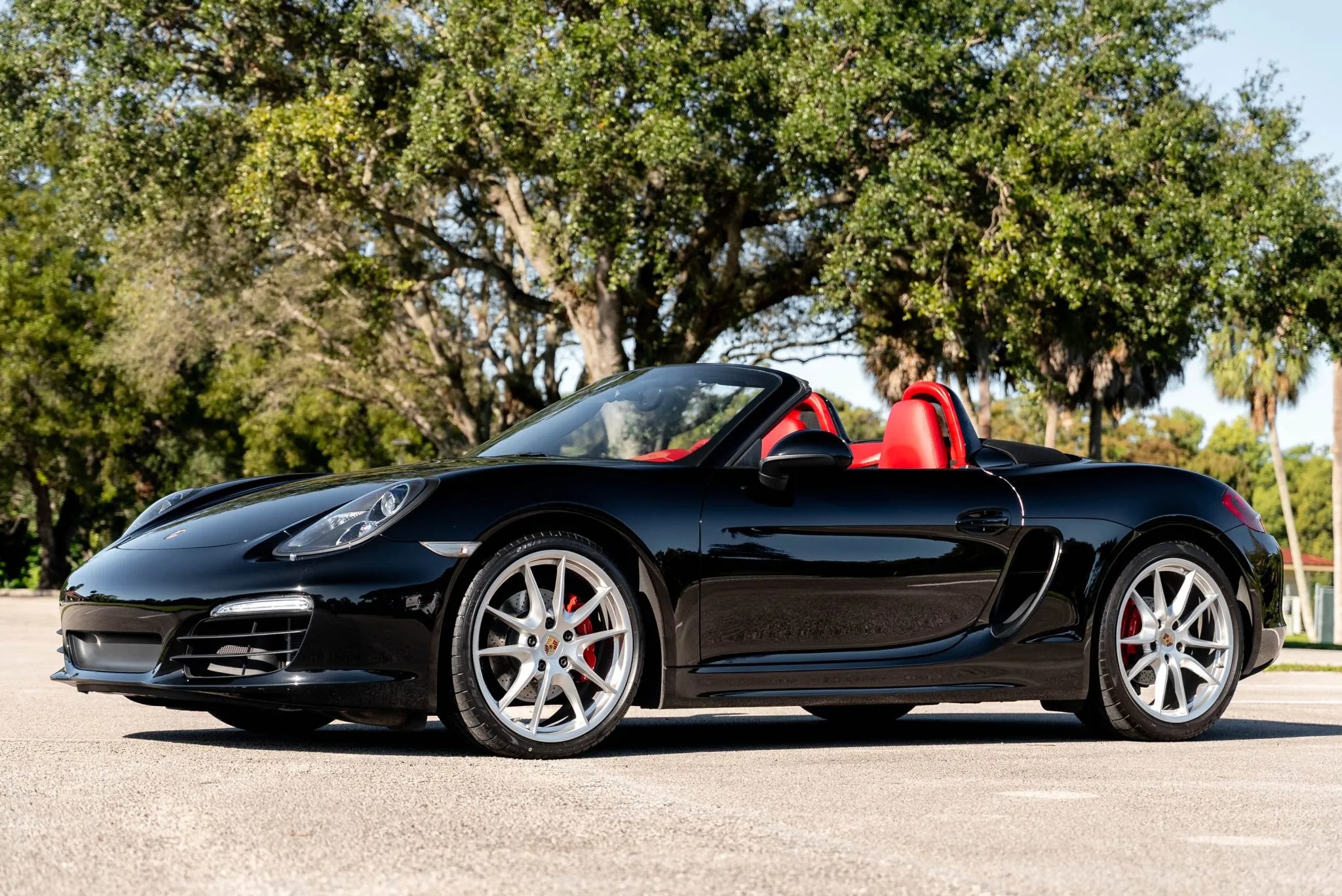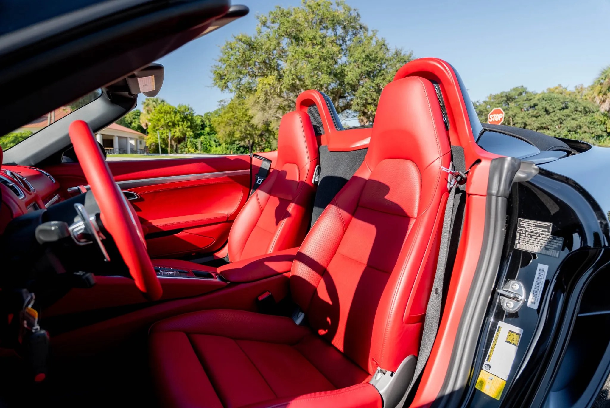 It is finished in black over Carrera Red Natural leather and is powered by a 3.4-liter flat-six paired with a seven-speed PDK dual-clutch automatic transaxle. Equipment includes a black soft top, a sport exhaust system, 20″ Carrera S alloy wheels, bi-xenon headlights with PDLS, a speed-activated rear spoiler, the Sport Chrono Package, heated and ventilated power-adjustable seats, a SportDesign steering wheel, a Bose Surround Sound system, navigation, dual-zone automatic climate control, and cruise control.