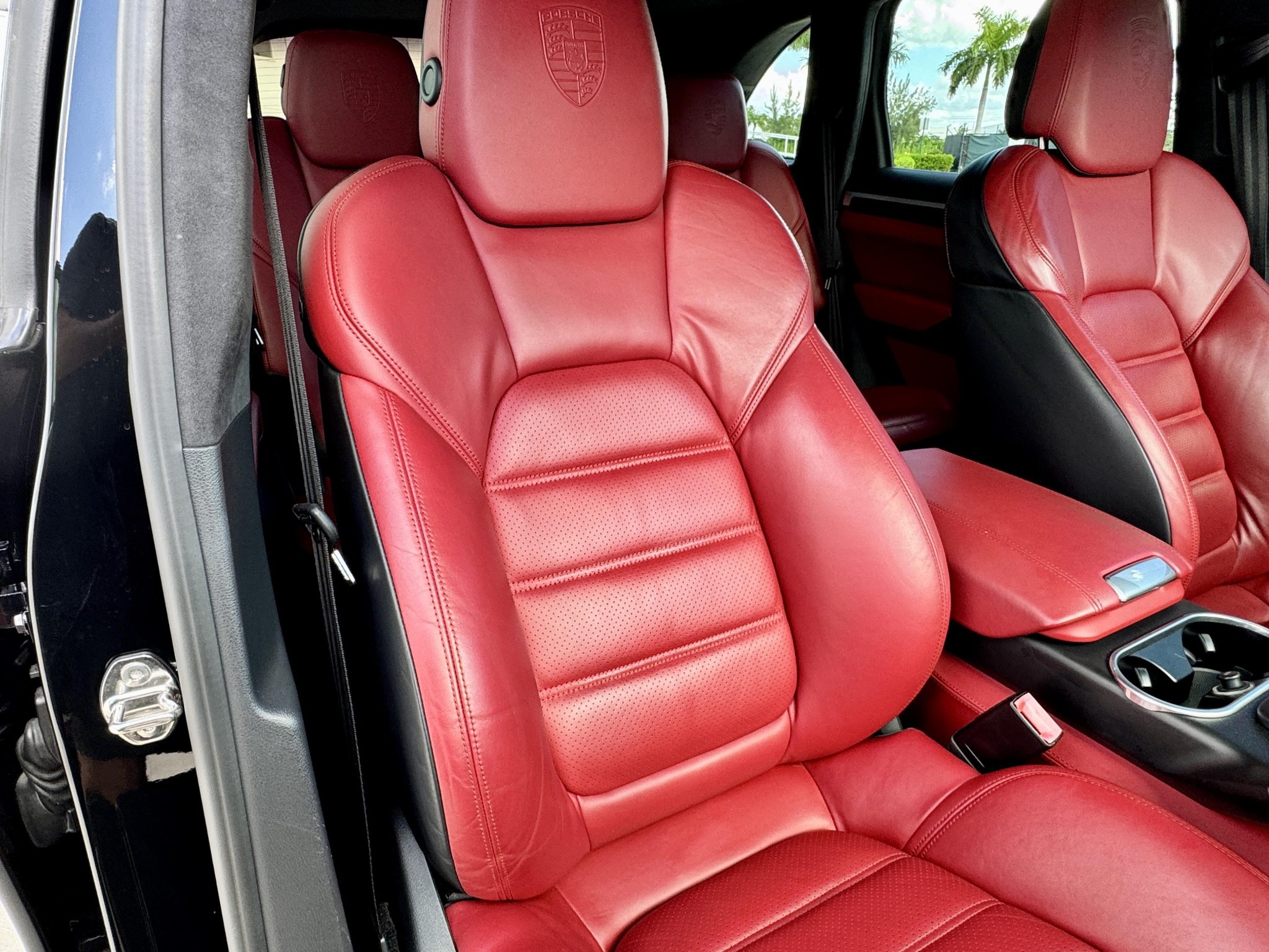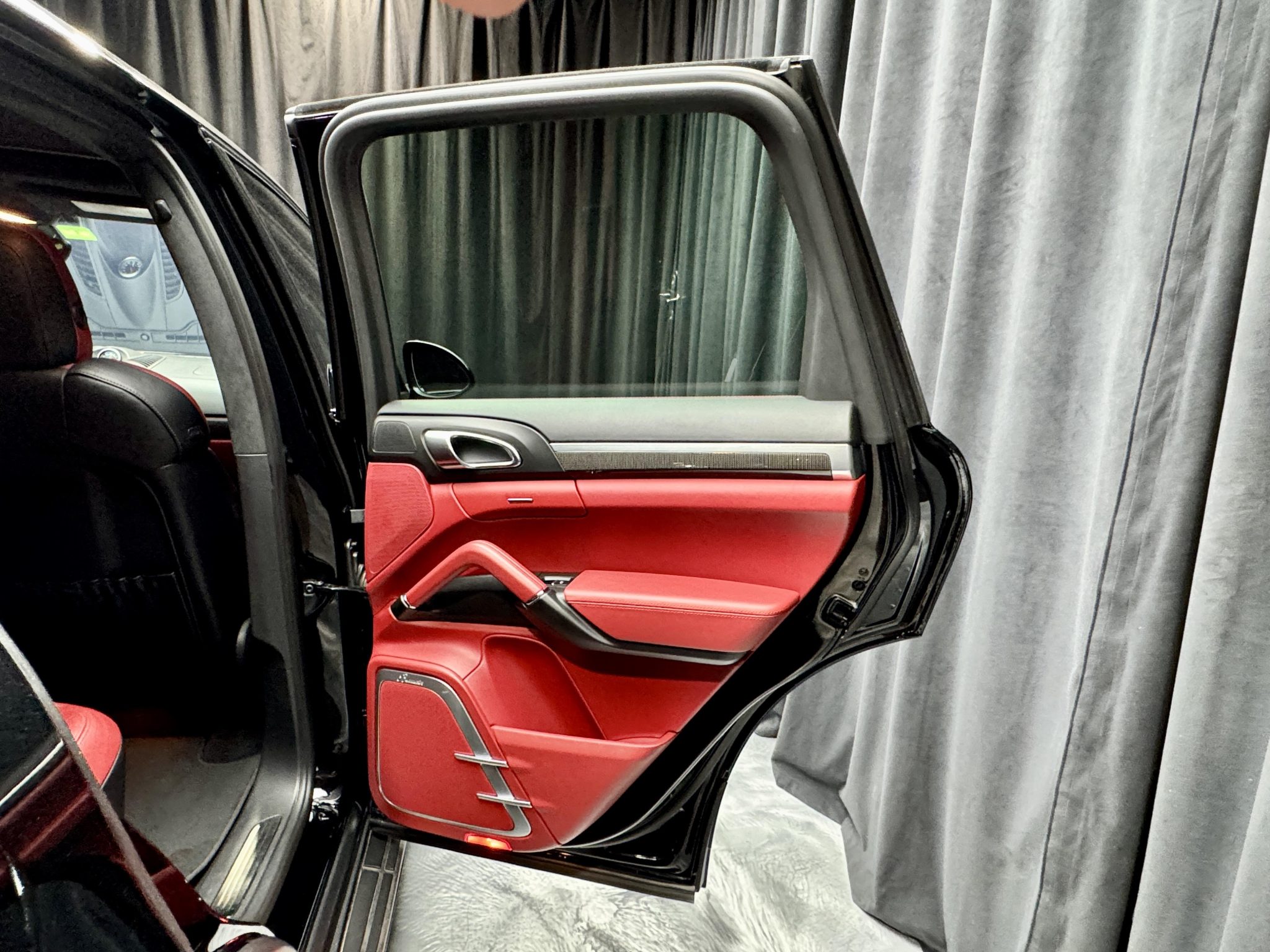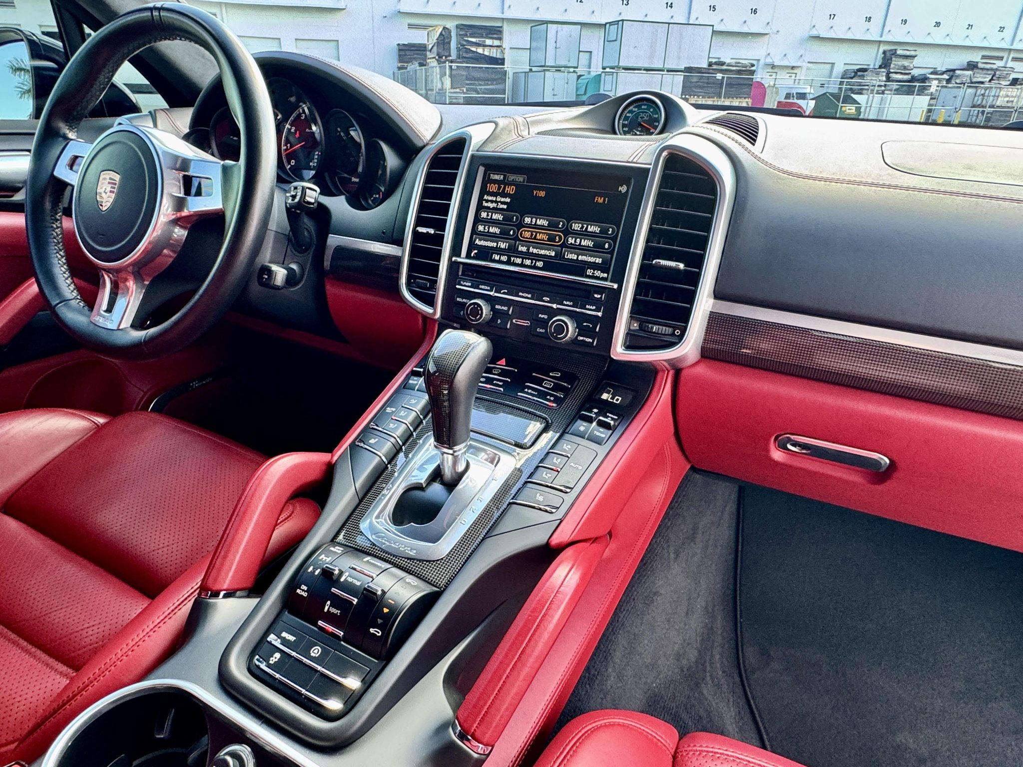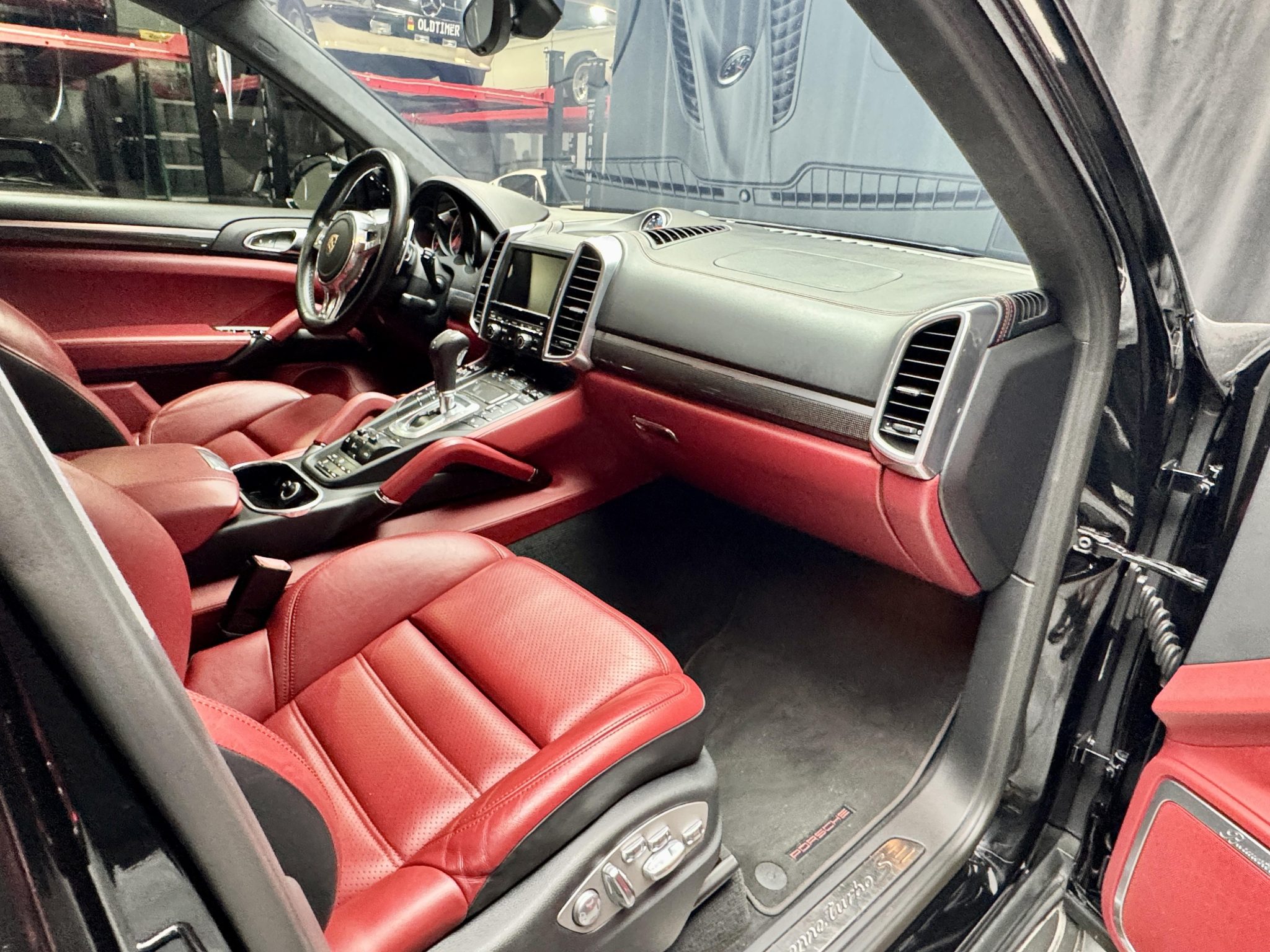 This 2014 Porsche Cayenne Turbo S is finished in Black over Carrera Red and Black leather and has 26k miles Equipment includes Burmester audio, a panoramic sunroof, running boards, 21″ Cayenne SportEdition wheels, heated front Adaptive Sport Seats, PCM with navigation, and Black xenon headlights with PDLS+. Power is provided by a 550-horsepower twin-turbocharged 4.8L V8 linked with an eight-speed Tiptronic S automatic transmission and locking center and rear differentials with PTV+.