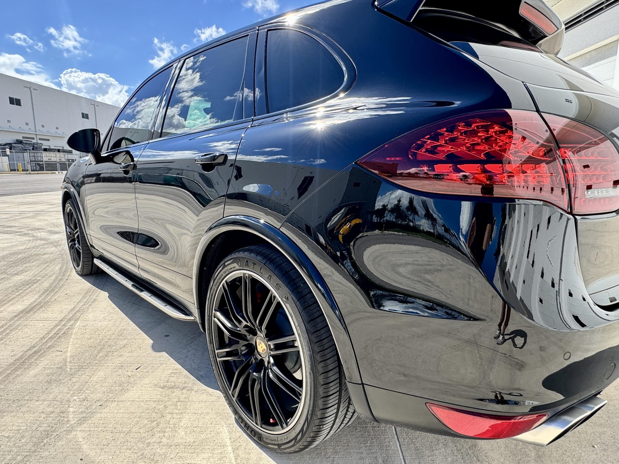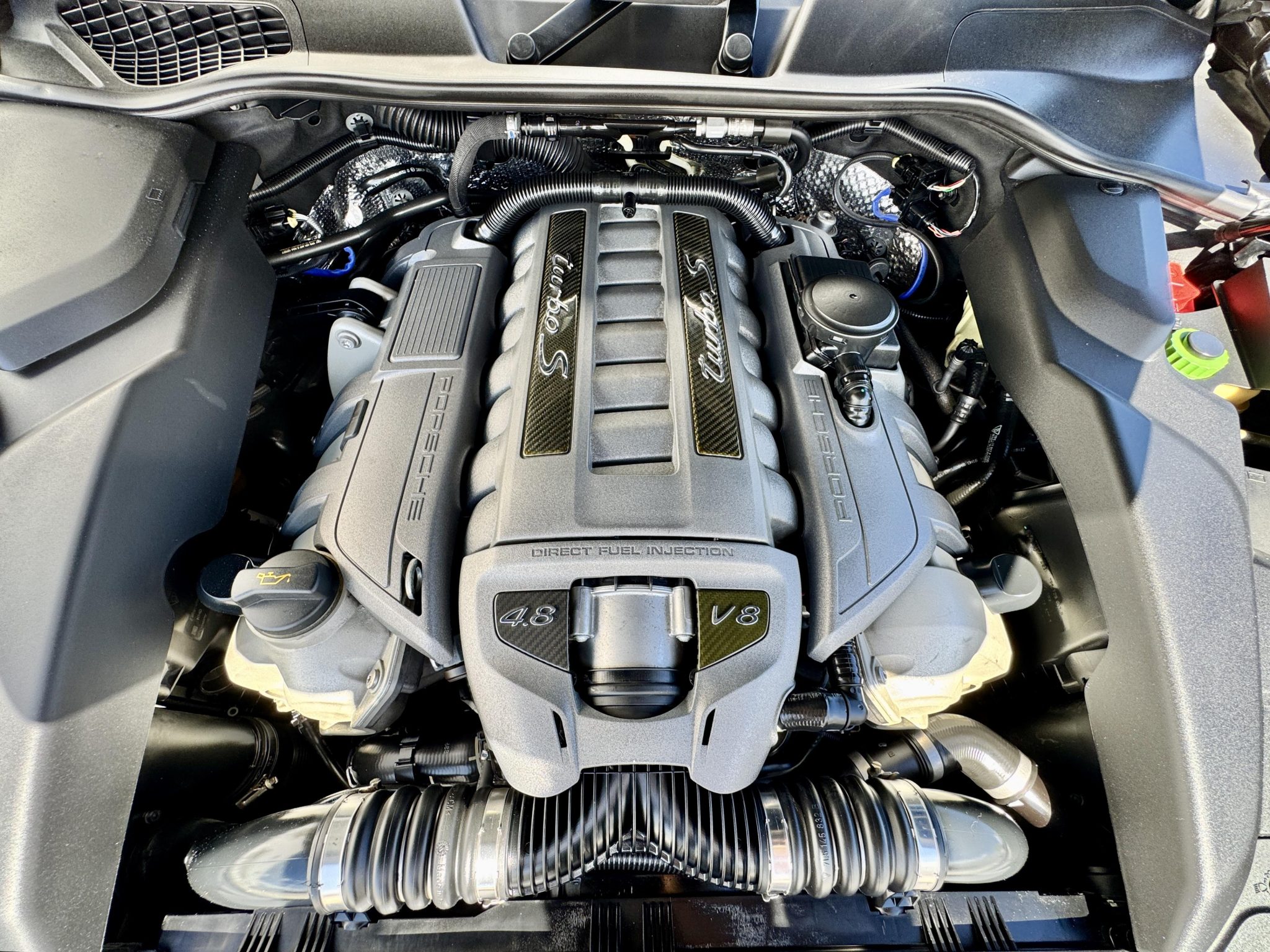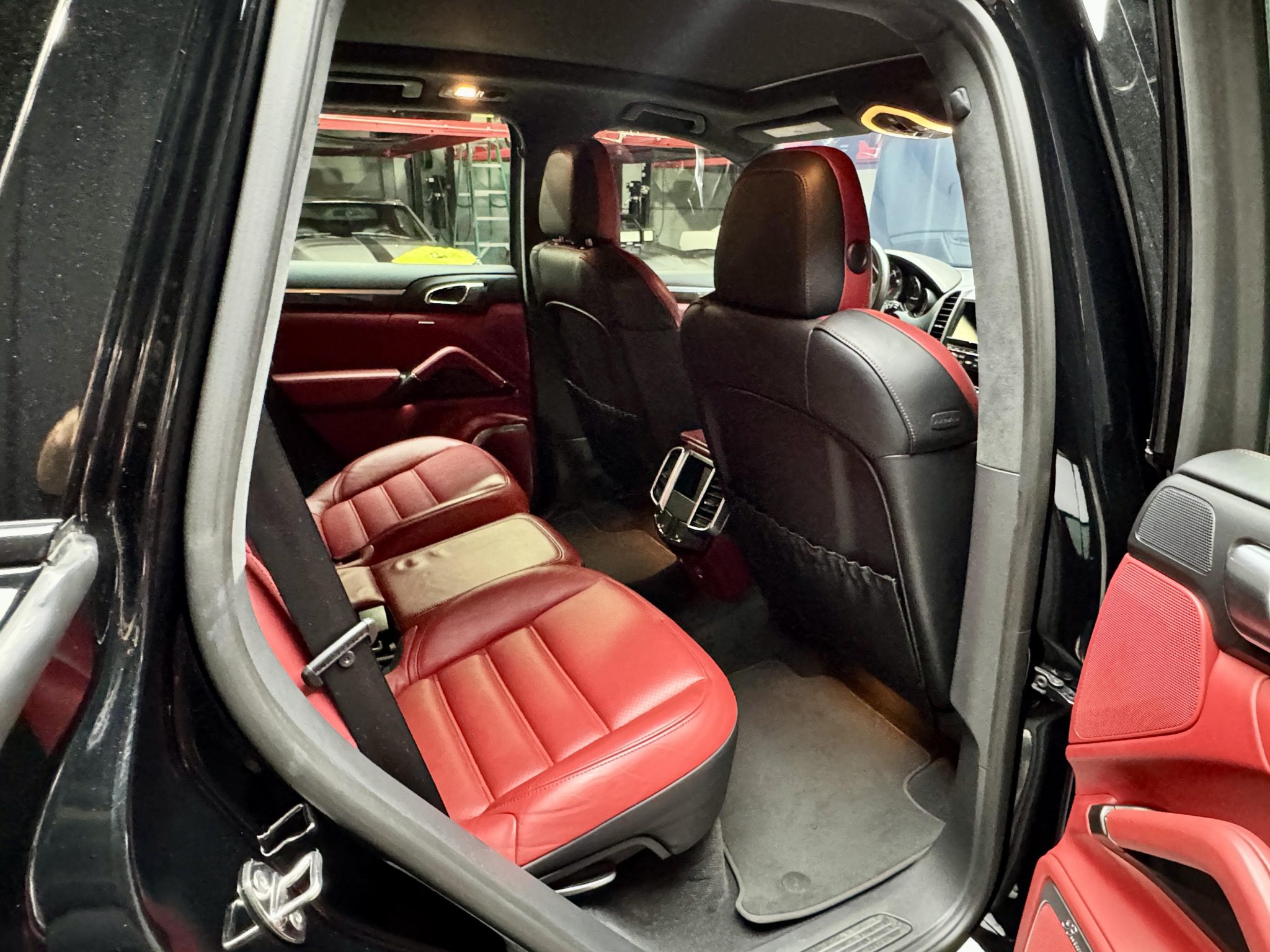 This 2014 Porsche Cayenne Turbo S is finished in Black over Carrera Red and Black leather and has 26k miles Equipment includes Burmester audio, a panoramic sunroof, running boards, 21″ Cayenne SportEdition wheels, heated front Adaptive Sport Seats, PCM with navigation, and Black xenon headlights with PDLS+. Power is provided by a 550-horsepower twin-turbocharged 4.8L V8 linked with an eight-speed Tiptronic S automatic transmission and locking center and rear differentials with PTV+.