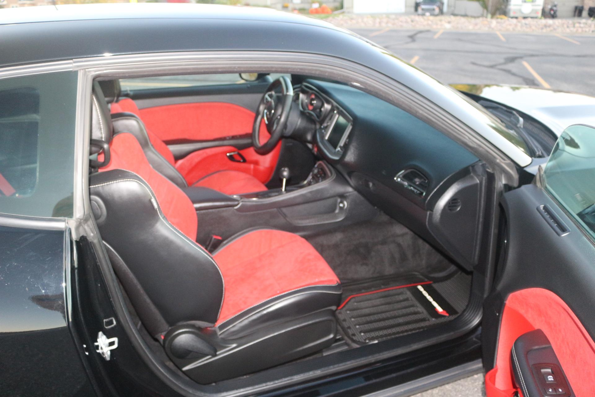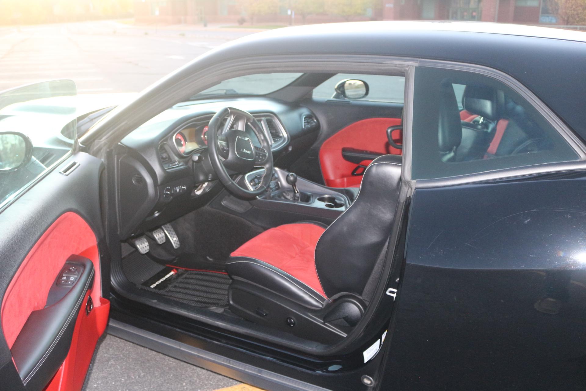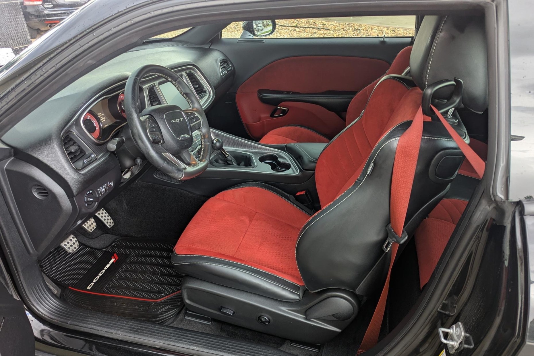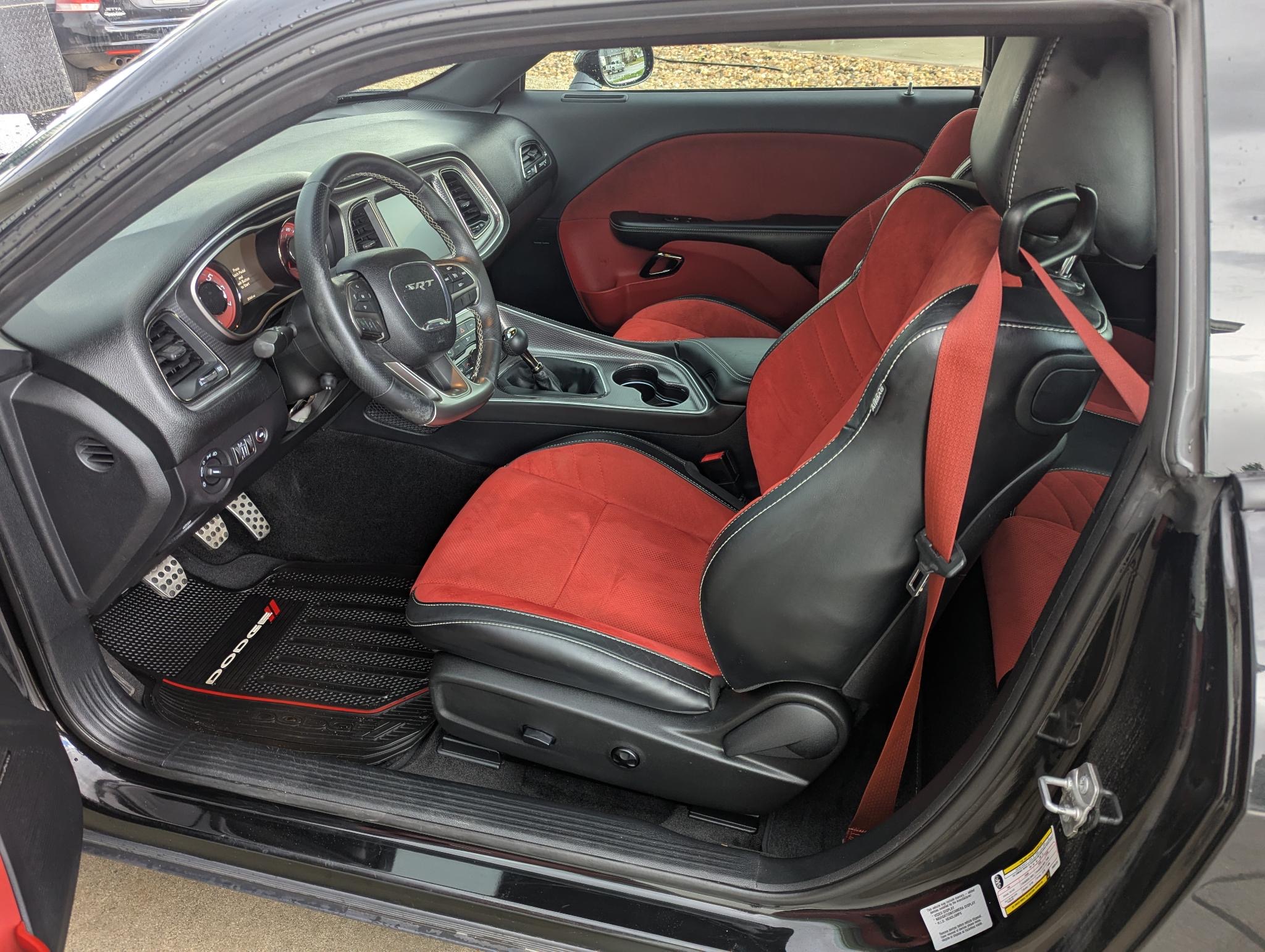 Power is provided by a supercharged 6.2-liter V8 linked to a six-speed manual transmission and a limited-slip differential, and the car is finished in Pitch Black over Black Nappa leather and Ruby Red Alcantara. Features include a rear spoiler, ParkSense rear parking sensors, Brembo brake calipers, an SRT-tuned Bilstein suspension, Matte Black 20″ forged aluminum wheels, heated and ventilated front seats, a Parkview rearview camera, a Harman Kardon sound system, and a UConnect 3C infotainment system with navigation.