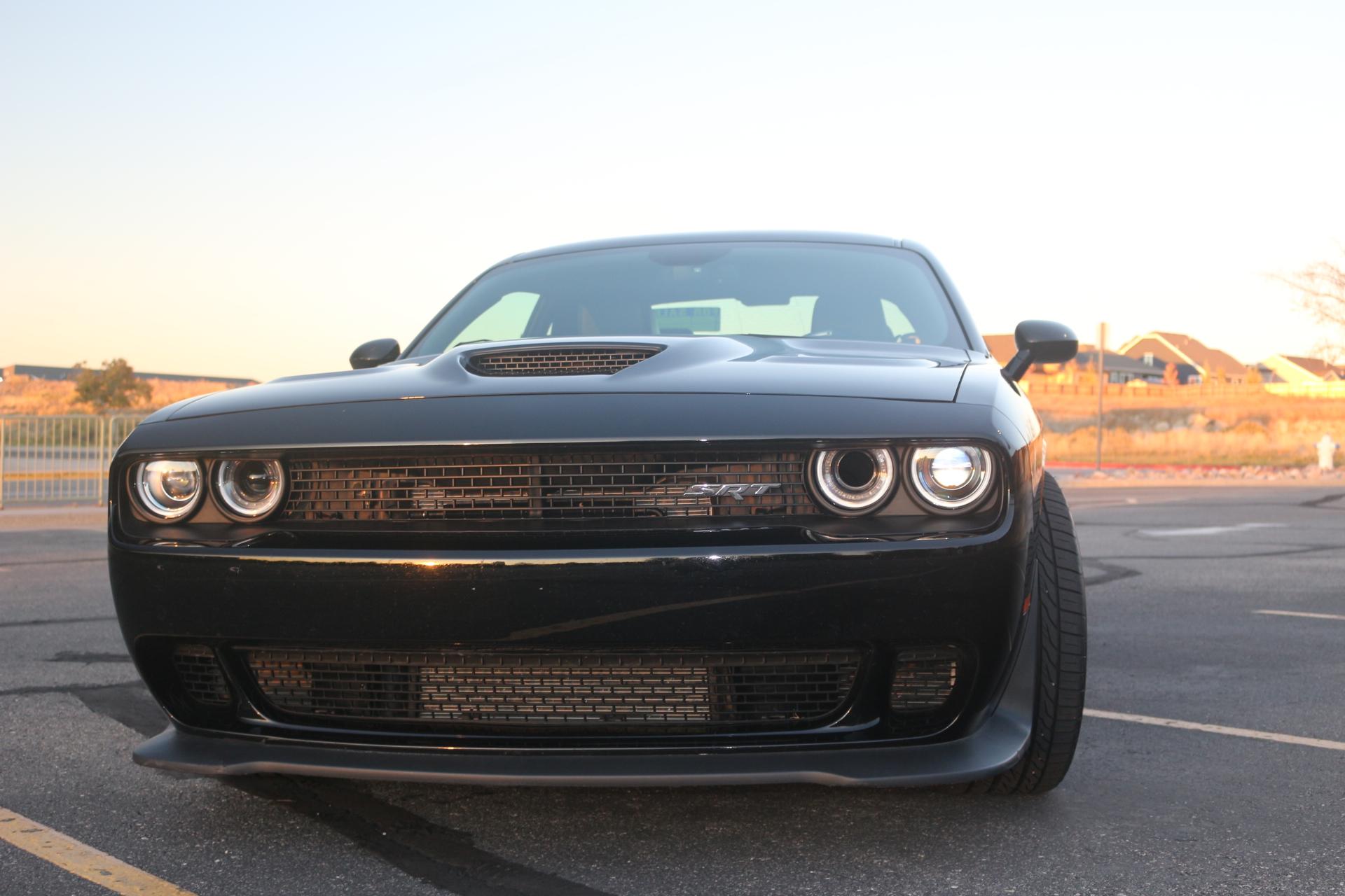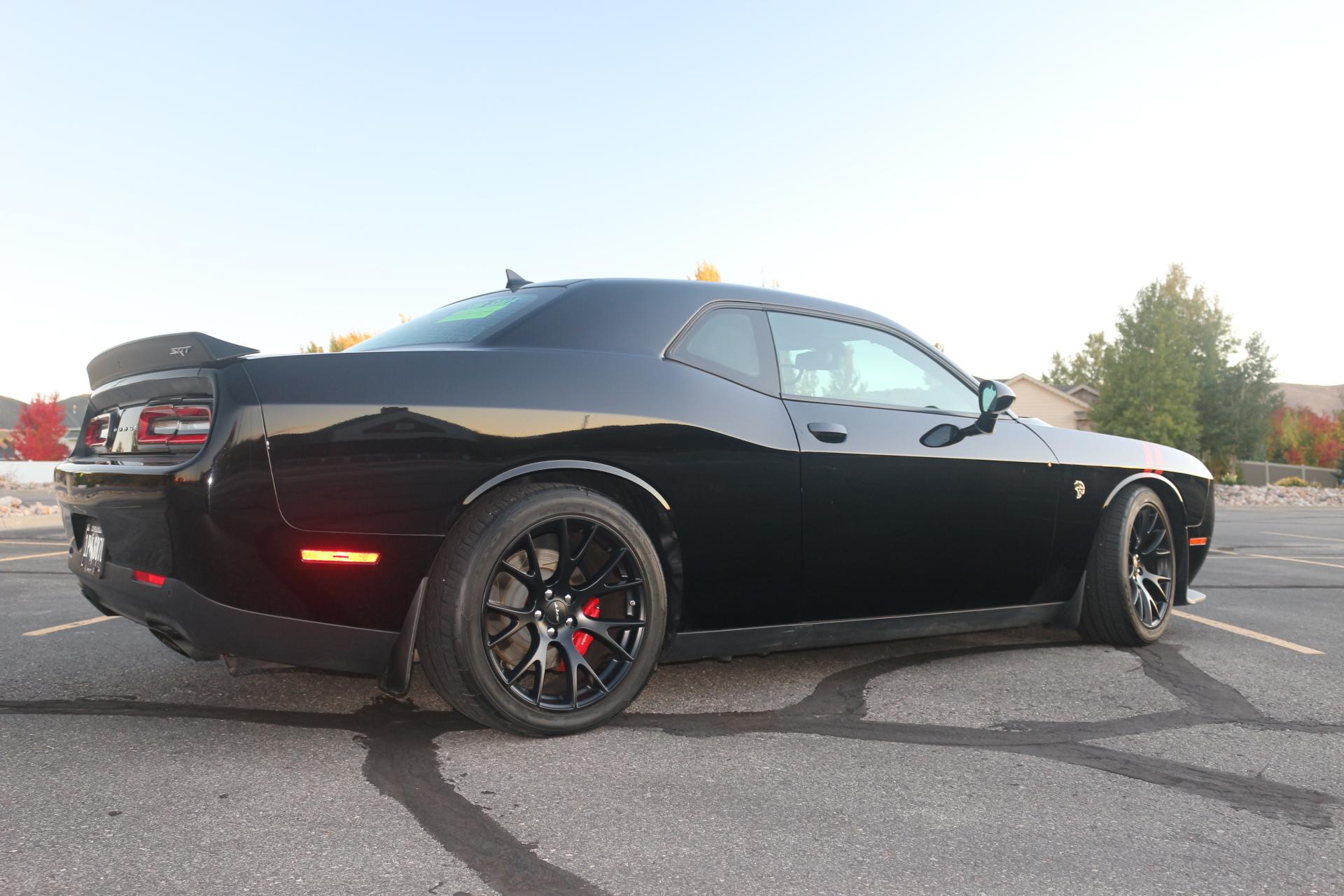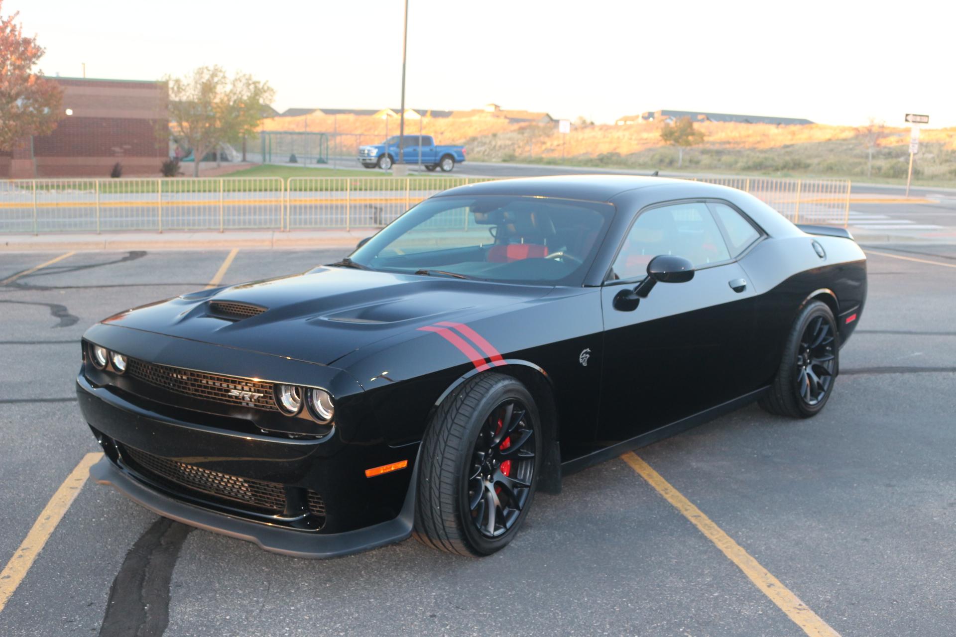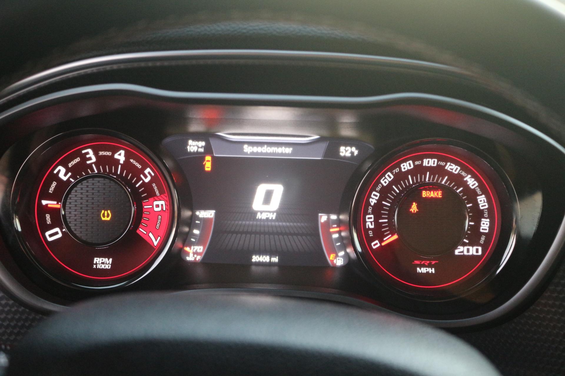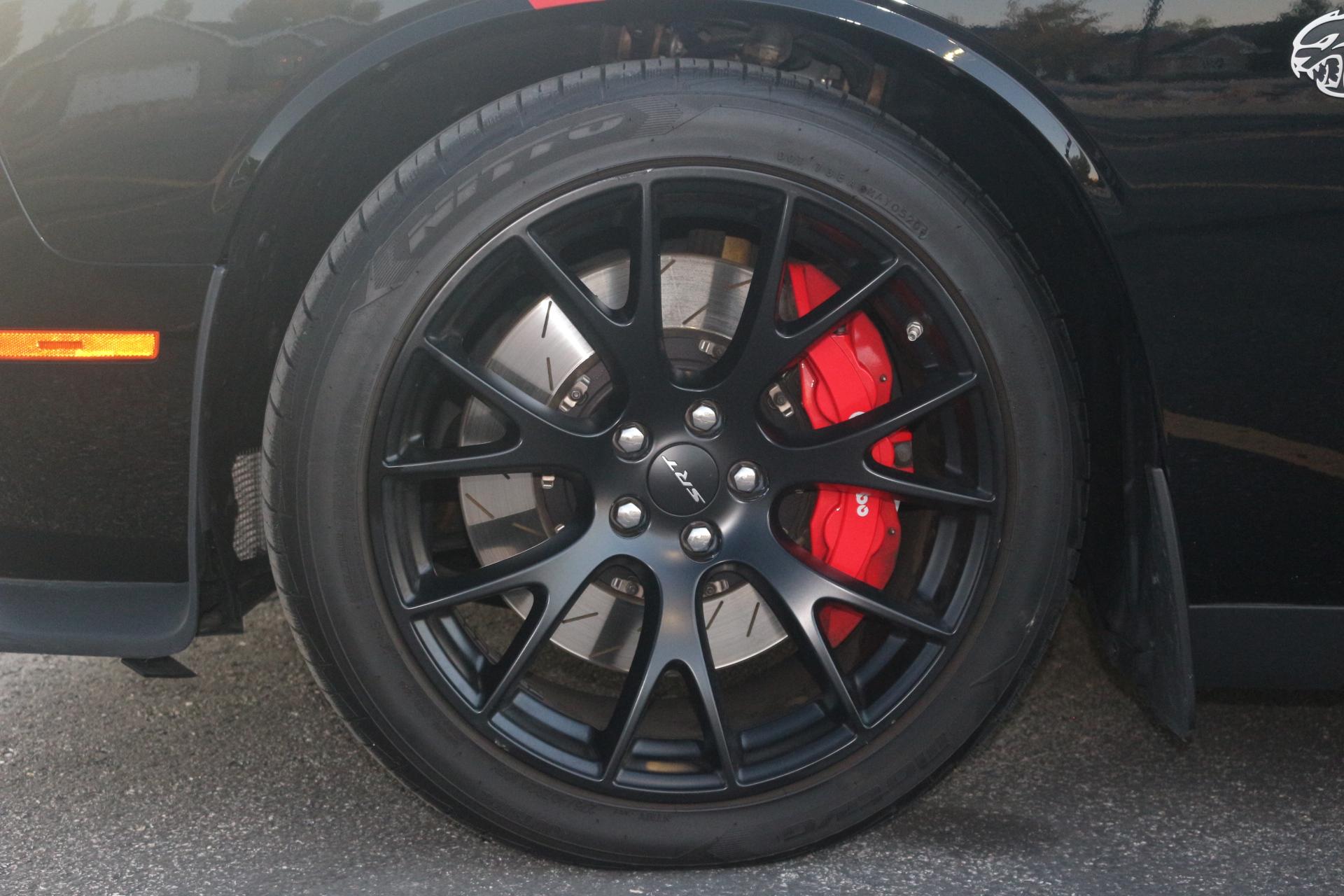 Power is provided by a supercharged 6.2-liter V8 linked to a six-speed manual transmission and a limited-slip differential, and the car is finished in Pitch Black over Black Nappa leather and Ruby Red Alcantara. Features include a rear spoiler, ParkSense rear parking sensors, Brembo brake calipers, an SRT-tuned Bilstein suspension, Matte Black 20″ forged aluminum wheels, heated and ventilated front seats, a Parkview rearview camera, a Harman Kardon sound system, and a UConnect 3C infotainment system with navigation.