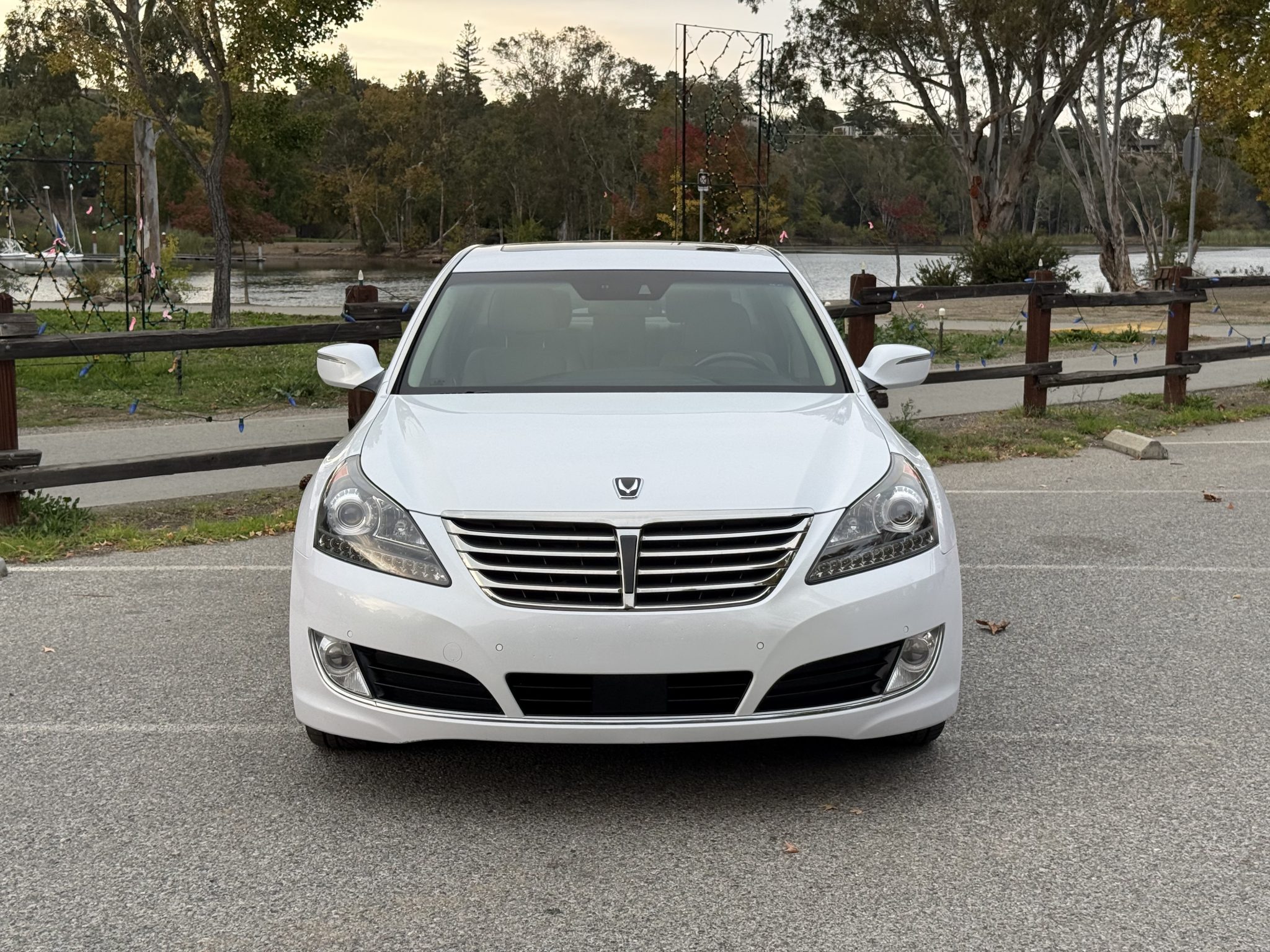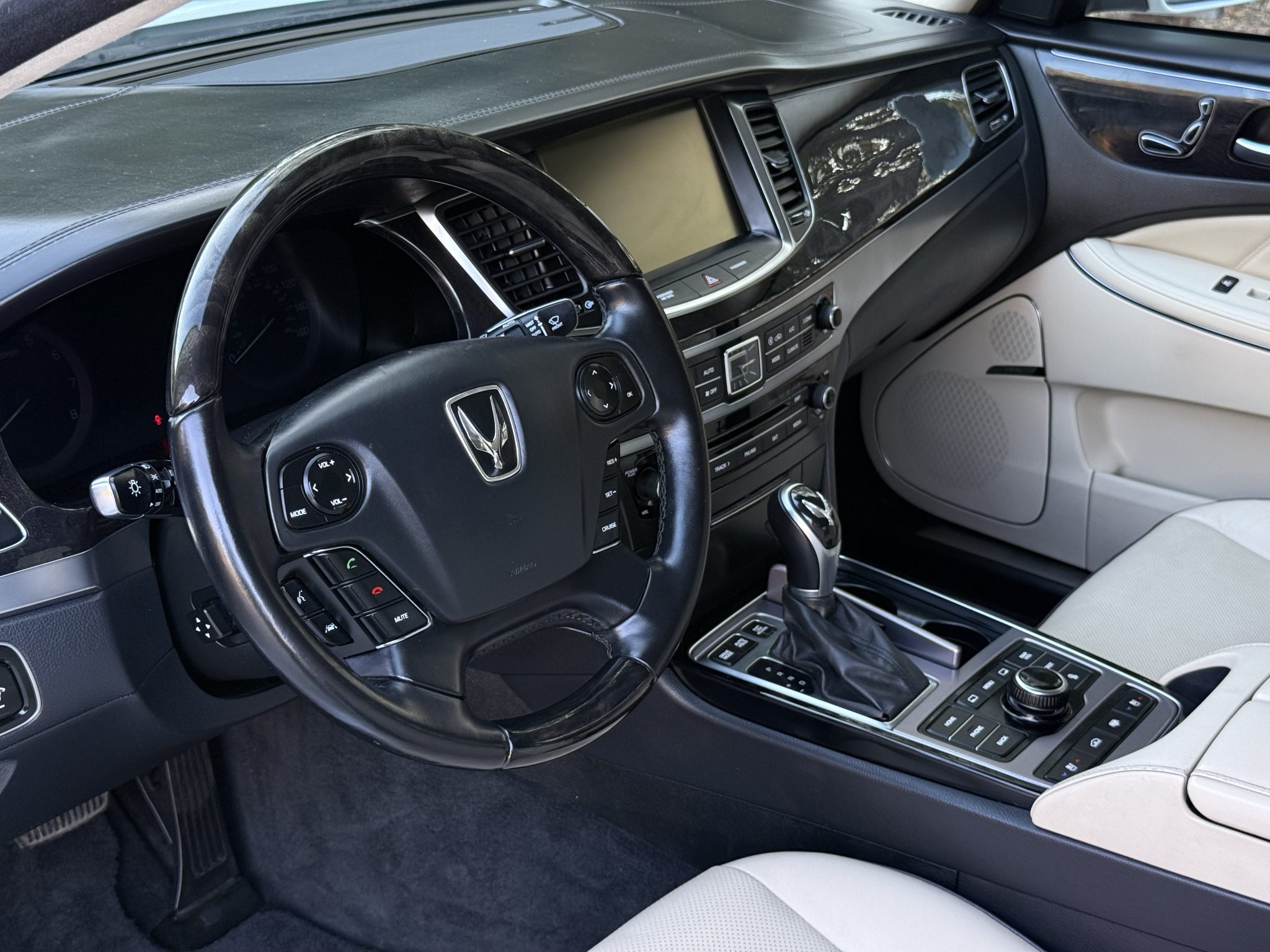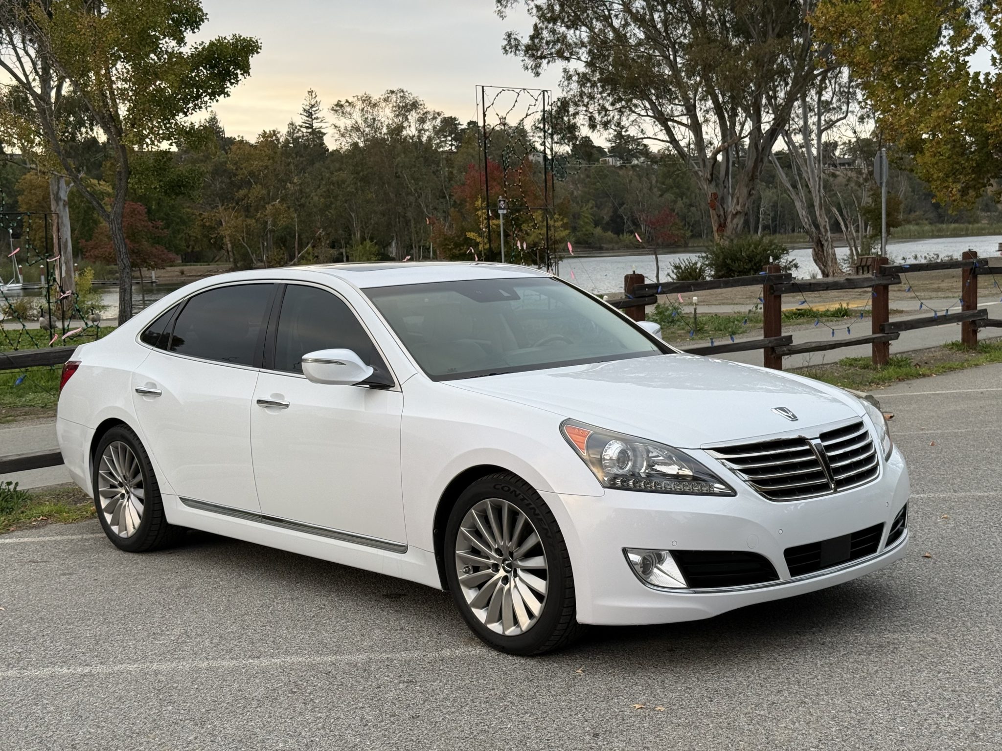 The car is finished in Casablanca White Pearl over Ivory leather, and it is powered by a 5.0-liter Tau V8 linked with an eight-speed automatic transmission. Equipment includes a power sunroof, 19″ multi-spoke alloy wheels, HID headlights, parking sensors, air suspension, wood interior trim, heated and power-adjustable seating, adaptive cruise control, tri-zone automatic climate control, a touchscreen infotainment system with navigation, and a Lexicon surround sound system.