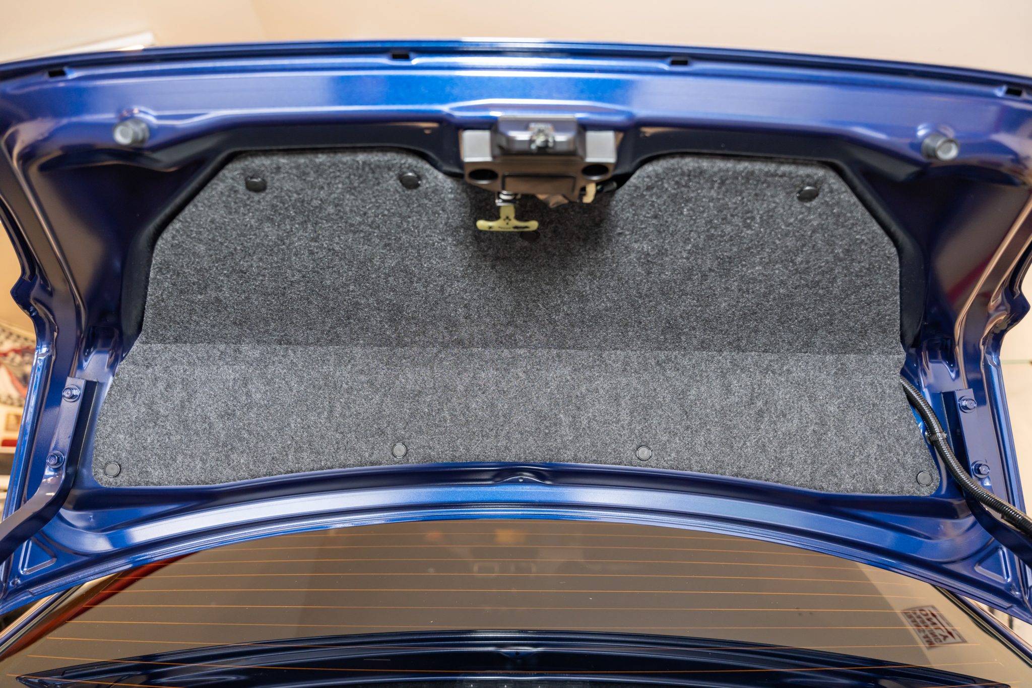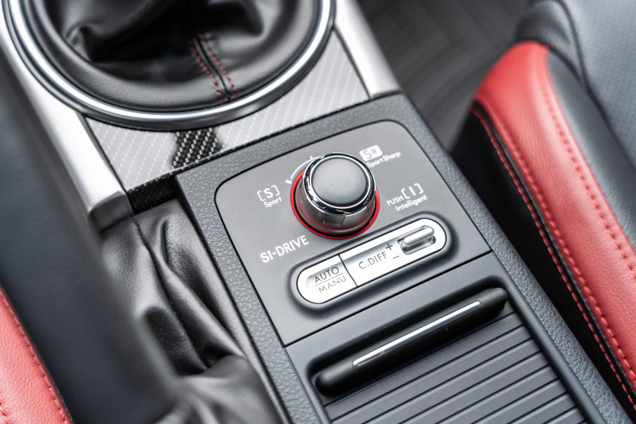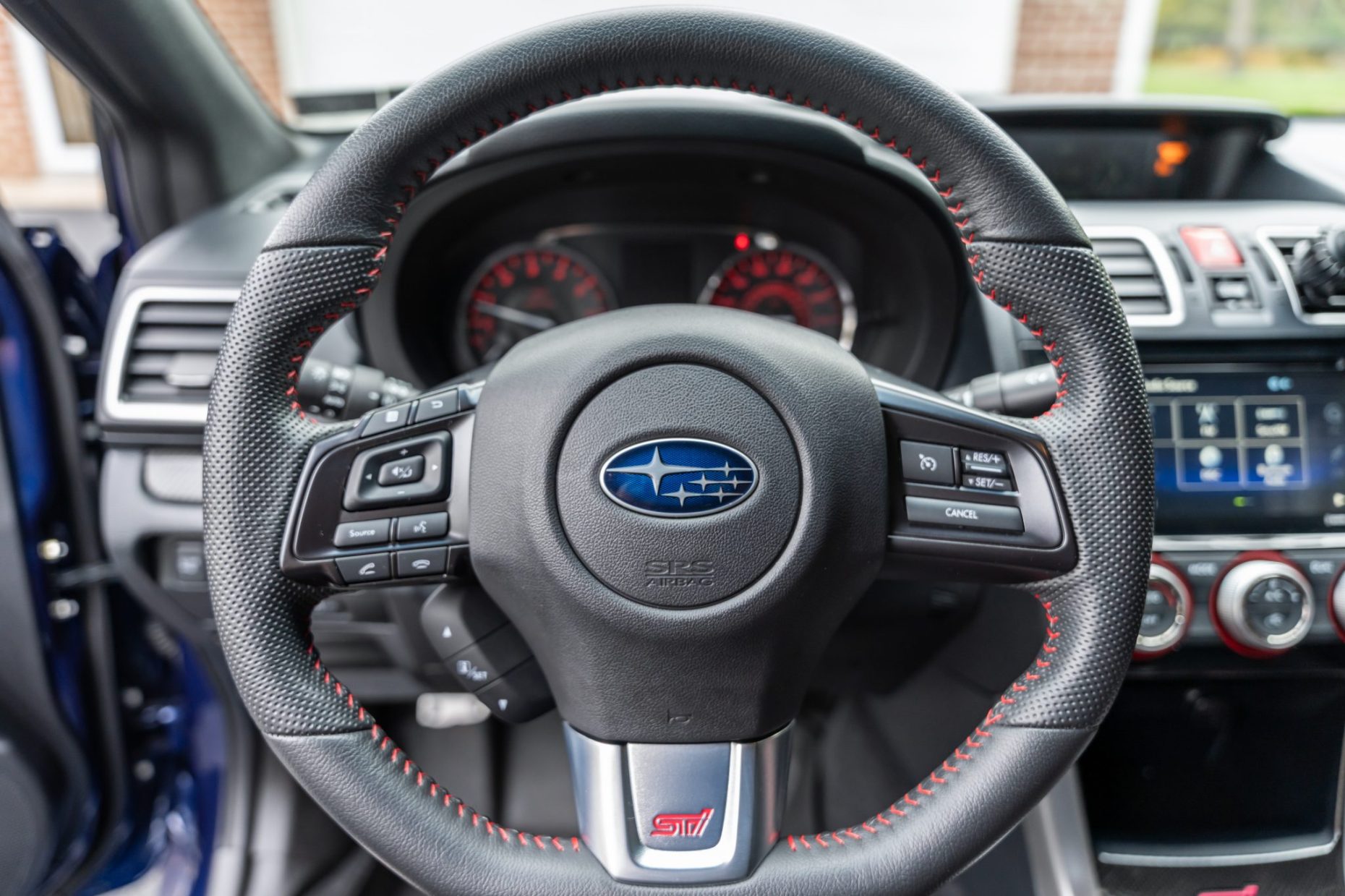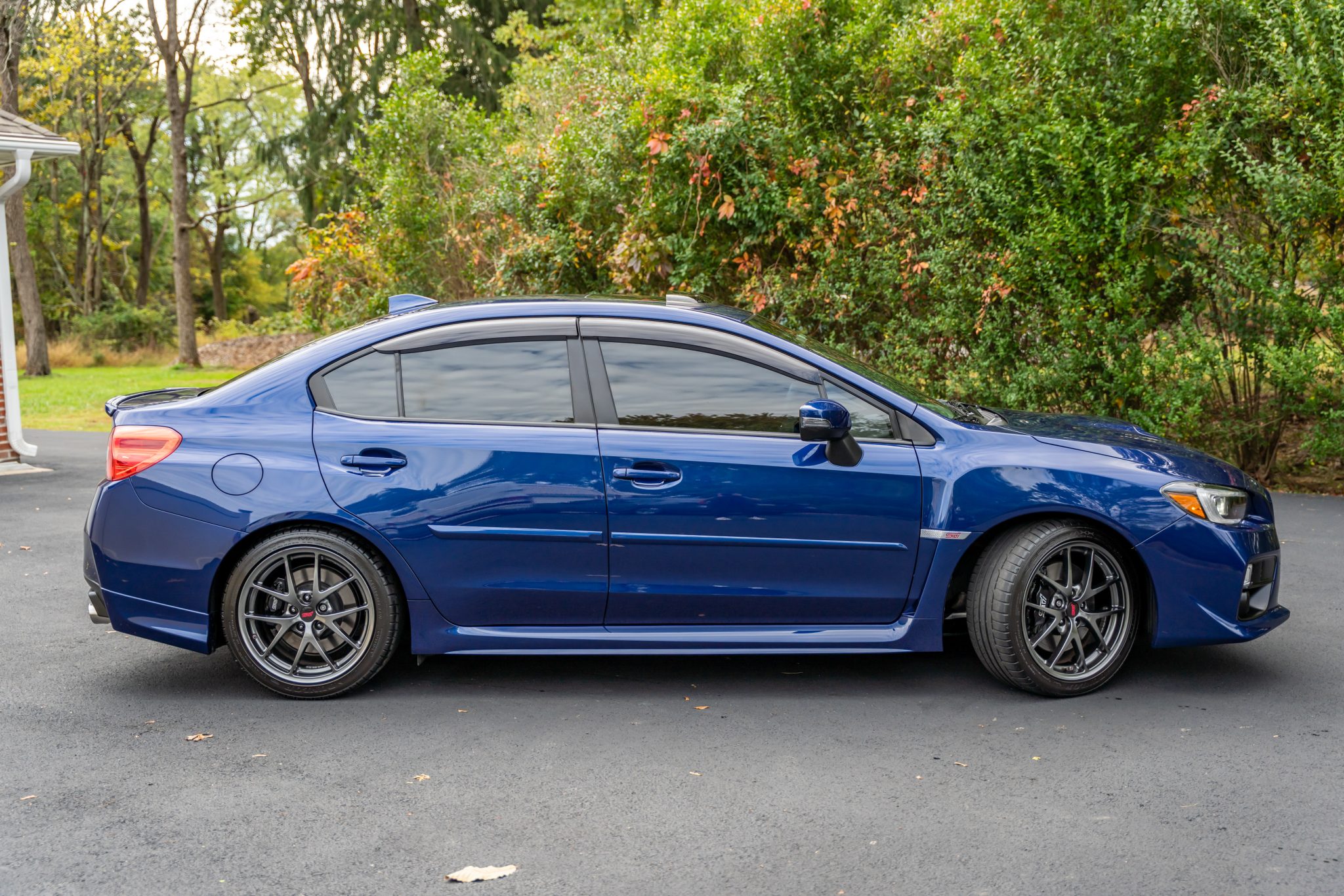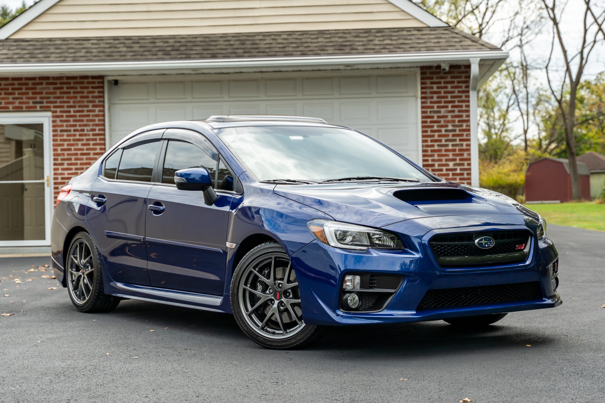 Finished in blue over black and red upholstery, it is powered by a turbocharged 2.5-liter flat-four linked with a six-speed manual transaxle, a Driver-Controlled Center Differential, and an all-wheel-drive system with limited-slip front and rear differentials. The car is equipped with a K&N intake, a sunroof, LED headlights, fog lights, Brembo brake calipers, a rear spoiler, 18″ BBS forged wheels, heated bucket front seats, a Harmon Kardon sound system, an STi short-throw shifter, a rearview camera, cruise control, and dual-zone automatic climate control.