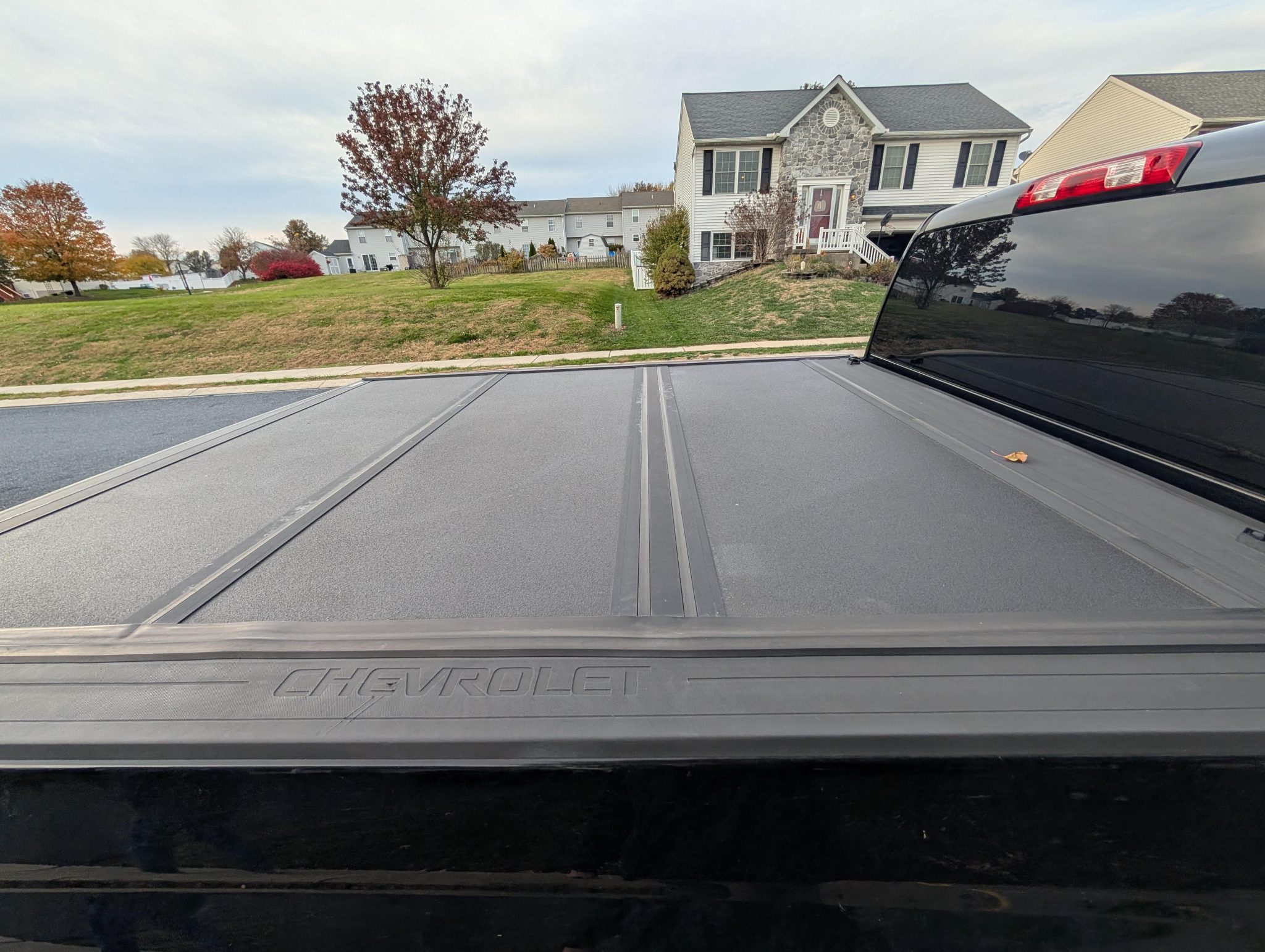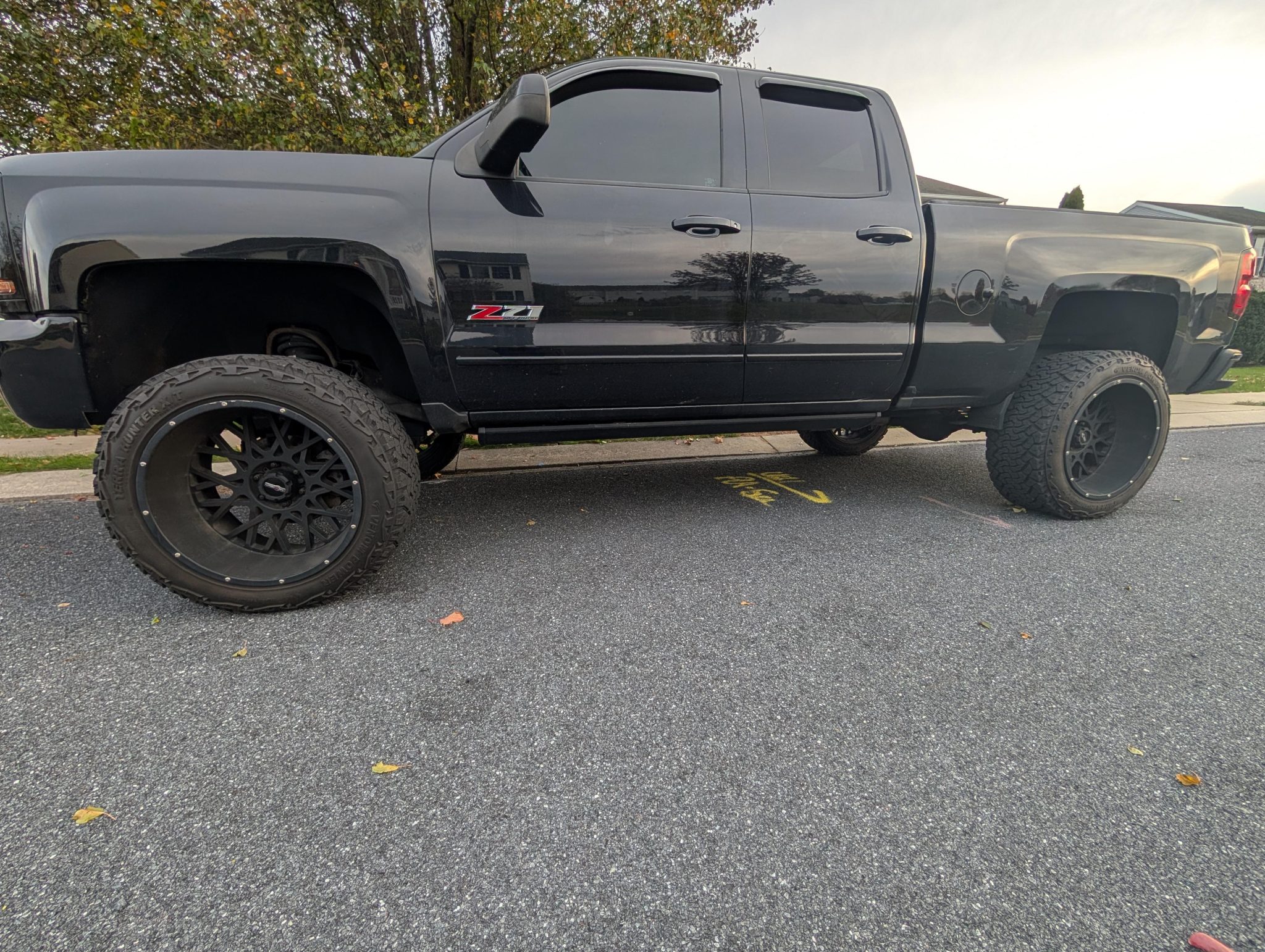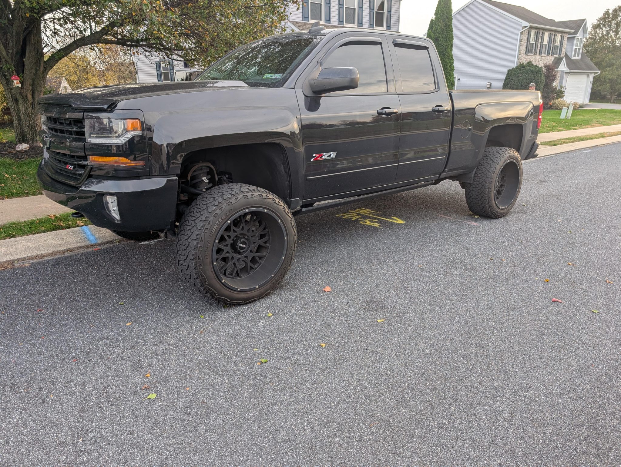 This 2017 Chevrolet Silverado 1500 LT Z71 double cab is a Black Out Edition pickup that rides on a BDS suspension lift kit coupled with Fox shock absorbers as well as 22″ Vision alloy wheels wearing 35″ tires. Power comes from a 5.3-liter EcoTec V8 linked to a replacement six-speed automatic transmission, a dual-range transfer case, and an automatic locking rear differential, and the truck is finished in black over Jet Black cloth upholstery. Additional equipment includes AMP Research side steps, a hardshell tonneau cover, a spray-on bedliner, and black bowtie emblems as well as dual-zone automatic climate control, cruise control, touchscreen infotainment, navigation, a cat-back Borla exhaust system, and a revised air intake assembly