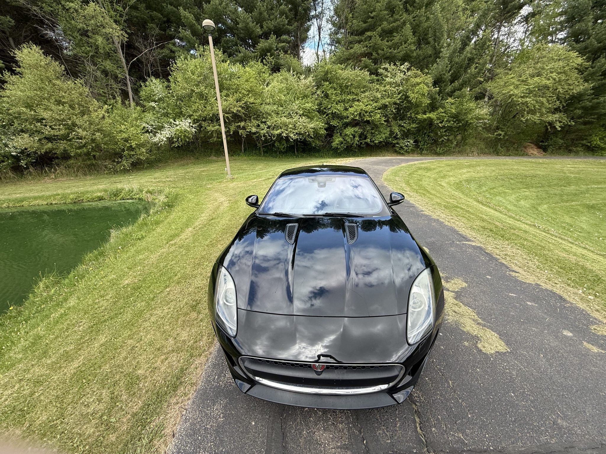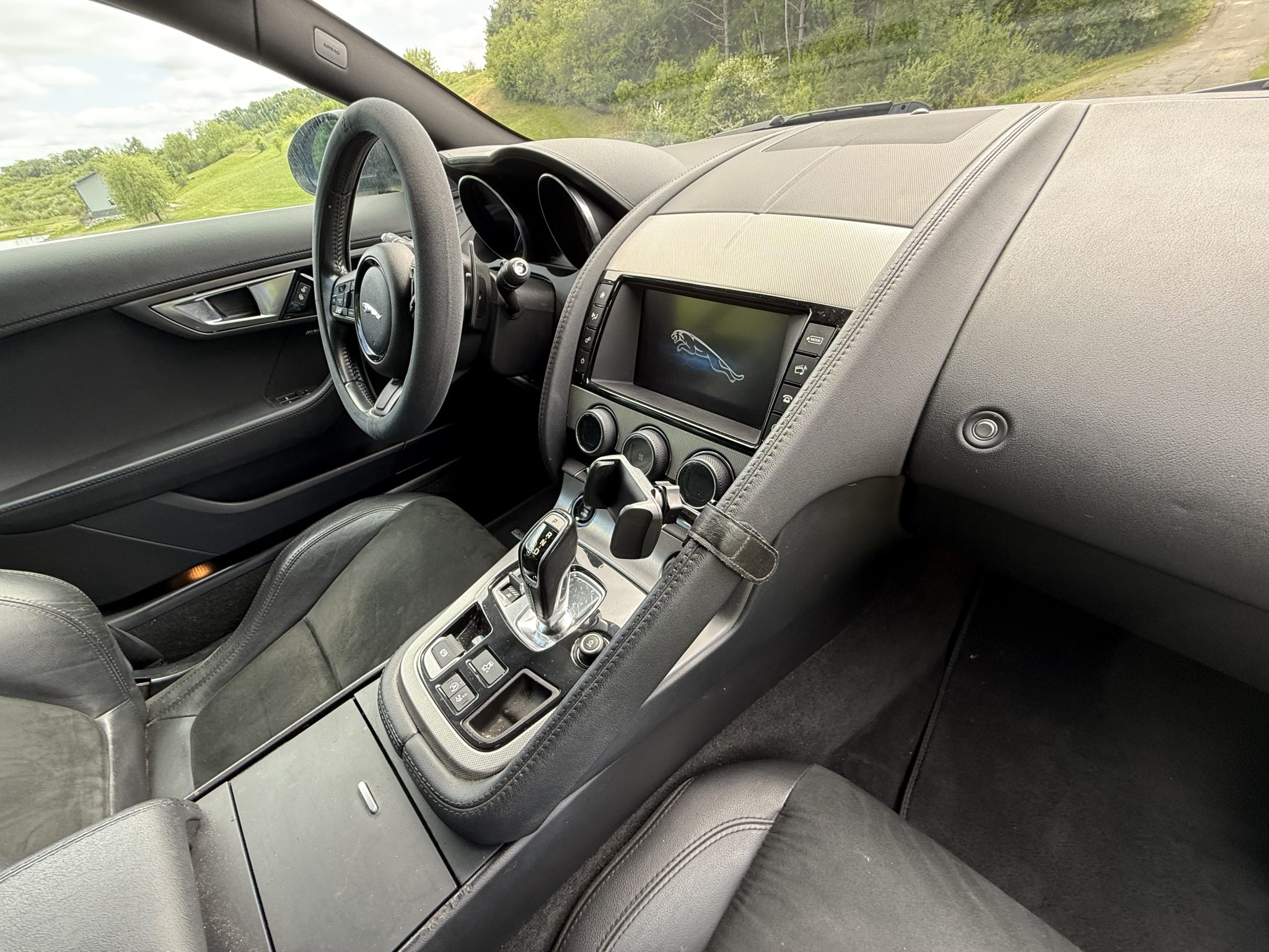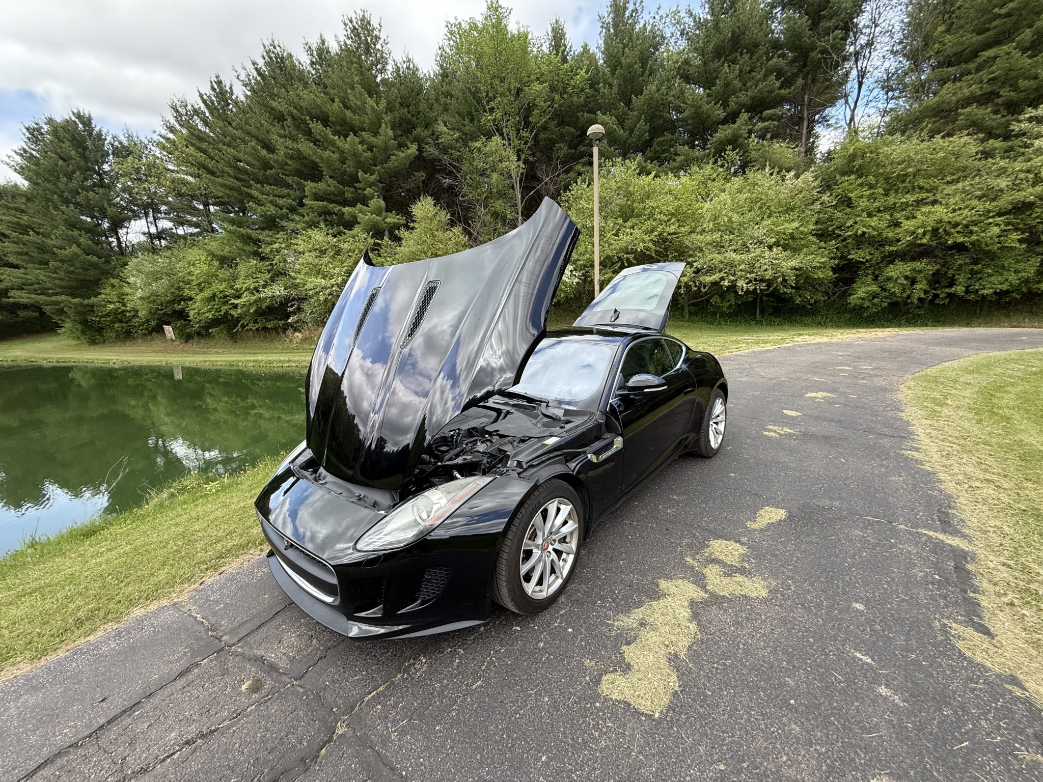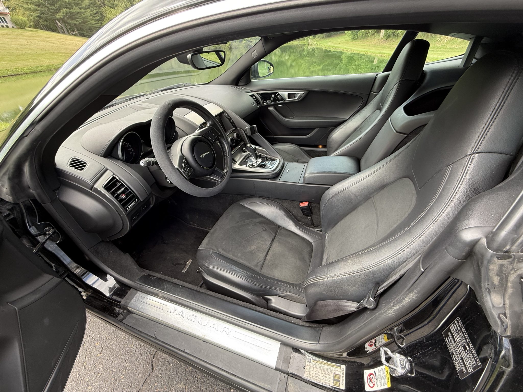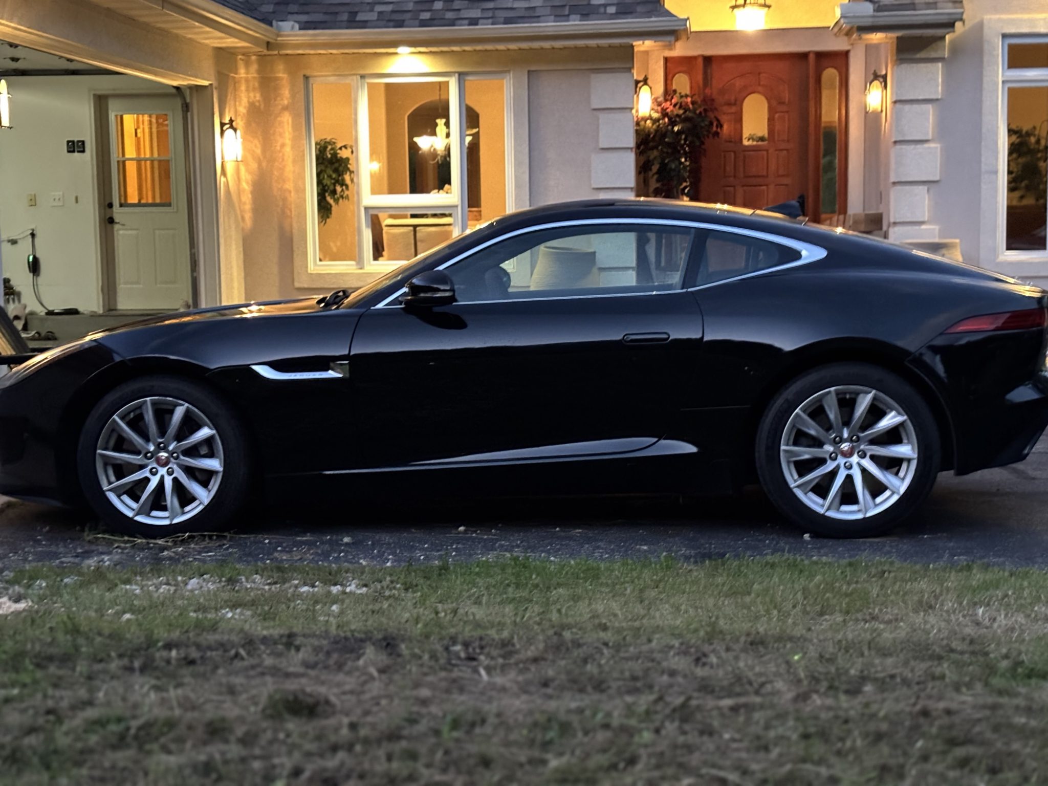 This 2017 Jaguar F-Type coupe is finished in Ebony Black over Jet leather and Suedecloth and is powered by a supercharged 3.0-liter V6 paired with an eight-speed automatic transmission. Equipment includes a Meridian sound system, 18″ Vela wheels, a rearview camera, and a deployable rear spoiler.