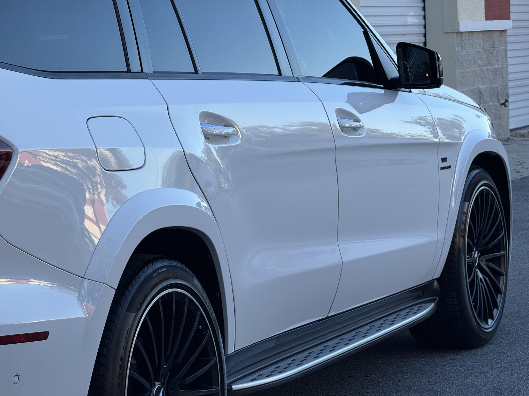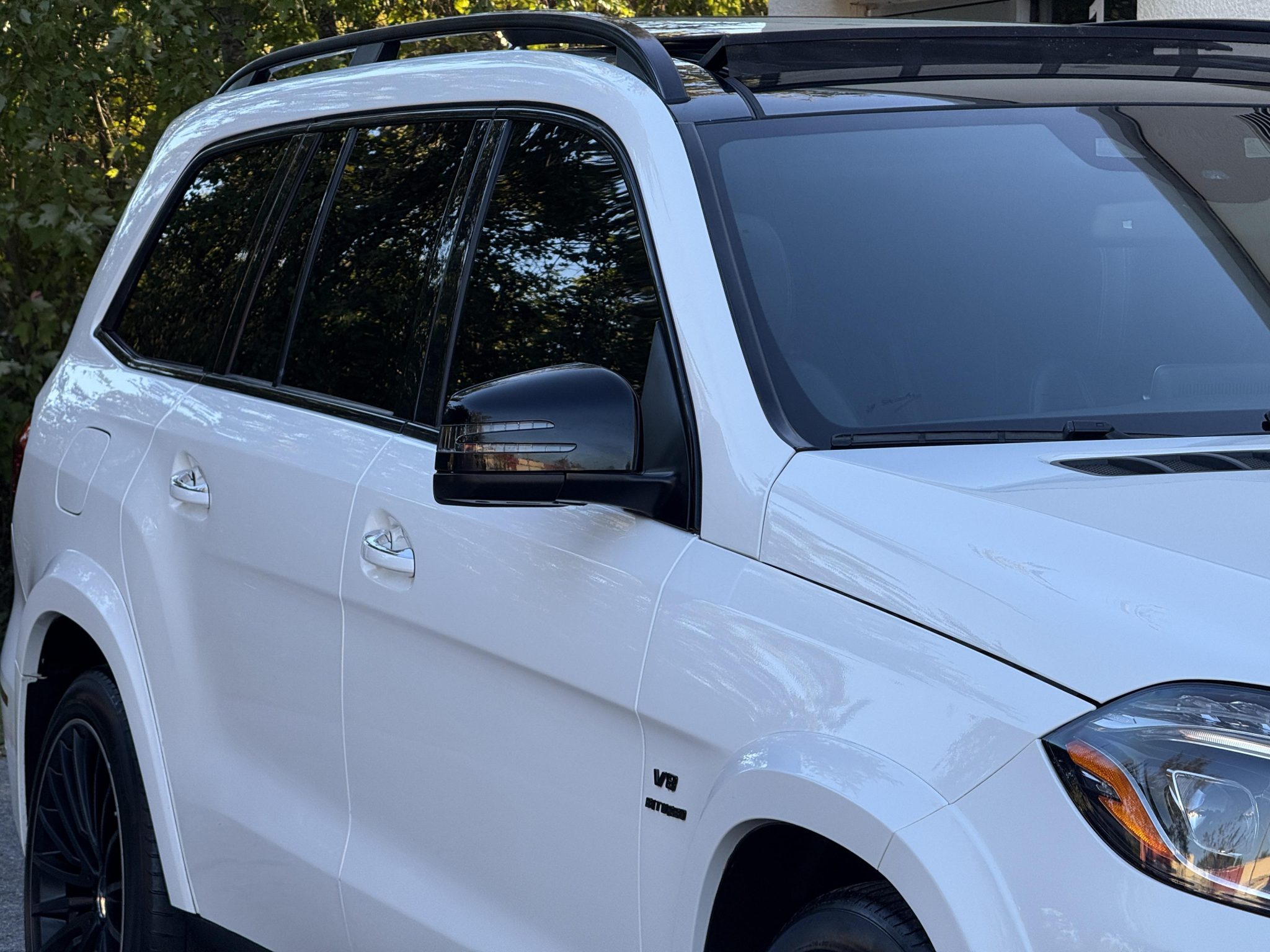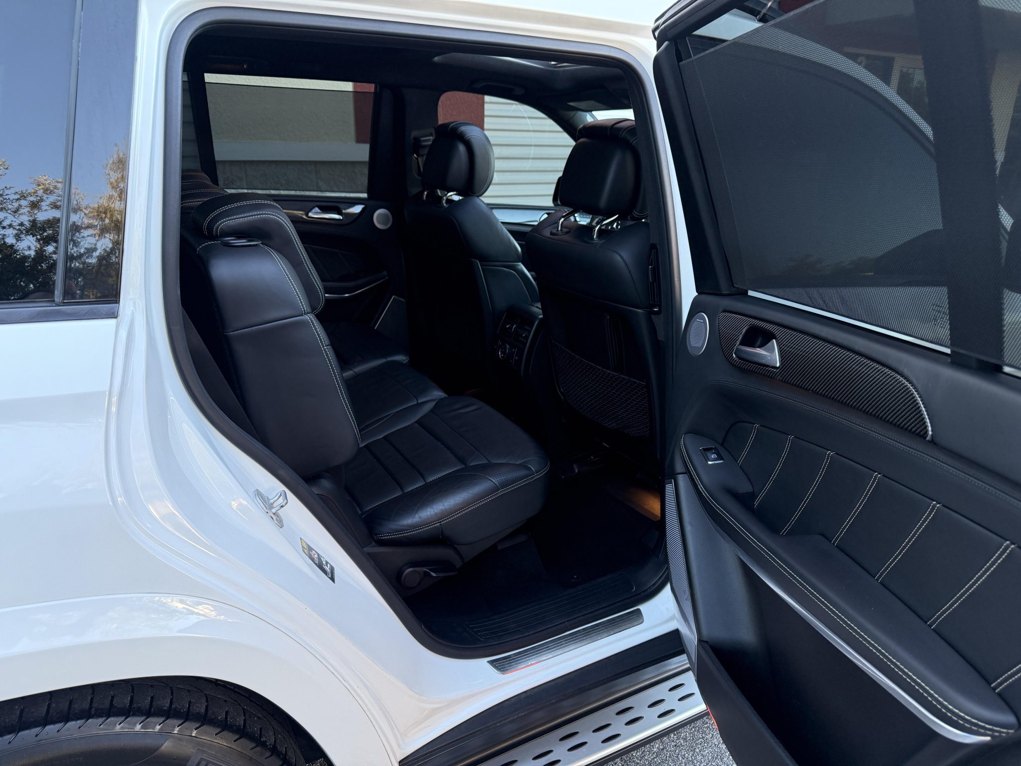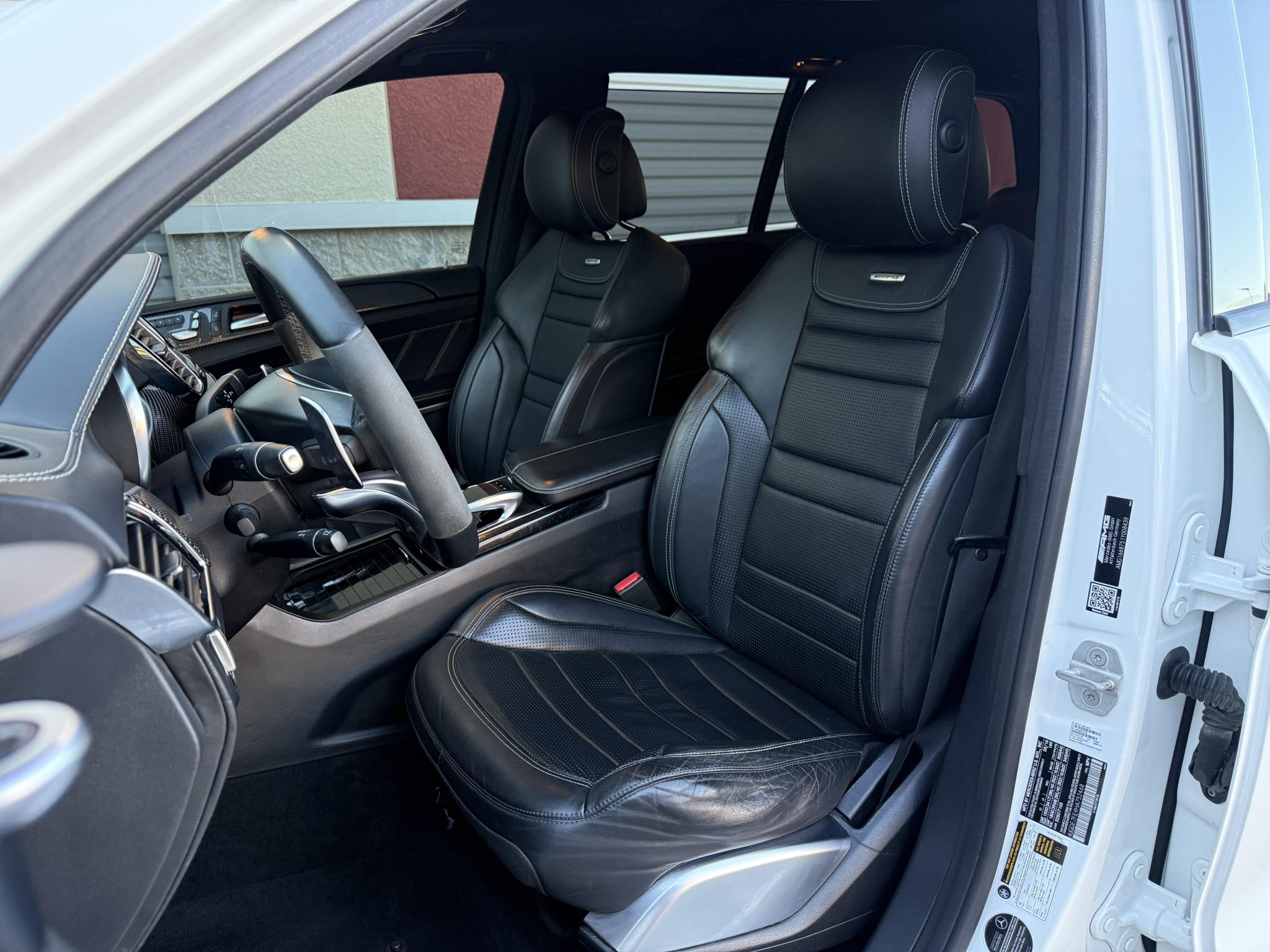powered by a twin-turbocharged 5.5-liter V8 linked with a seven-speed automatic transmission and a 4MATIC all-wheel-drive system. Finished in Polar White over Black AMG Exclusive Nappa leather, it is equipped with the Premium, Lighting, Driver Assistance, Parking Assist, and Night packages, which together provided active LED headlights, 22″ black AMG wheels, Keyless Go, a Surround View camera system, Distronic Plus adaptive cruise control, Active Blind Spot Assist, and Active Lane Keeping Assist. Additional details include a panoramic sunroof, soft-close doors, multi-contour front seats, heated second-row seats, and a Bang & Olufsen BeoSound system.