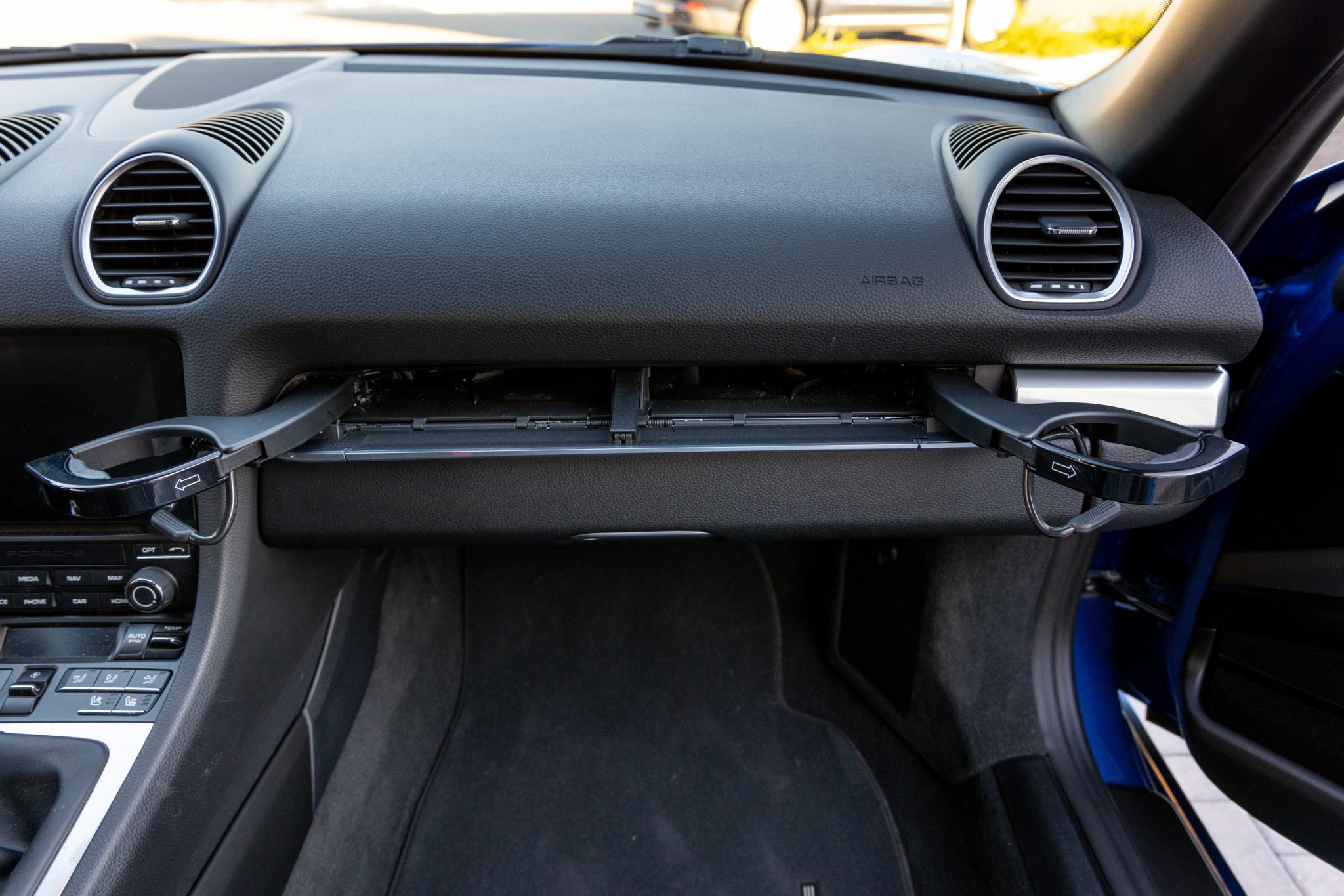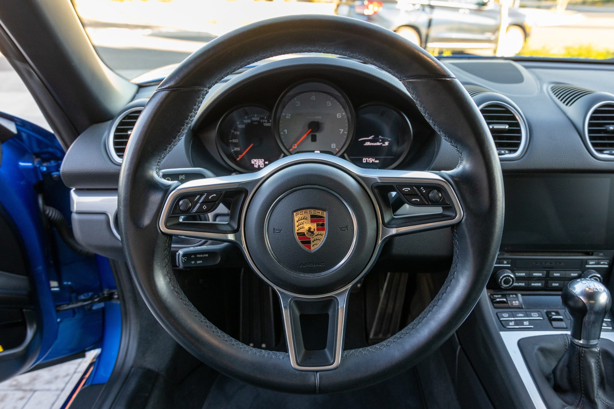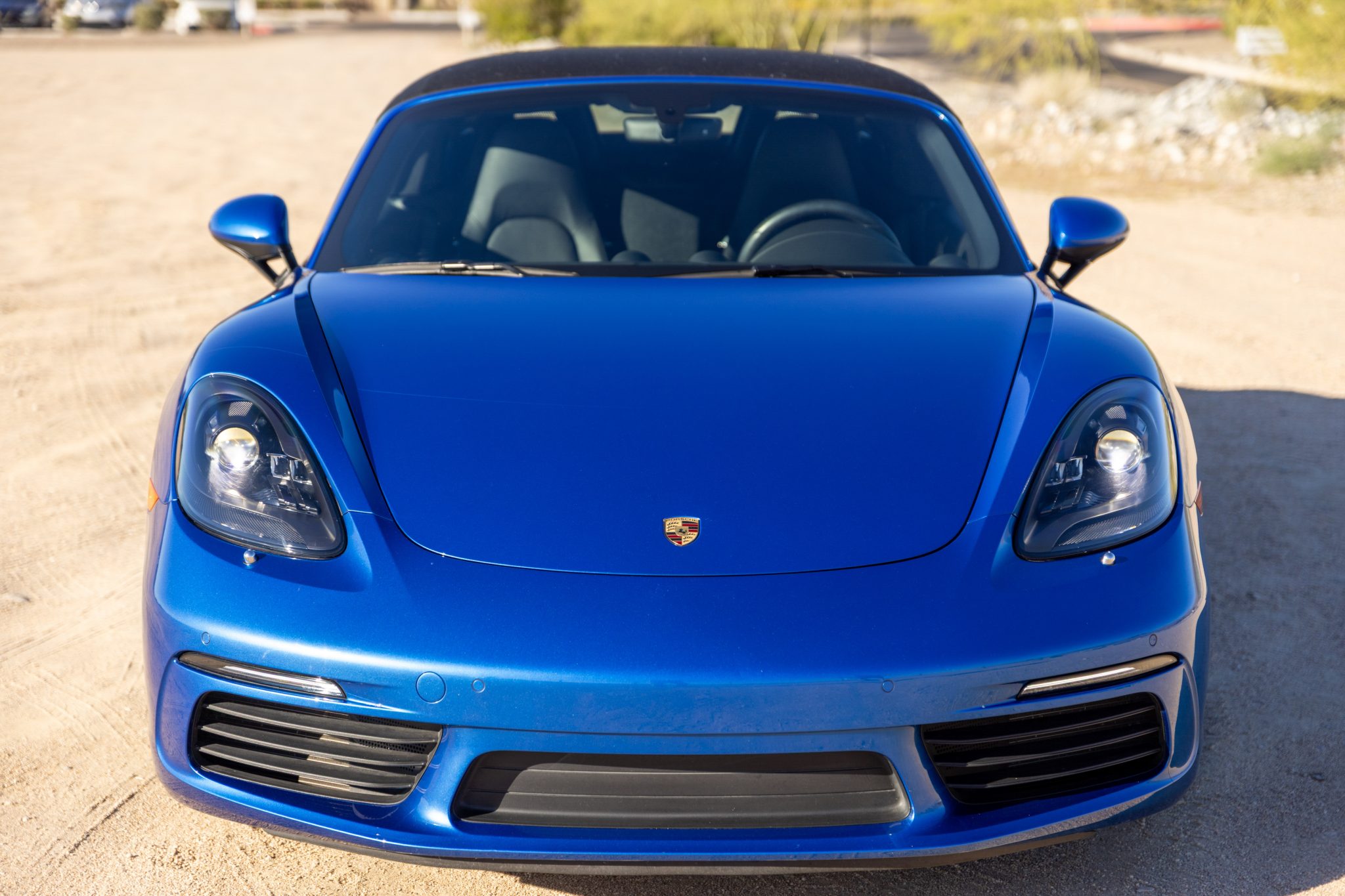 This 2018 Porsche 718 Boxster S is finished in Sapphire Blue Metallic over Black Standard leather and is powered by a turbocharged 2.5-liter flat-four paired with a six-speed manual transaxle. Equipment includes the Premium Plus and Light Design packages as well as a Sport exhaust, 20″ Carrera S wheels, heated and ventilated power seats, Bose surround sound, a heated steering wheel, a Black soft top, PCM with navigation, and xenon headlights with PDLS