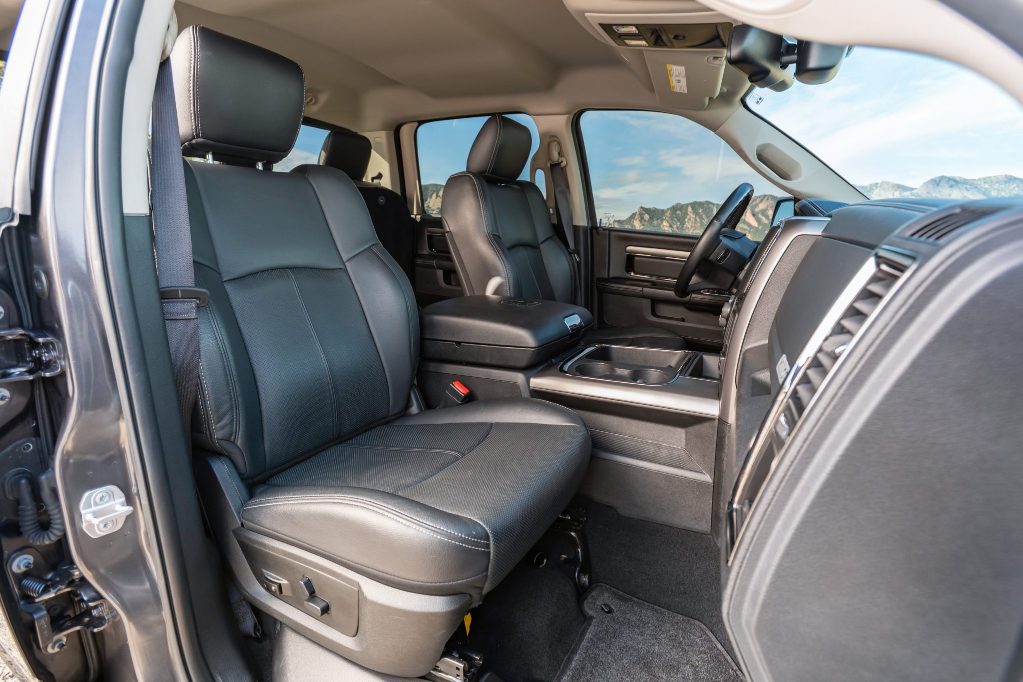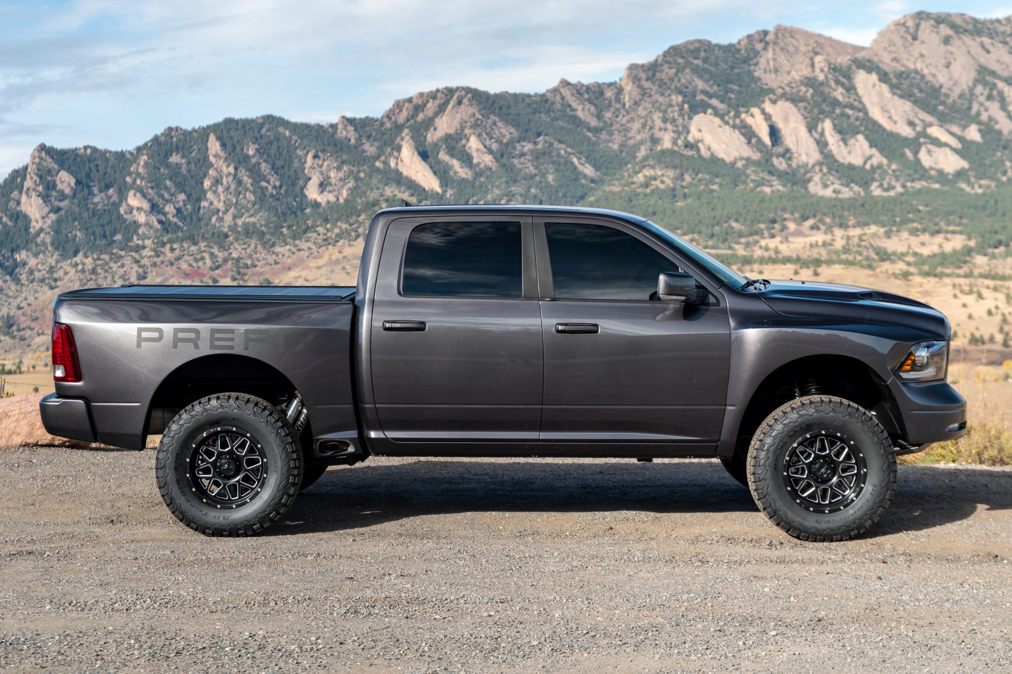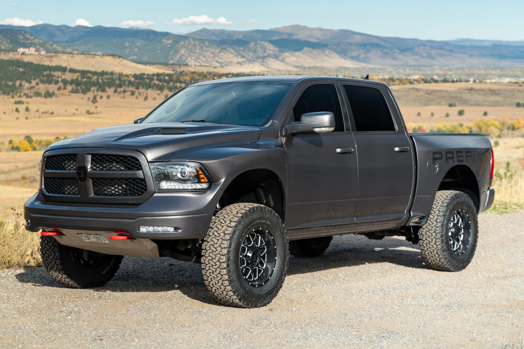 This 2018 Ram 1500 Sport is a Crew Cab 4×4 pickup The pre-runner-style conversion included the addition of a Procharger supercharger for the 5.7-liter Hemi V8, side-exit exhaust, wide-body fender flares, an aluminum skid plate, and KORE Tactical suspension with 14″ of travel and 3″ Fox internal-bypass shocks. The truck is finished in Granite Crystal Metallic over black perforated leather, and additional equipment includes an eight-speed automatic transmission, a dual-range transfer case, a limited-slip rear differential, the Convenience Group, heated and ventilated front seats, a heated steering wheel, a sliding rear window, a retractable tonneau cover, a receiver hitch, 18″ wheels, navigation, automatic climate control, and cruise control.