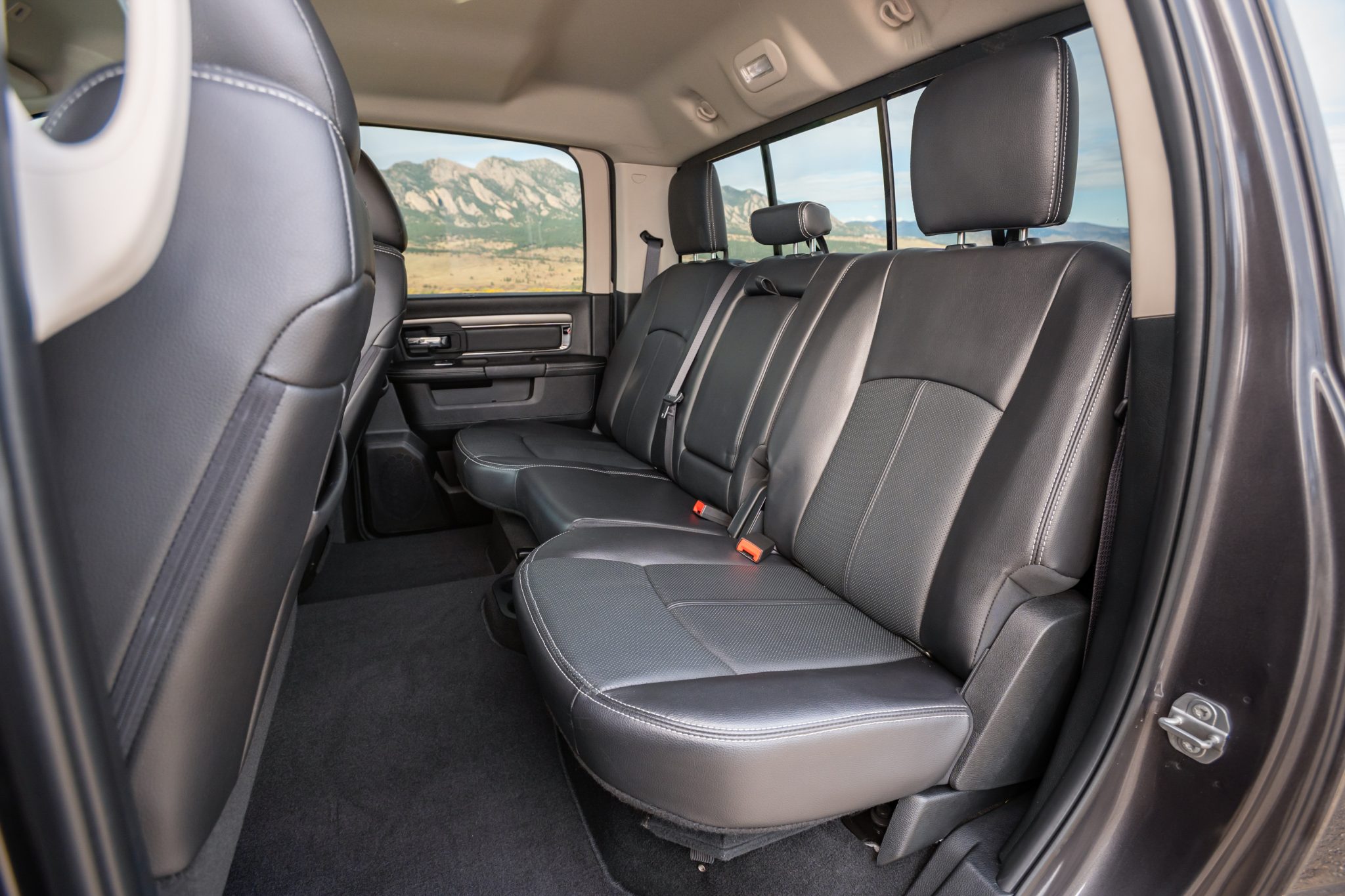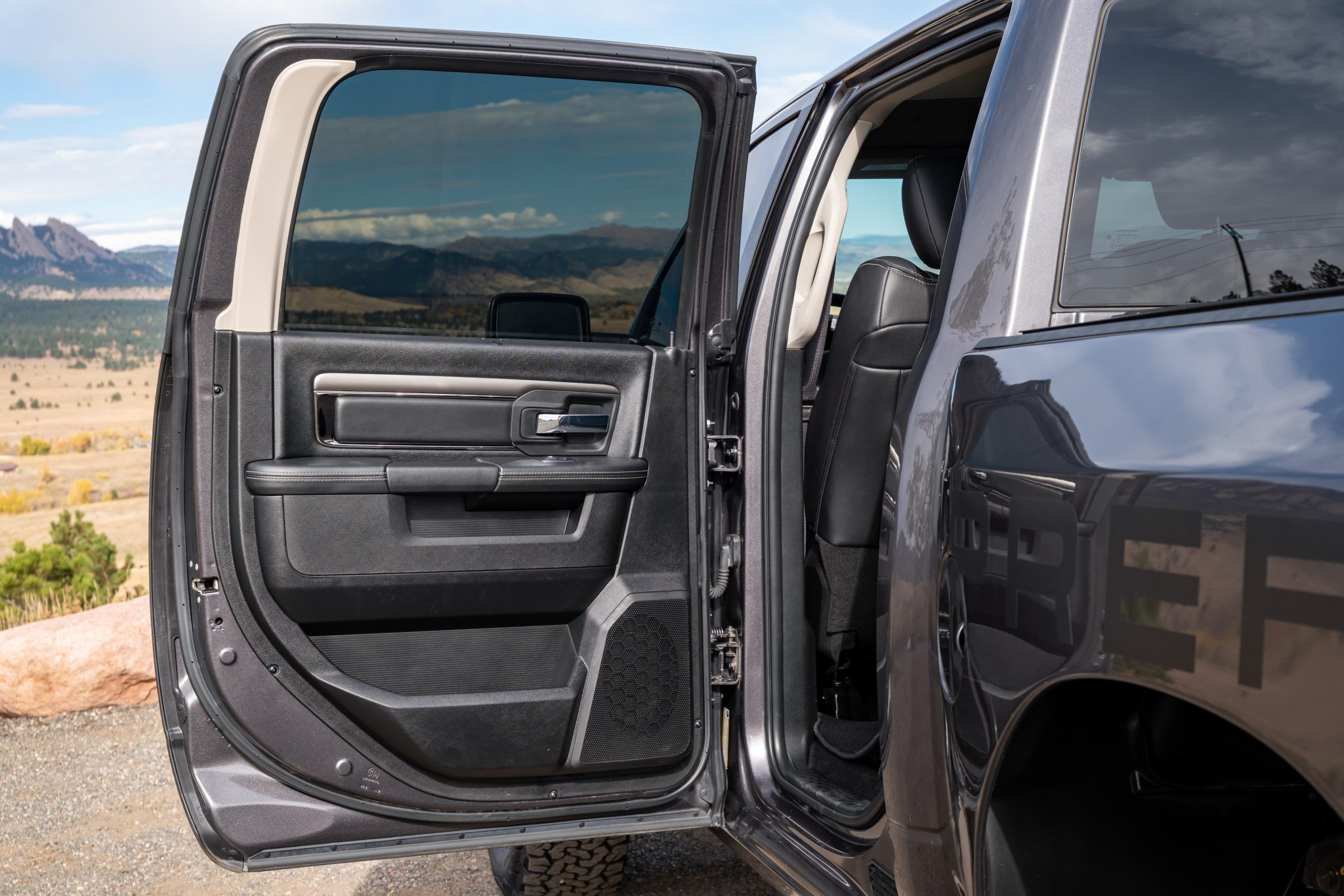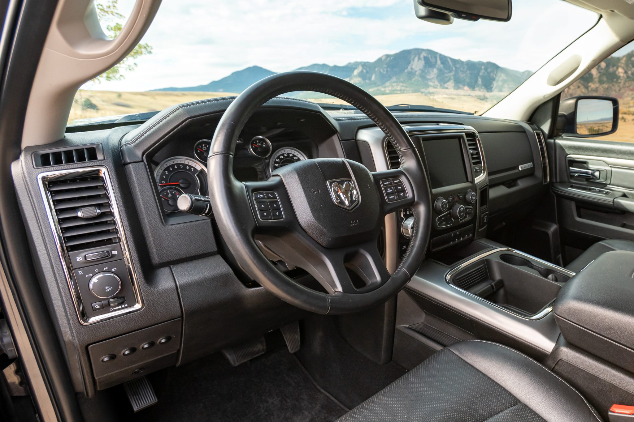 This 2018 Ram 1500 Sport is a Crew Cab 4×4 pickup The pre-runner-style conversion included the addition of a Procharger supercharger for the 5.7-liter Hemi V8, side-exit exhaust, wide-body fender flares, an aluminum skid plate, and KORE Tactical suspension with 14″ of travel and 3″ Fox internal-bypass shocks. The truck is finished in Granite Crystal Metallic over black perforated leather, and additional equipment includes an eight-speed automatic transmission, a dual-range transfer case, a limited-slip rear differential, the Convenience Group, heated and ventilated front seats, a heated steering wheel, a sliding rear window, a retractable tonneau cover, a receiver hitch, 18″ wheels, navigation, automatic climate control, and cruise control.