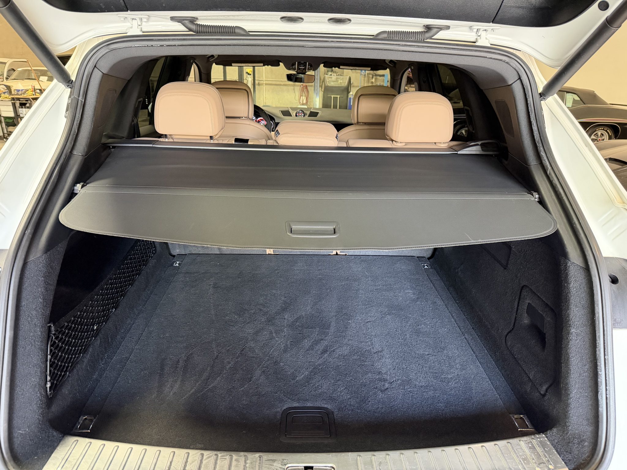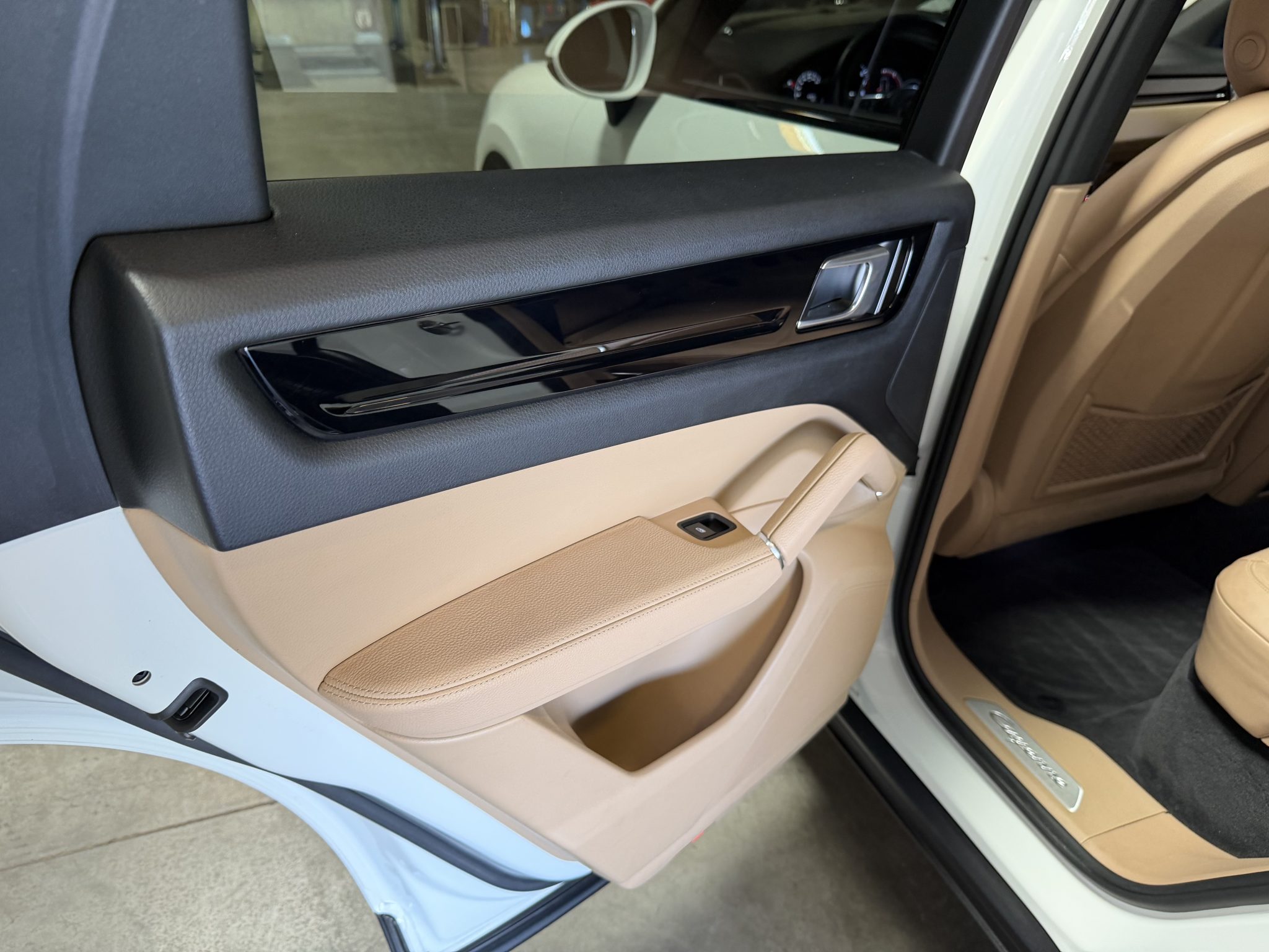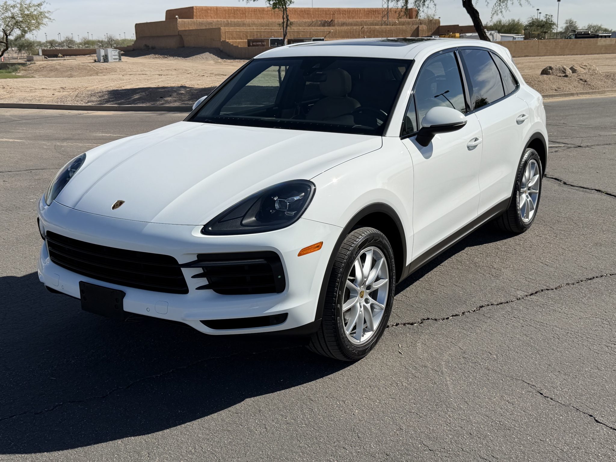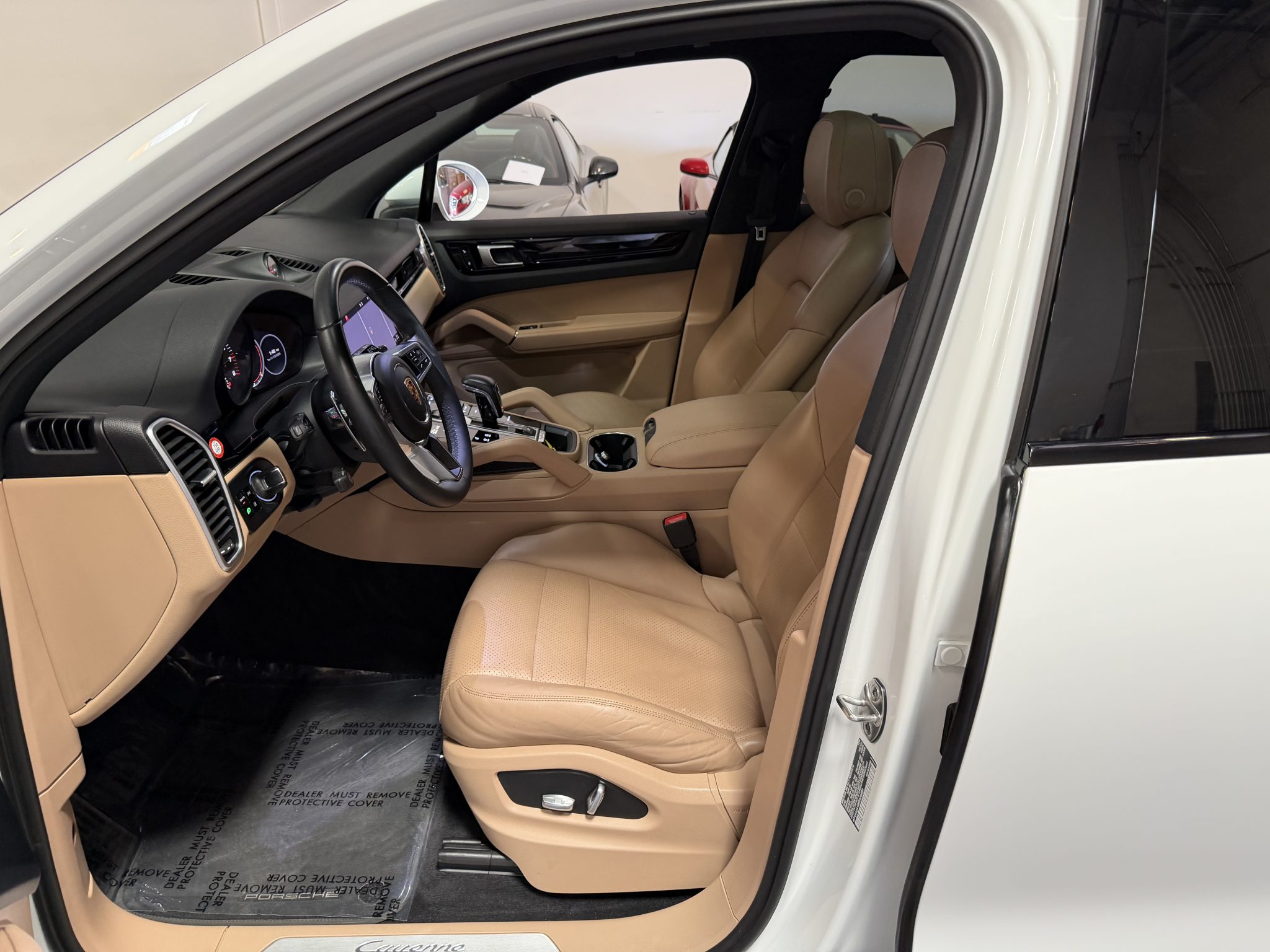 it was specified in White over a Black and Mojave Beige standard leather interior. The truck is powered by a turbocharged 3.0-liter V6 that drives all four wheels through an eight-speed automatic transmission, and equipment includes a panoramic sunroof, ParkAssist parking sensors, 20″ Cayenne Design alloy wheels, Power Steering Plus, heated front seats, Comfort Access, Lane Change Assist, a Porsche Sound Package Plus sound system, and touchscreen infotainment with navigation.