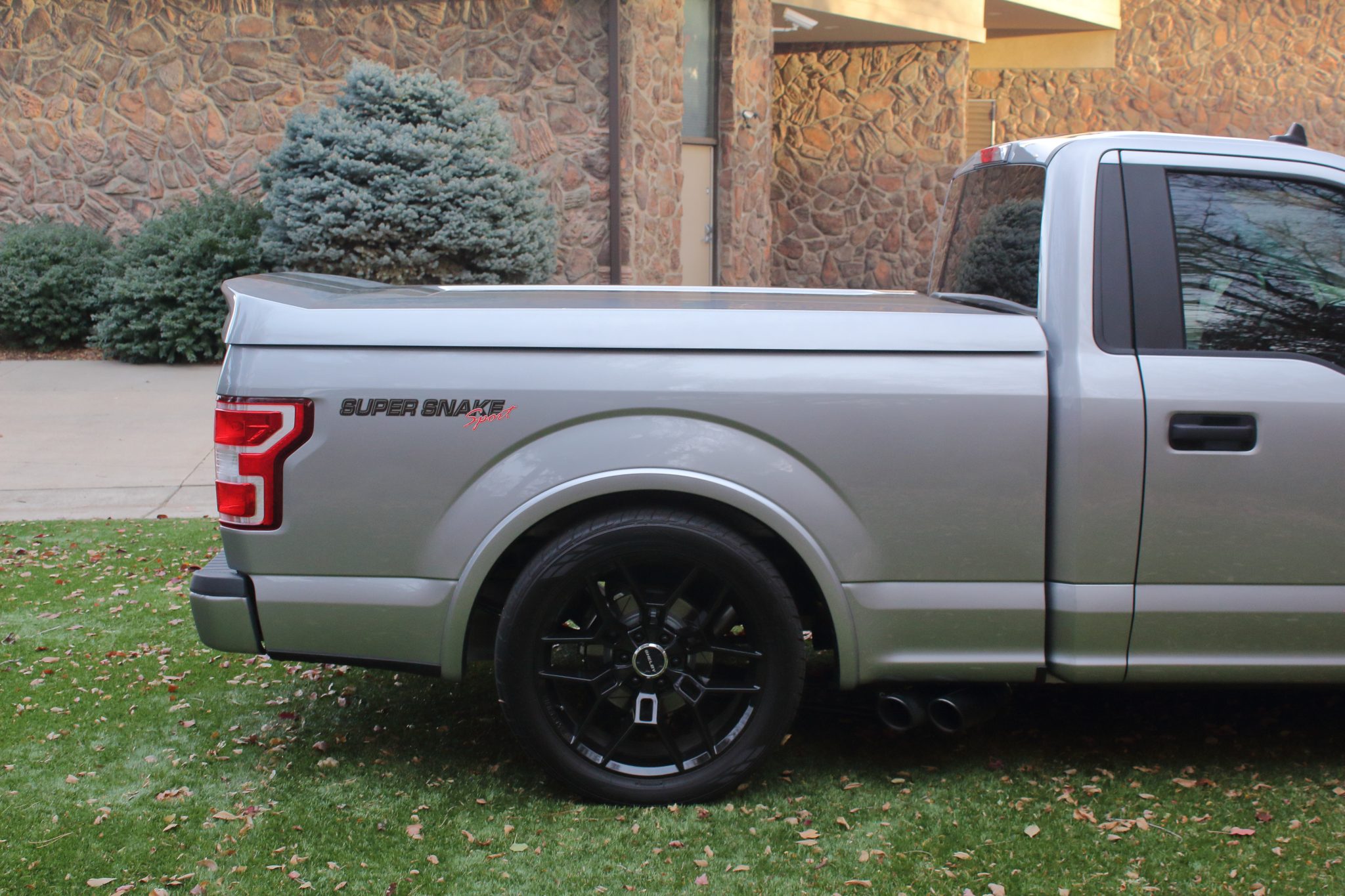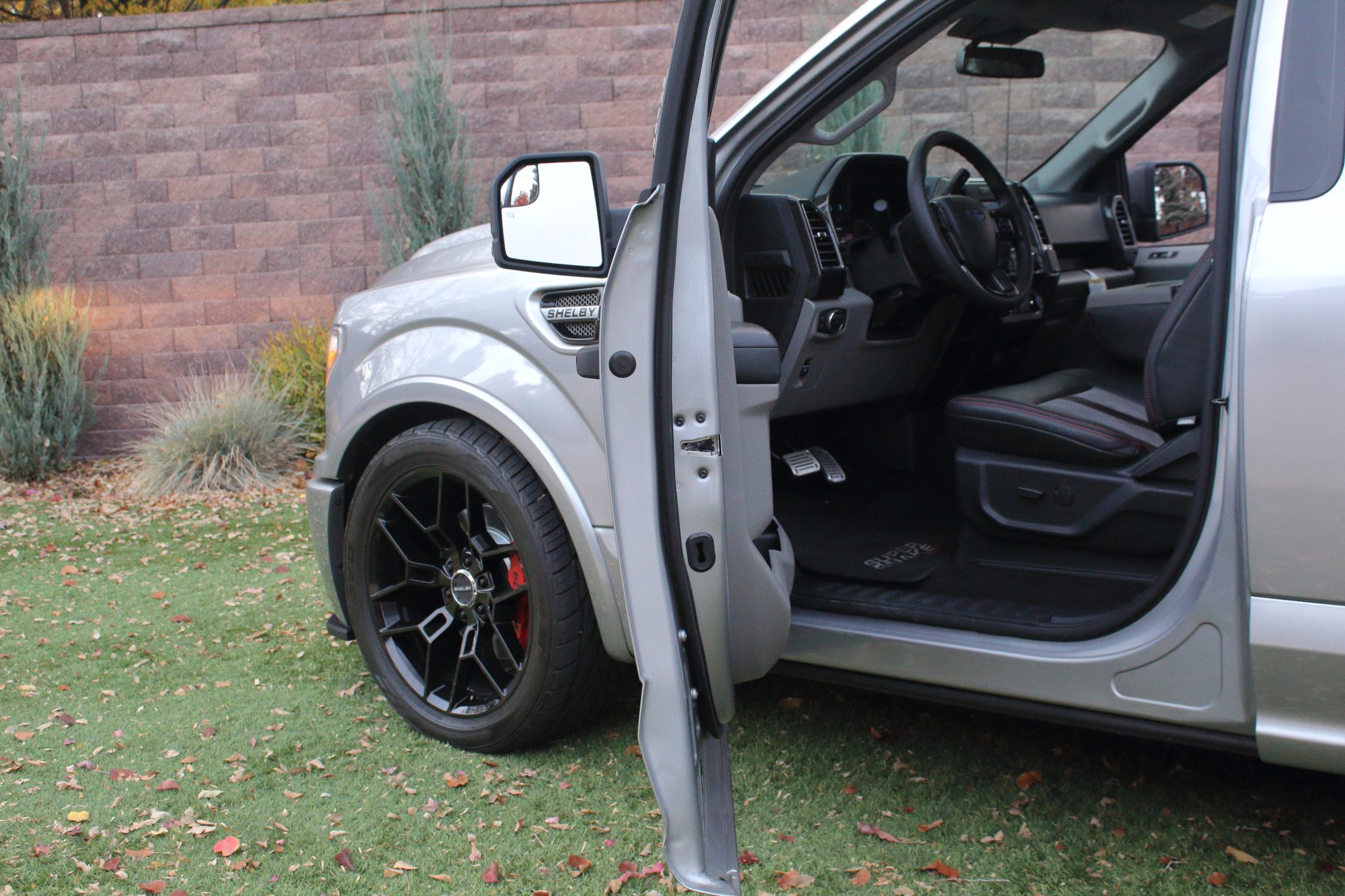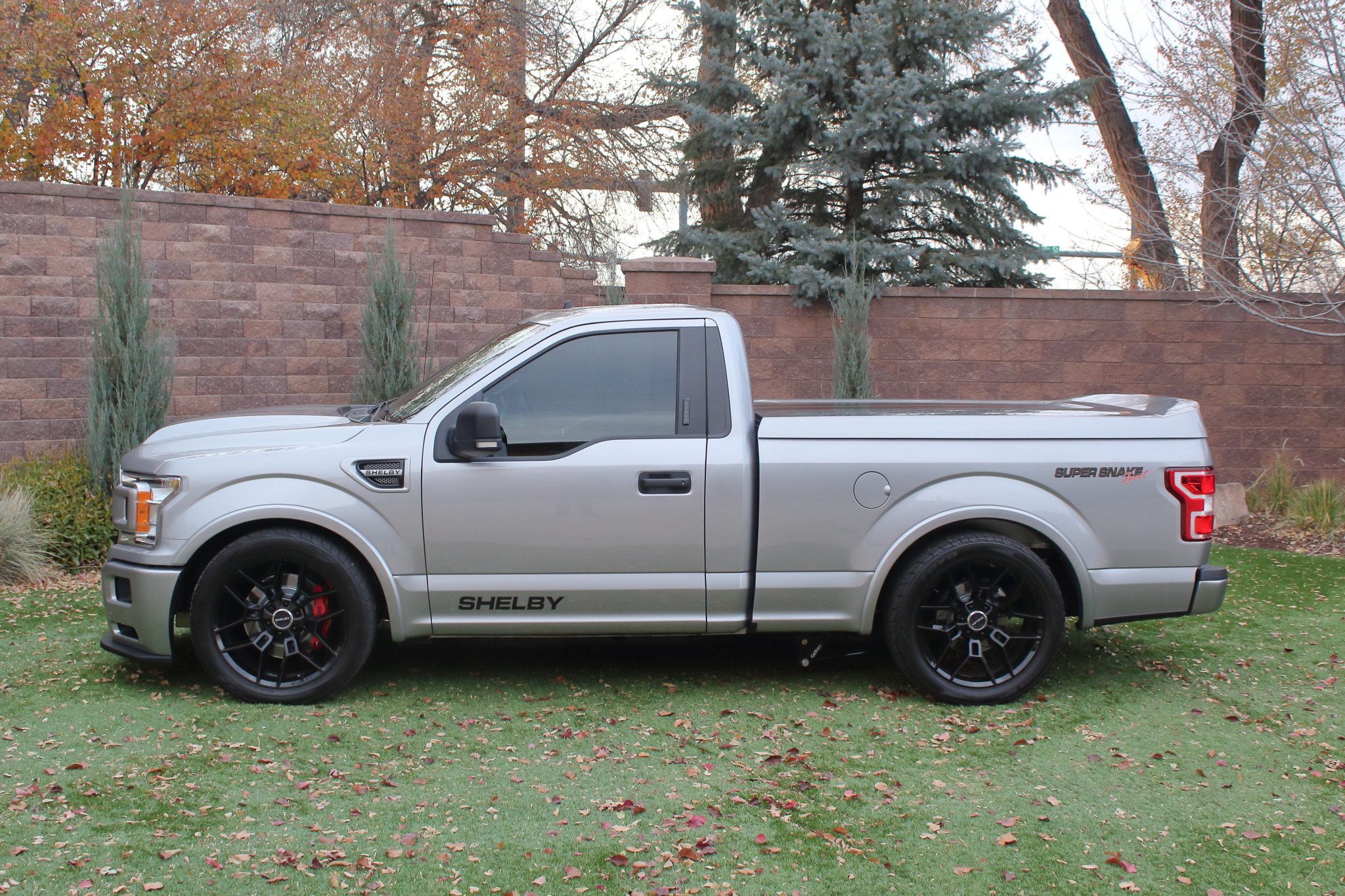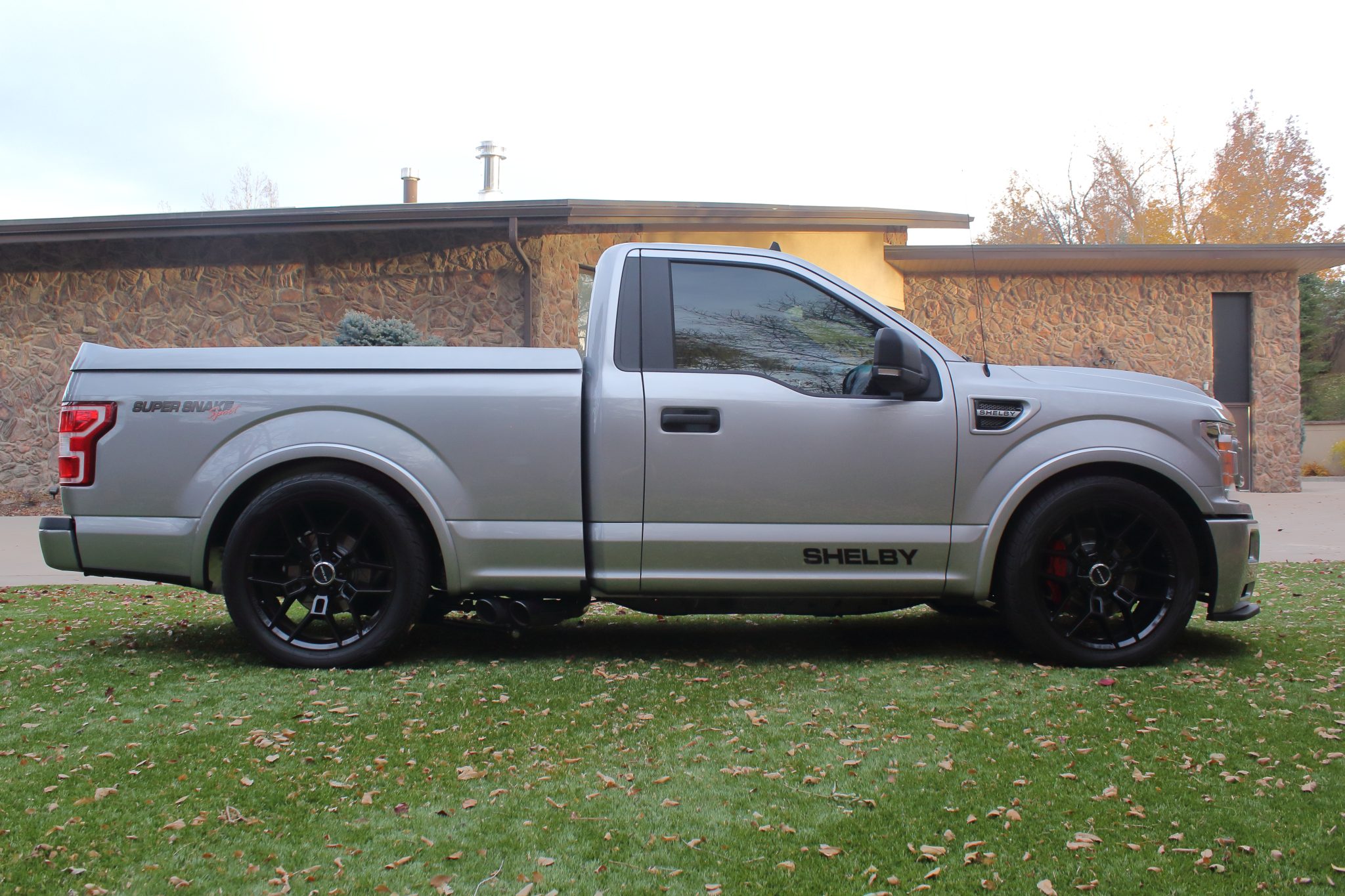 This 2020 Ford F-150 Shelby Super Snake Sport is a regular-cab pickup that is powered by a supercharged 5.0-liter Coyote V8 linked with a 10-speed automatic transmission, a dual-range transfer case, and an electronic locking rear differential. The truck is finished in Iconic Silver Metallic with black stripes with Shelby badging, a revised front fascia, and a tonneau bed cover with an integrated spoiler. Black-finished 22″ wheels are complemented by a Shelby-tuned suspension and a performance braking system, and a side-exit Shelby-tuned Borla exhaust system is also fitted. Black leather upholstery with red stitching covers the seats, and the interior features microfiber inserts for the outboard seats as well as carbon-fiber-look trim, a power-adjustable driver’s seat, touchscreen infotainment, voice-activated navigation, and remote start.