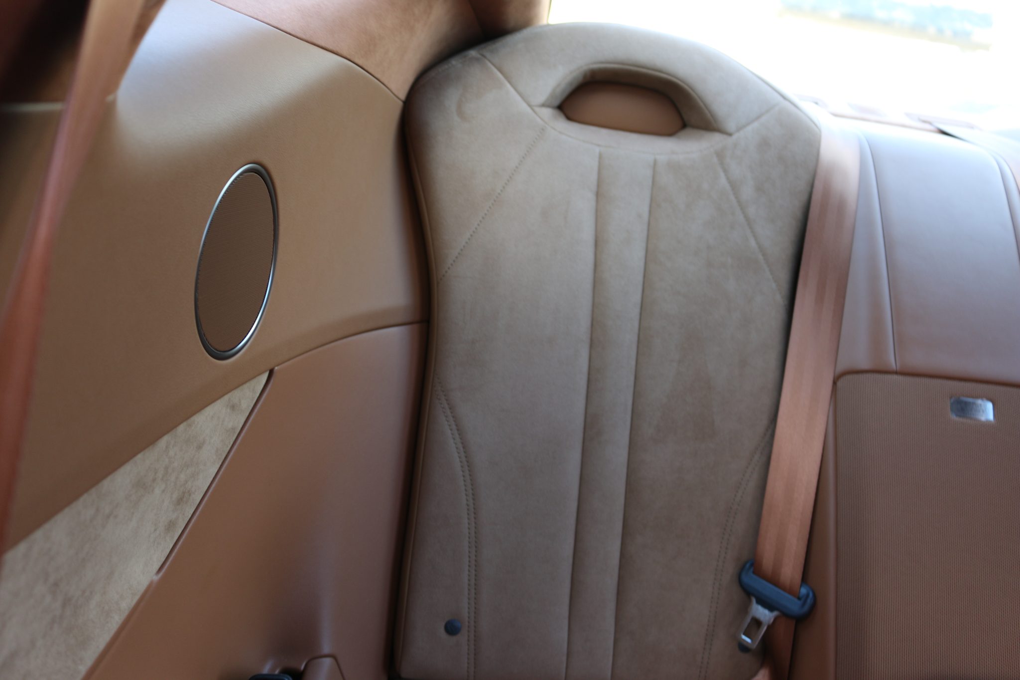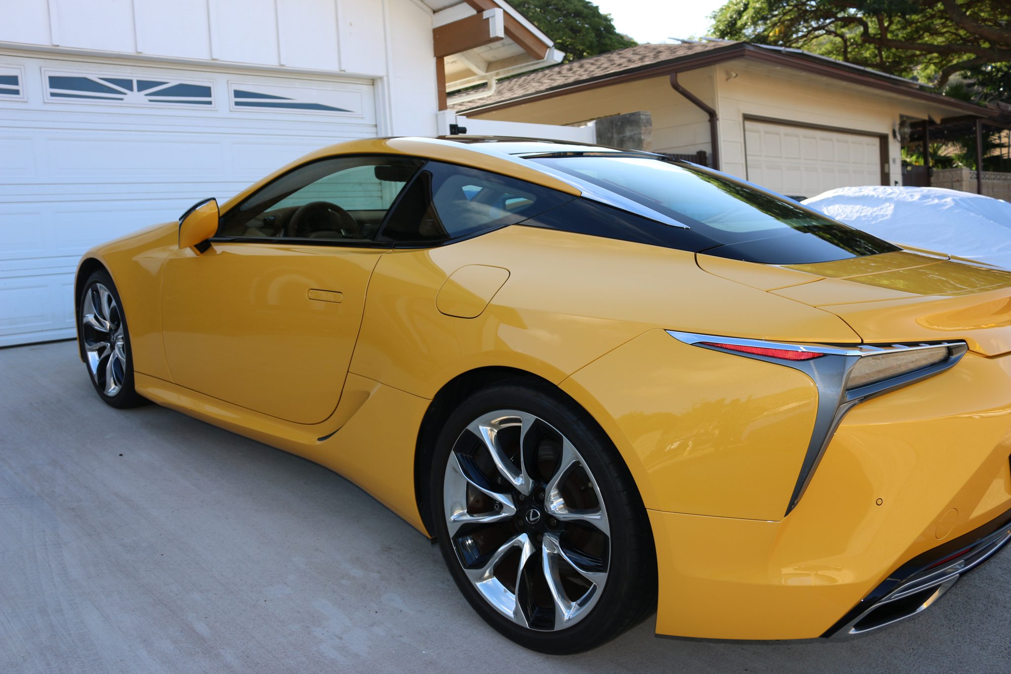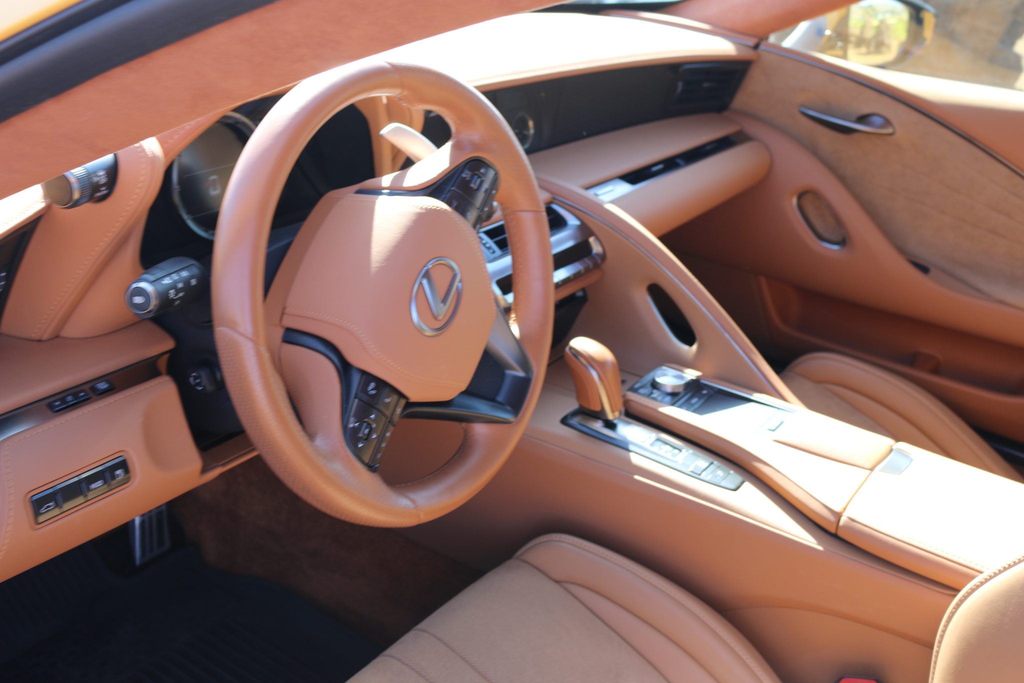 powered by a 5.0-liter 2UR-GSE V8 linked to a 10-speed automatic transmission and a Torsen limited-slip differential. It is finished in Flare Yellow over Toasted Caramel leather and Alcantara and is equipped with the Performance and Sport packages as well as a carbon-fiber roof, triple-beam LED headlights, a retractable rear spoiler, an Adaptive Variable Suspension, active rear-axle steering, polished and black-accented 21″ alloy wheels, heated and ventilated power-adjustable front seats, a head-up display, a touchpad infotainment system with navigation, a Mark Levinson sound system, Apple CarPlay connectivity, a backup camera, dynamic radar cruise control, and automatic climate control.